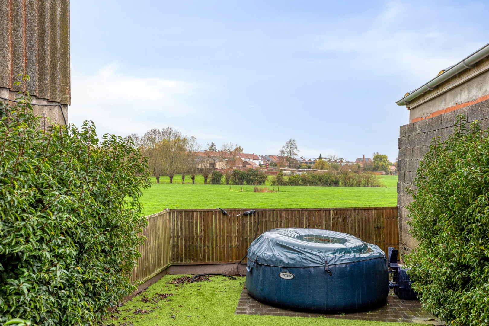 Vanuit de keuken is er toegang tot het terras met tuin. Er is ook een tuinhuis. Het is hier heerlijk rustig genieten in het zonnetje. De tuin is heel onderhoudsvriendelijk en heeft langs de achterkant een fantastisch zicht op de achtergelegen weides.