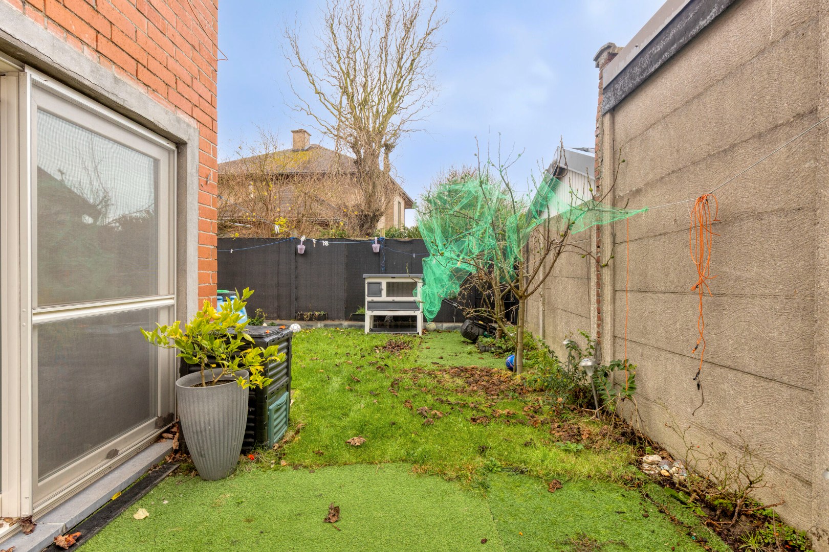 Via de keuken kunnen we naar de tuin. Deze is ook toegankelijk via een pad achteraan de tuin. Alsook via de grote garage, wat meteen een grote troef is! Ruimte genoeg voor 2 wagens of een doe-het-zelver...