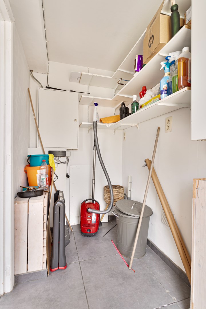 Aanpalend vinden we de badkamer terug. Er is hier een toilet, lavabomeubel en bad-/douchecombinatie. De keuken bevindt zich achteraan en is gescheiden van de leefruimte door een volte en de trap naar boven. Op de volte kan bijvoorbeeld een buro of een gezellige leeshoek worden gemaakt. De keuken heeft zicht op de grote en zonrijke, zuidgerichte tuin. Tijdens het koken, kan u hier genieten van de groene rust. Naast de keuken ligt een handige berging waar plaats is voor een wasmachine en droogkast. Boven zijn er 2 ruime slaapkamers en een toilet.