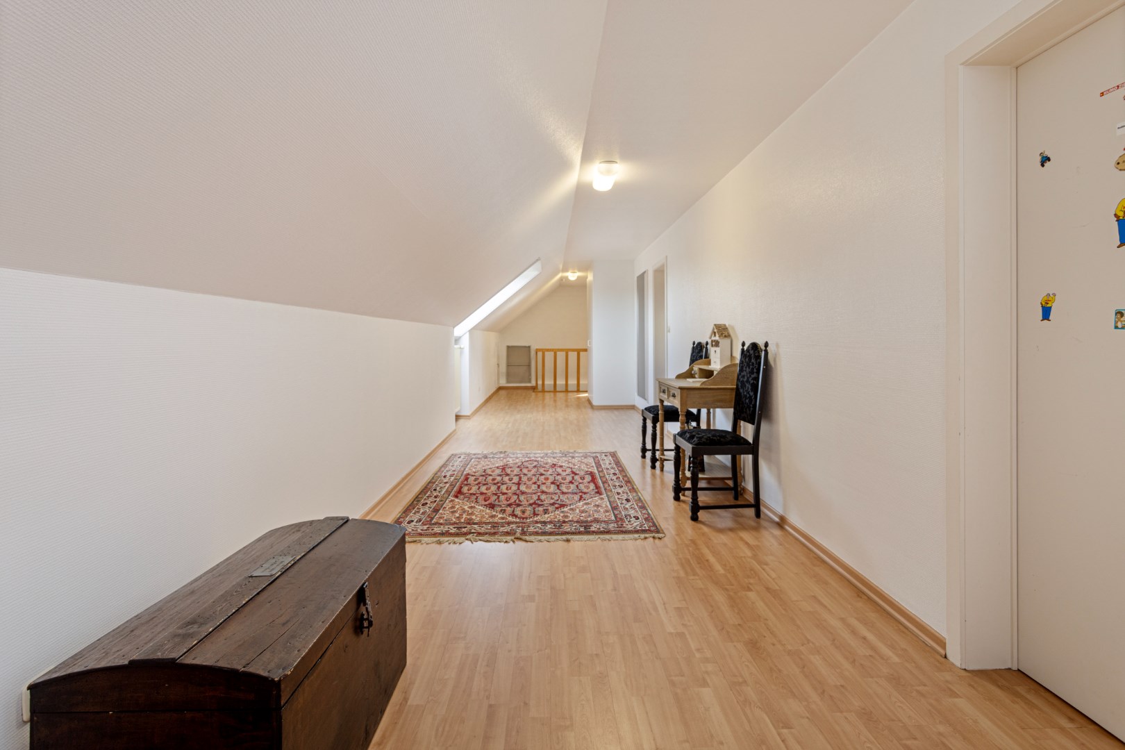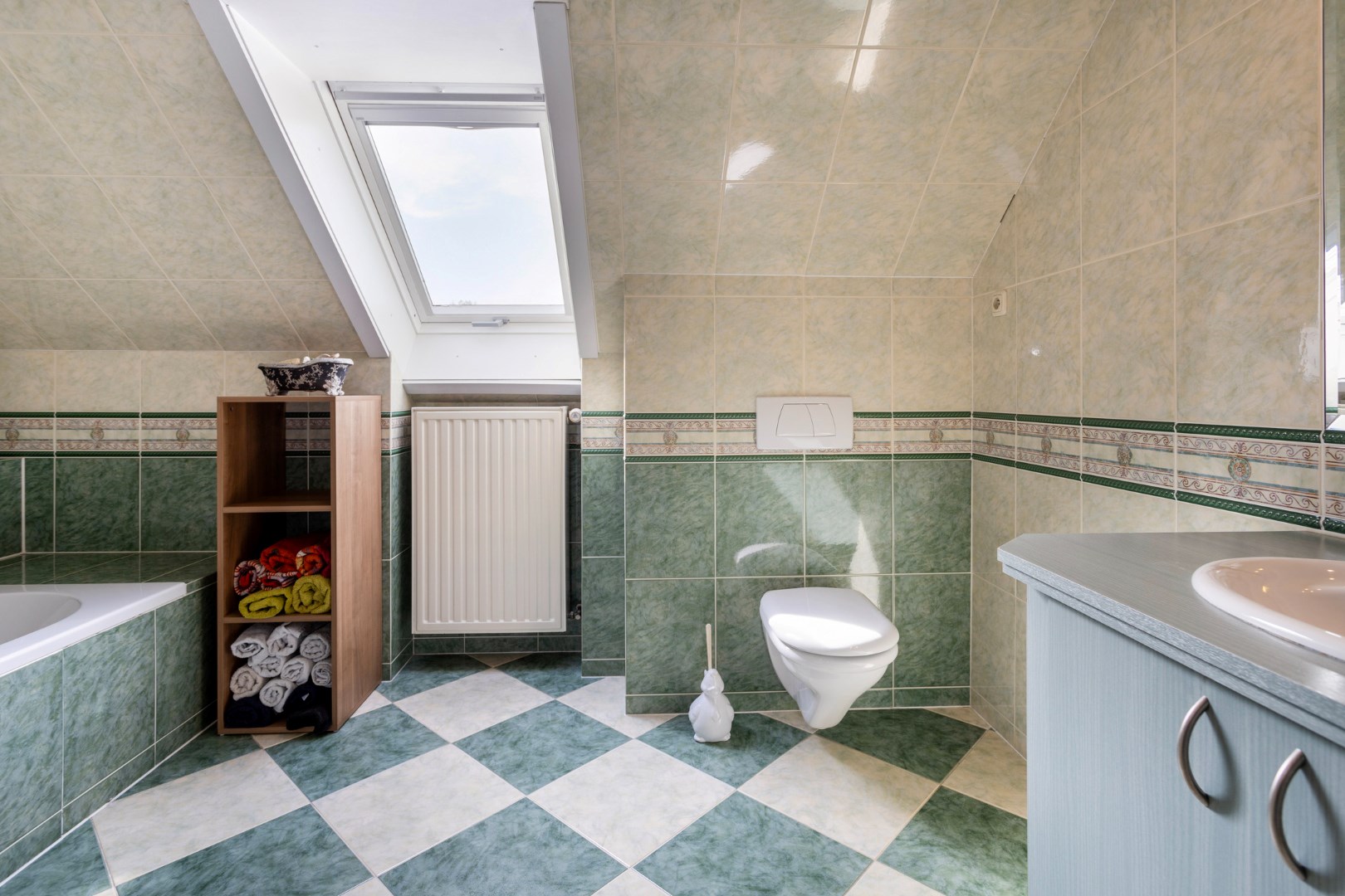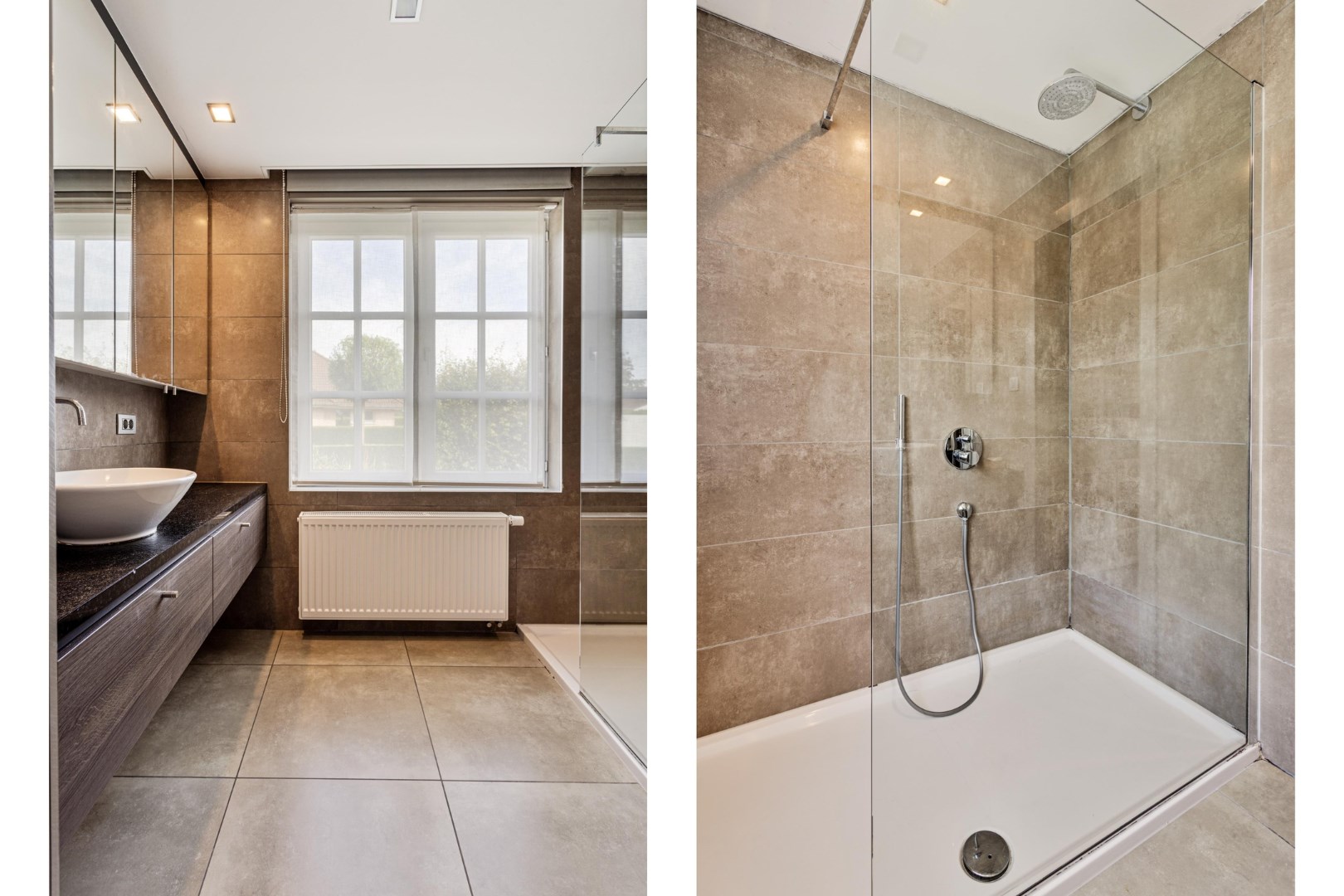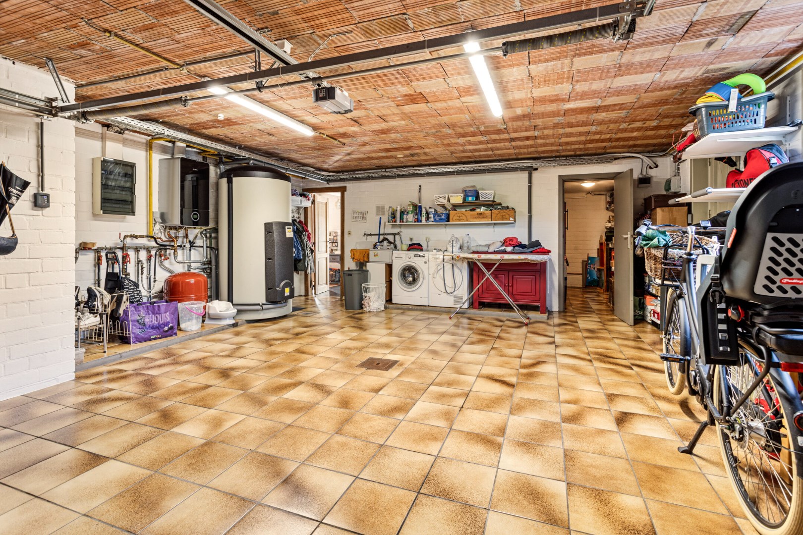 Op de gelijkvloerse verdieping is er verder nog een grote garage met aansluitend een koele berging. In de hal die ons naar de bovenverdieping brengt vinden we nog een toilet terug. Er is hier ook nog een eerste badkamer met lavabo en inloopdouche.