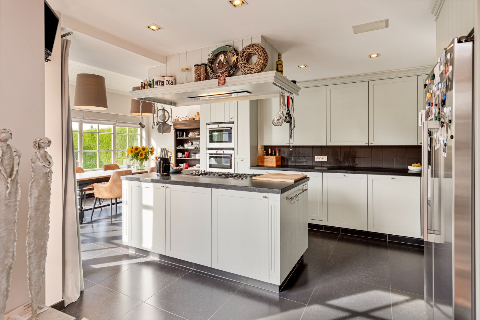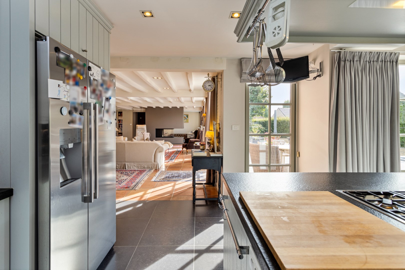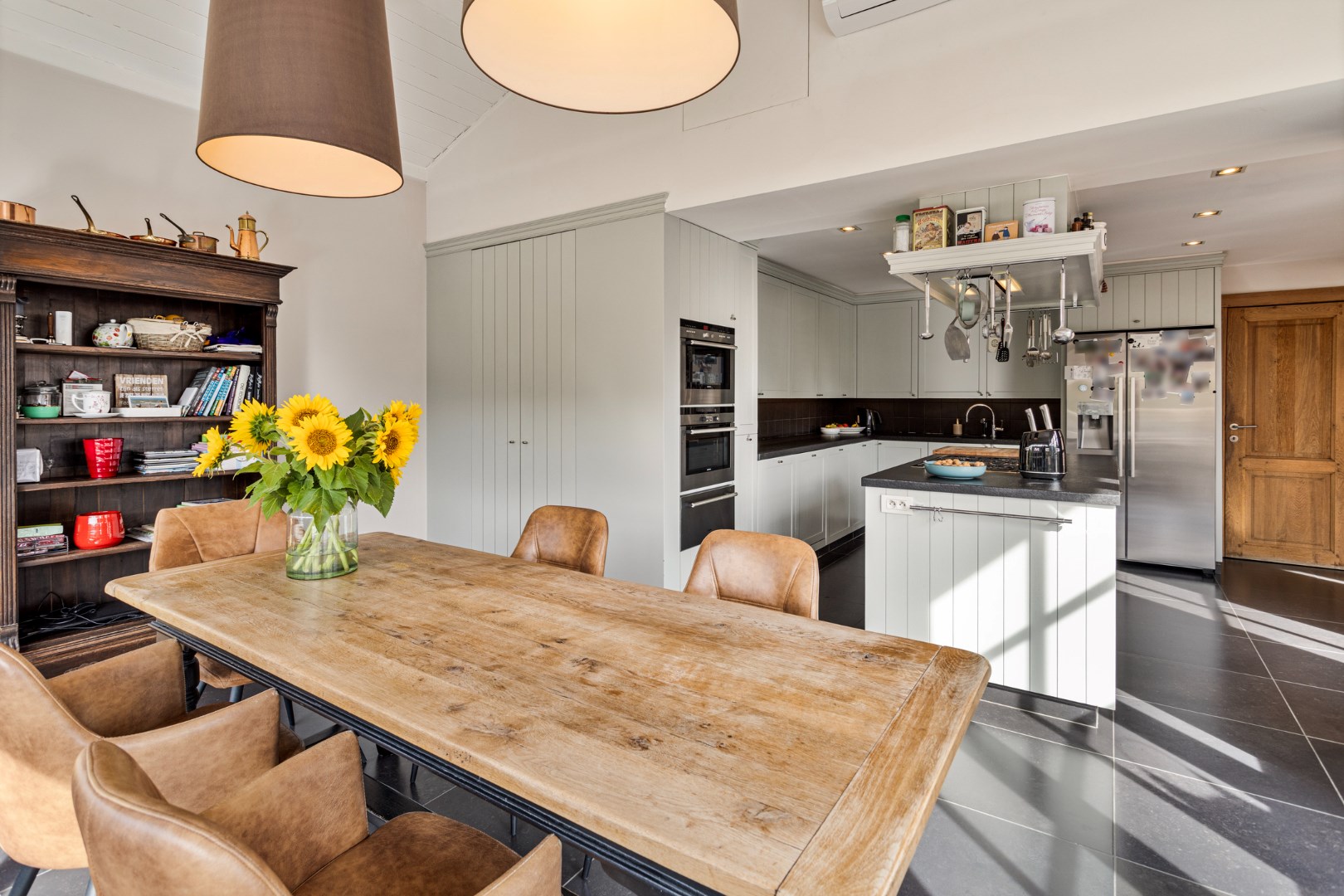 Palend aan het salon is er ook de mooie keuken. Deze werd in 2007 uitgebouwd en beschikt over een plafond tot in de nok. De uiterst aangename maatkeuken maakt het geheel af. Koffie nippen doen we in de eethoek. De vele raampartijen geven ook overal een schitterend zicht op de mooie tuin met zwemvijver.