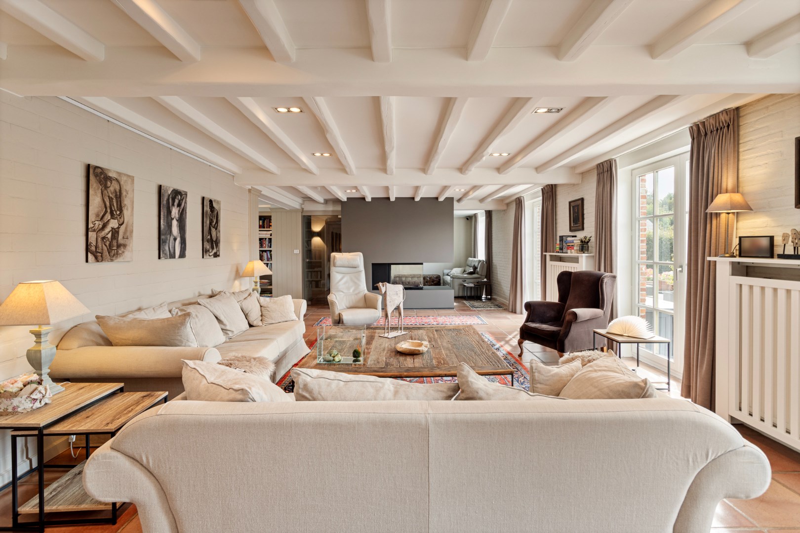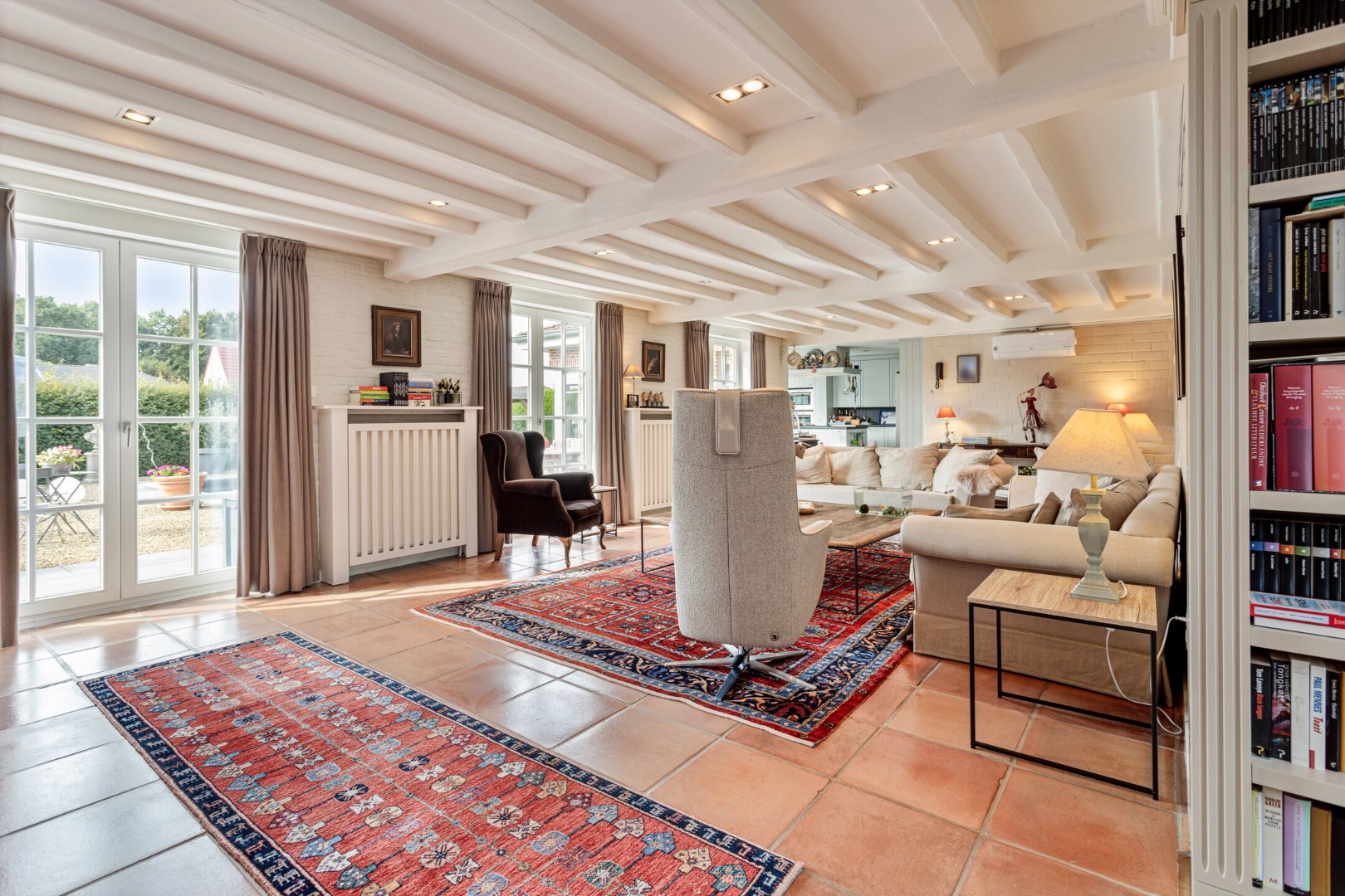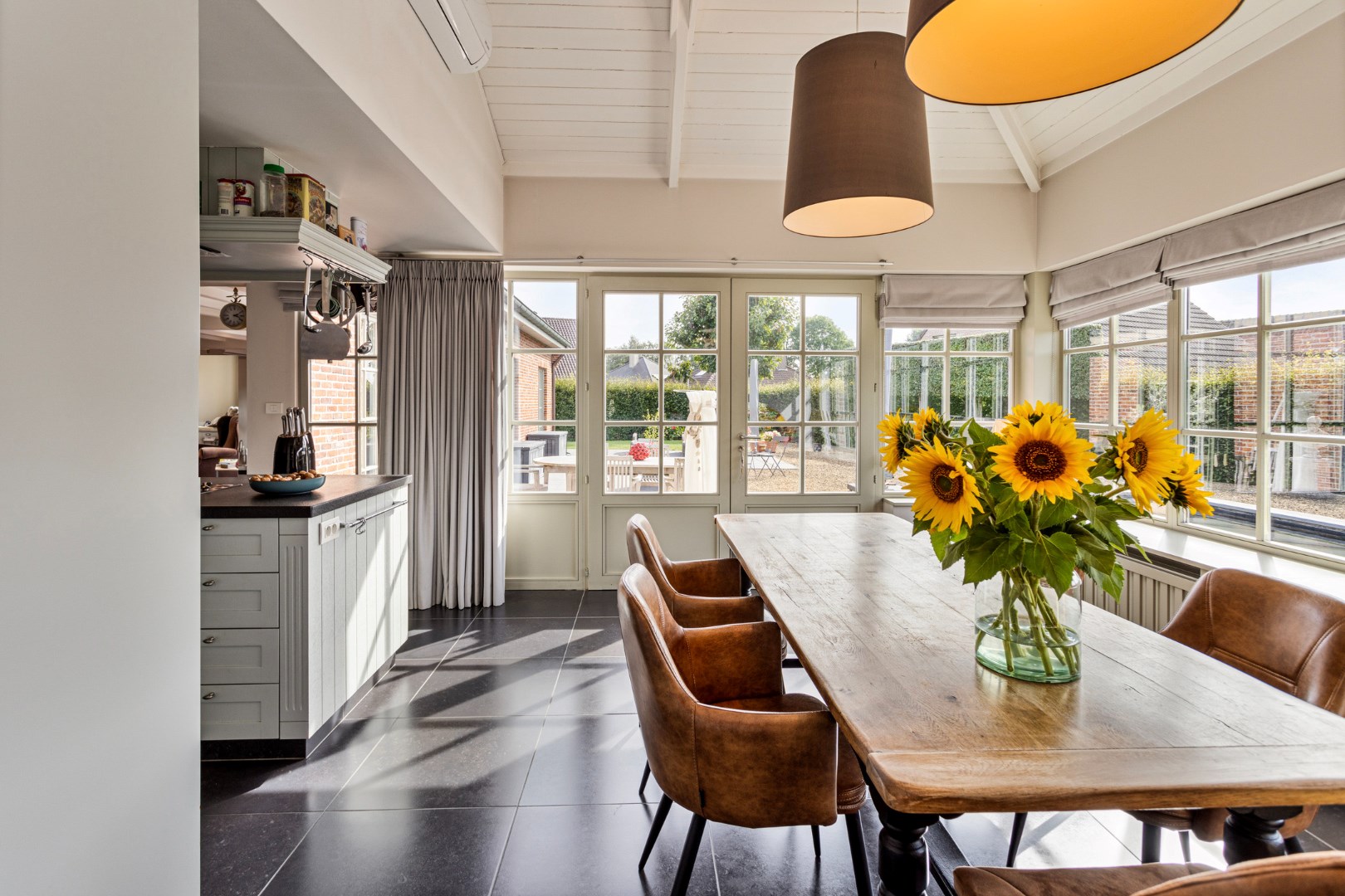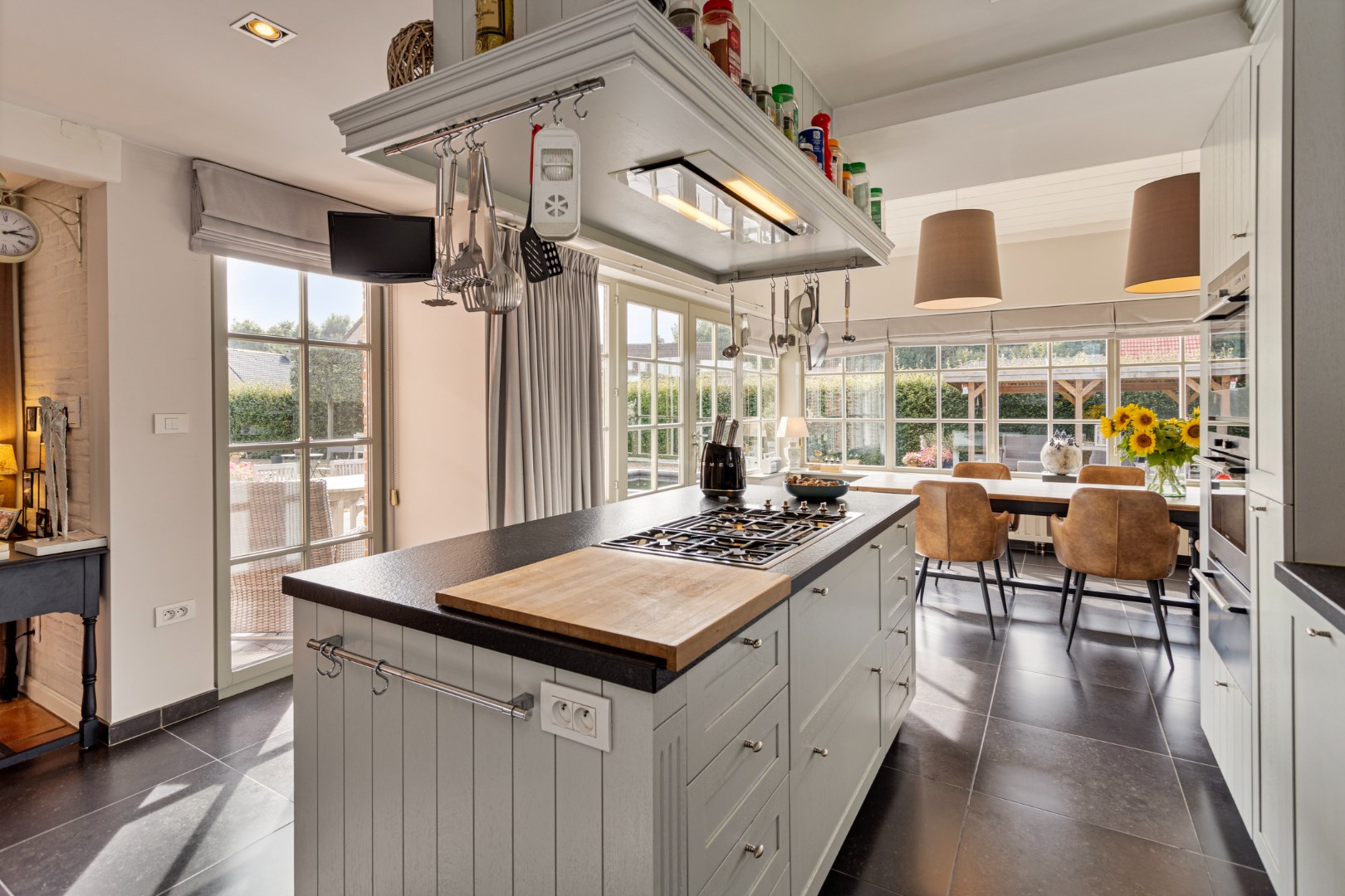 Palend aan het salon is er ook de mooie keuken. Deze werd in 2007 uitgebouwd en beschikt over een plafond tot in de nok. De uiterst aangename maatkeuken maakt het geheel af. Koffie nippen doen we in de eethoek. De vele raampartijen geven ook overal een schitterend zicht op de mooie tuin met zwemvijver.