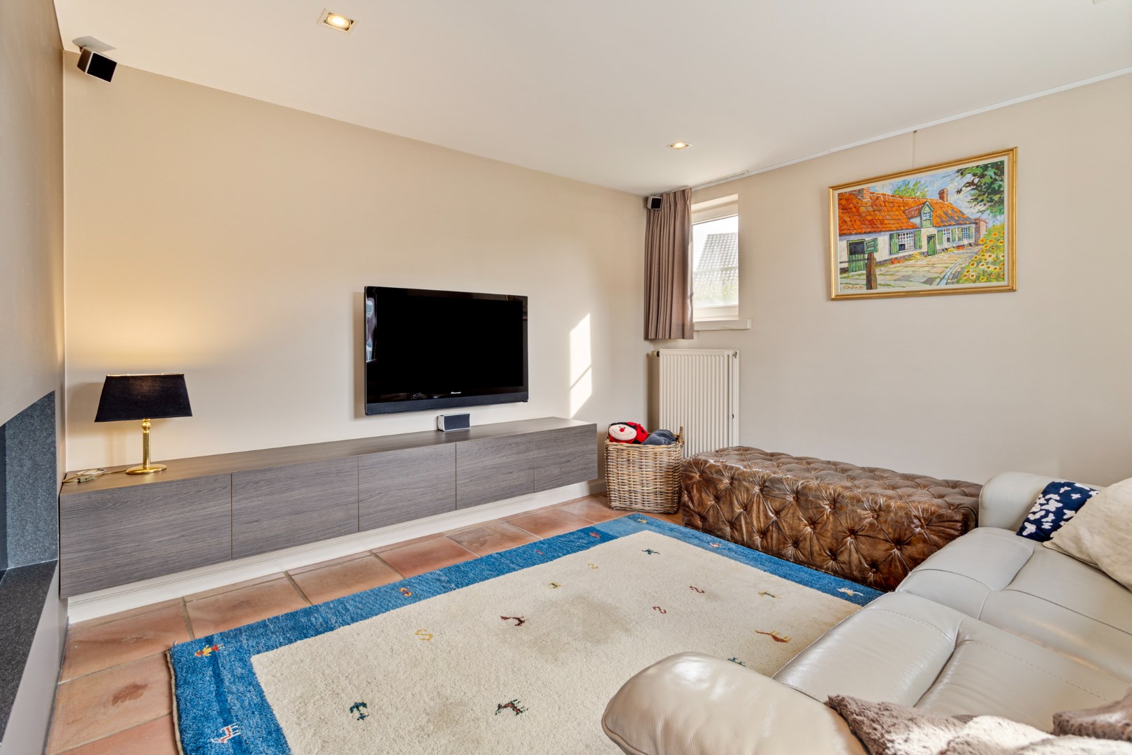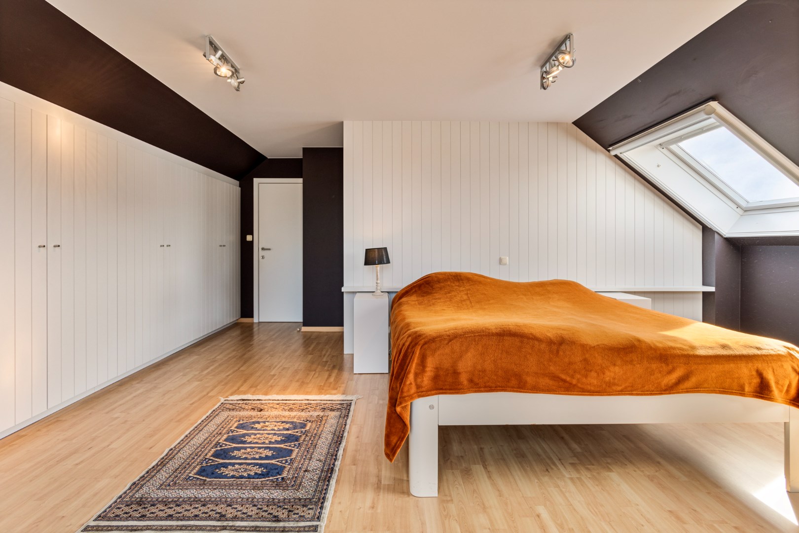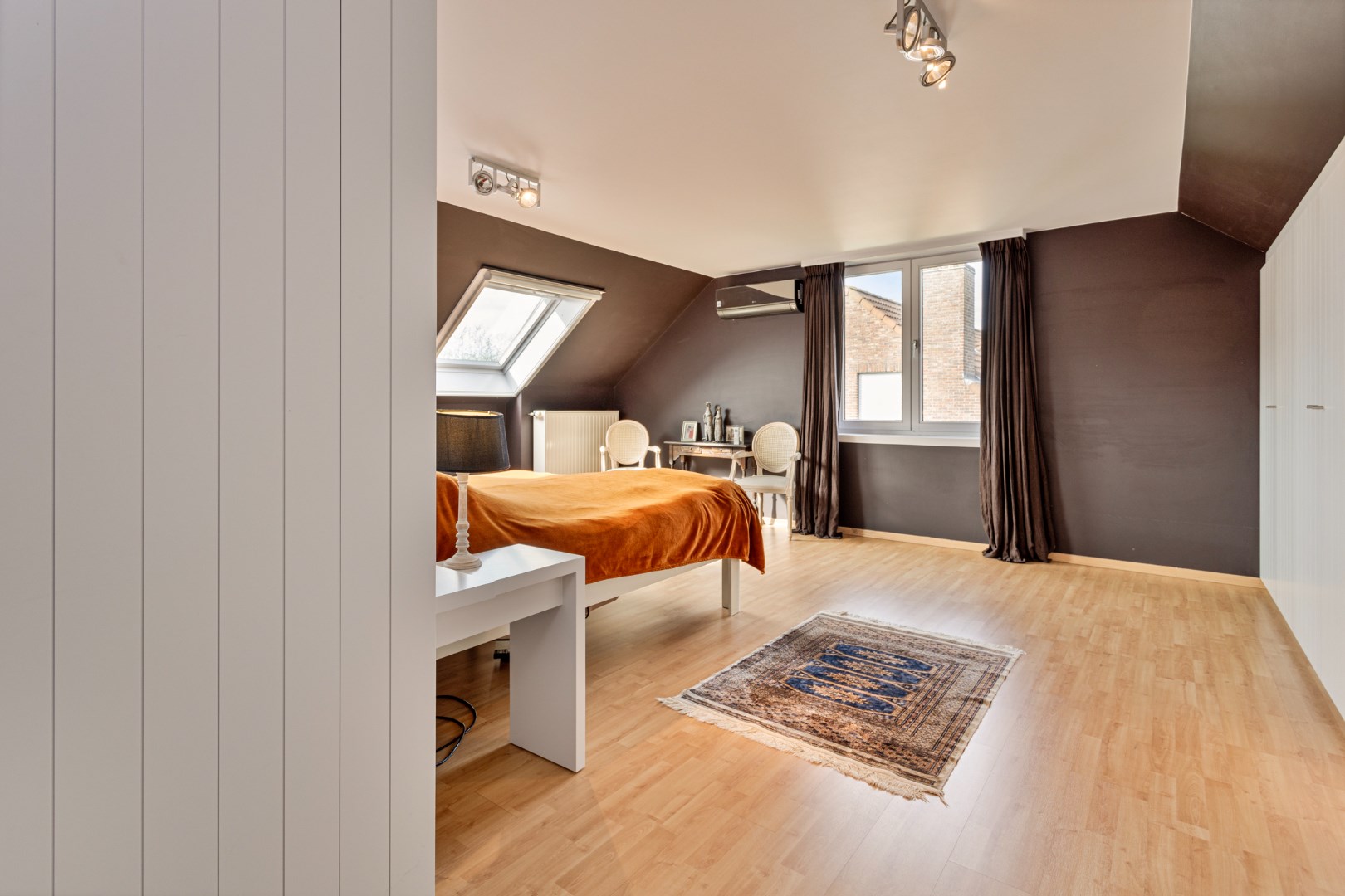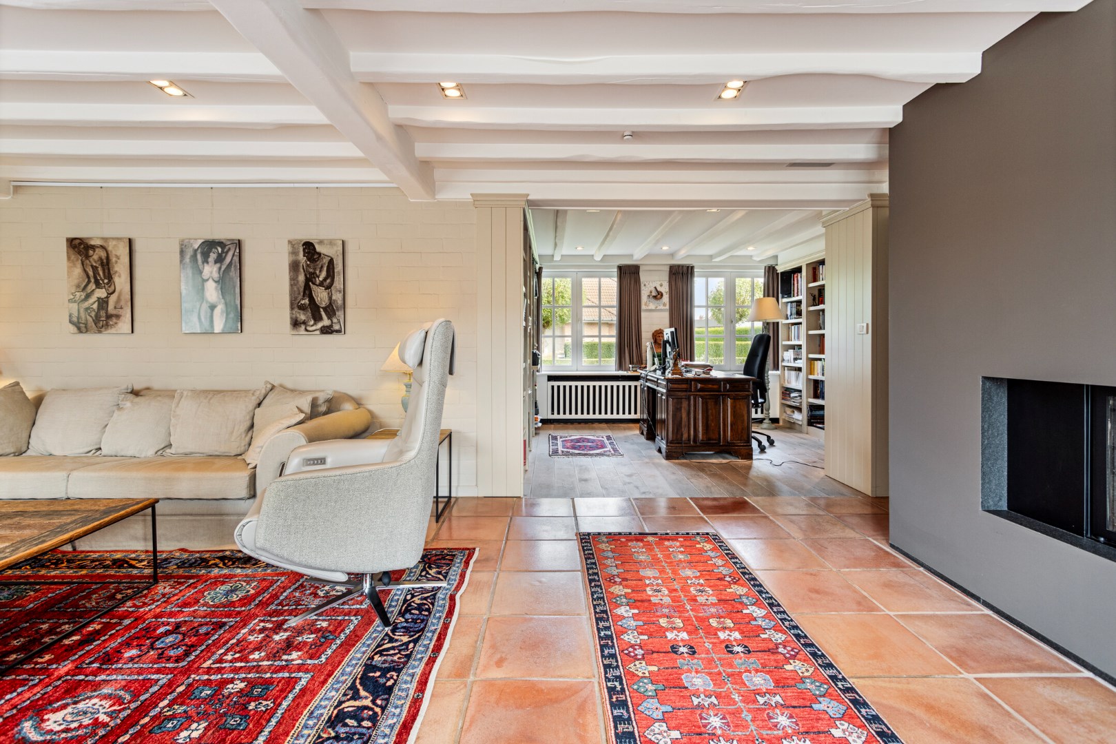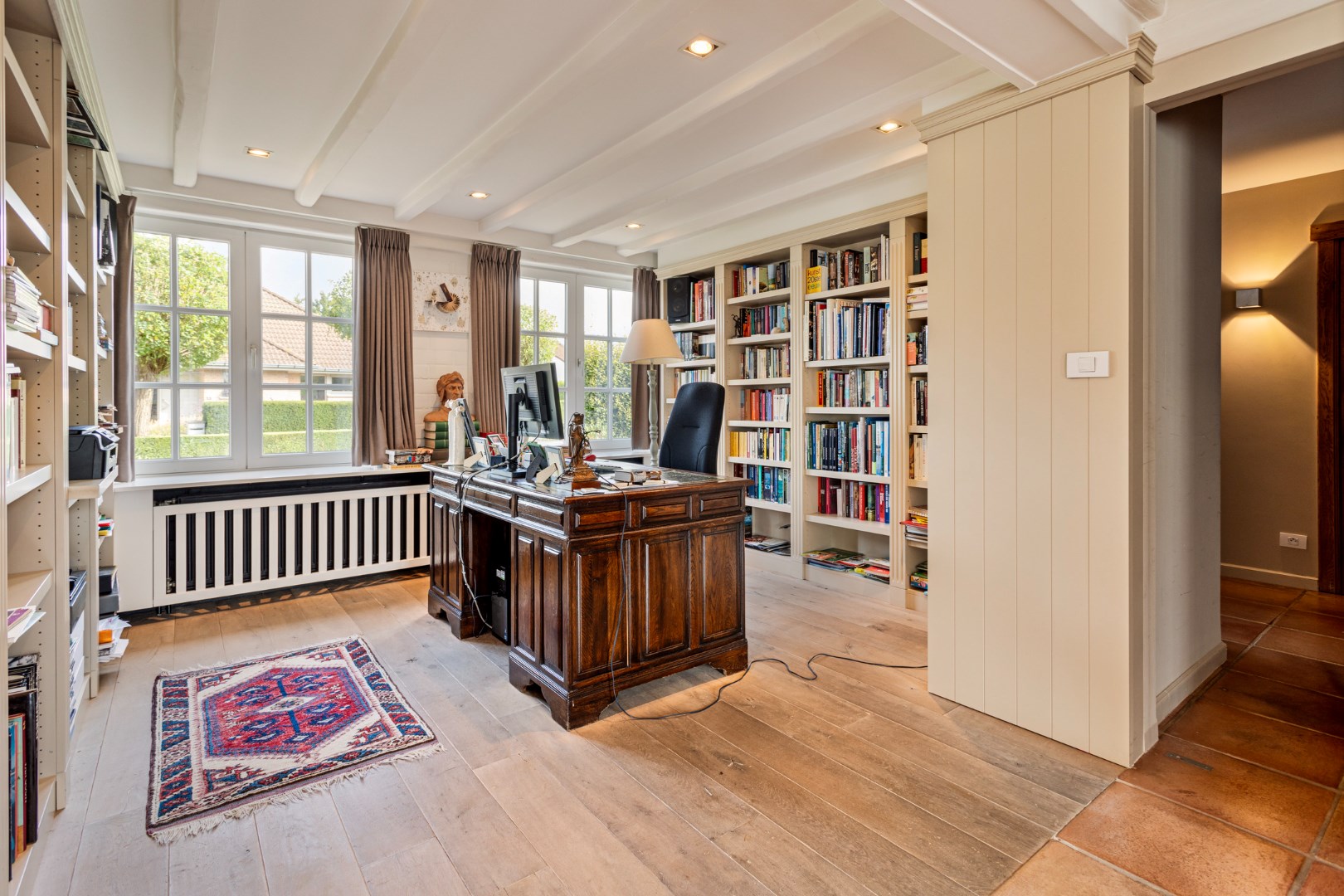 In een residentiële buurt ligt deze mooie eigendom. Langs de voortuin komen we binnen in de hal met gastentoilet. Van hieruit hebben we ook toegang tot een eerste kamer die bijvoorbeeld dienst kan doen als gelijkvloerse slaapkamer of buro. Door de mooie, dubbele deur stappen we vervolgens de living binnen. Deze is heel lichtrijk, aangenaam en klassevol. Deze leefruimte beschikt over een groot salon dat door een haard wordt gescheiden van een aparte TV-hoek. Er is ook rechtstreeks contact met het mooie buro langs de voorzijde. Mede door het parket en de maatkasten is het een droom om hier te werken.