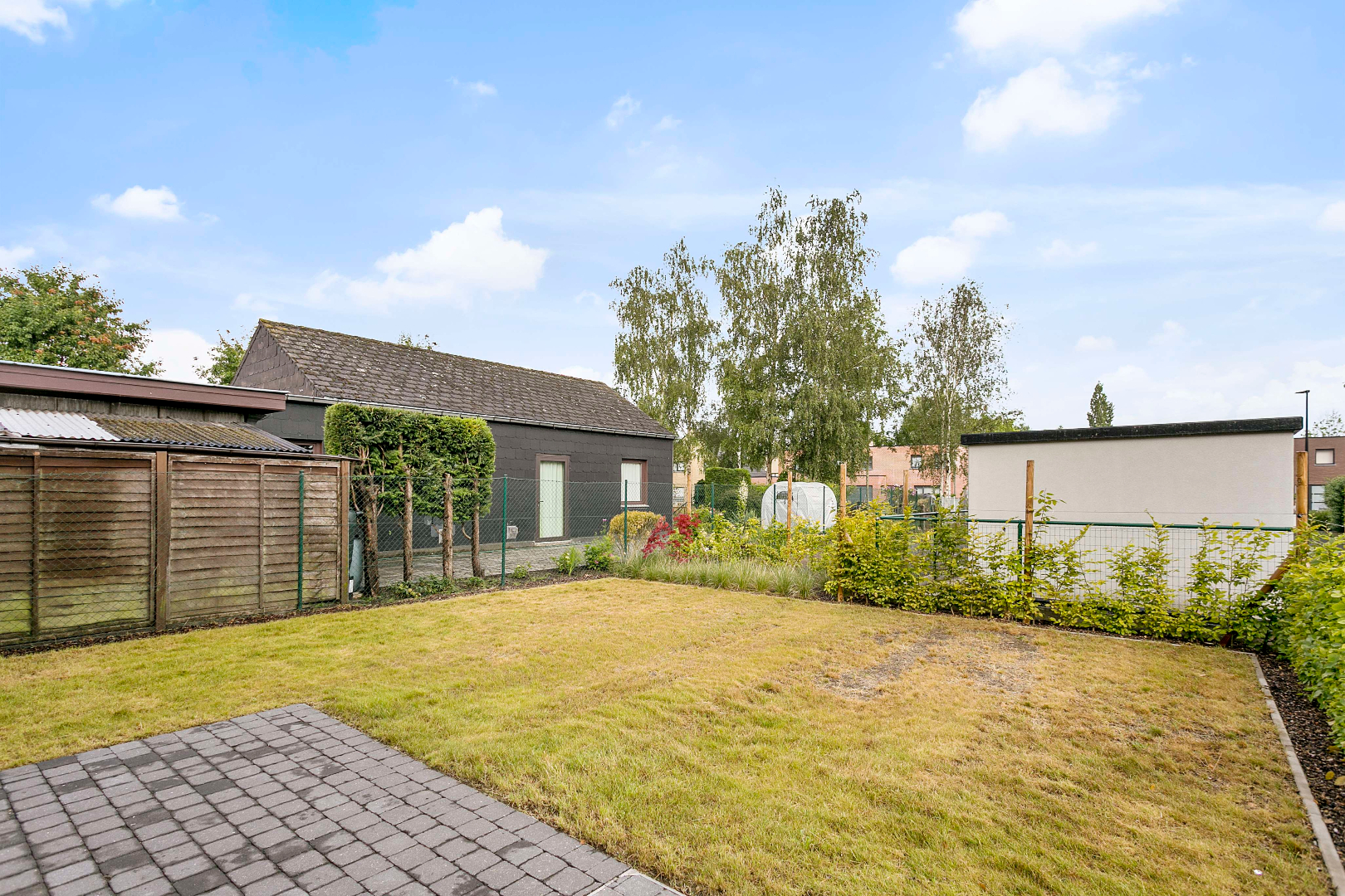Via het grote schuifraam in de keuken kunnen we naar de tuin die eenvoudig maar mooi is aangelegd.