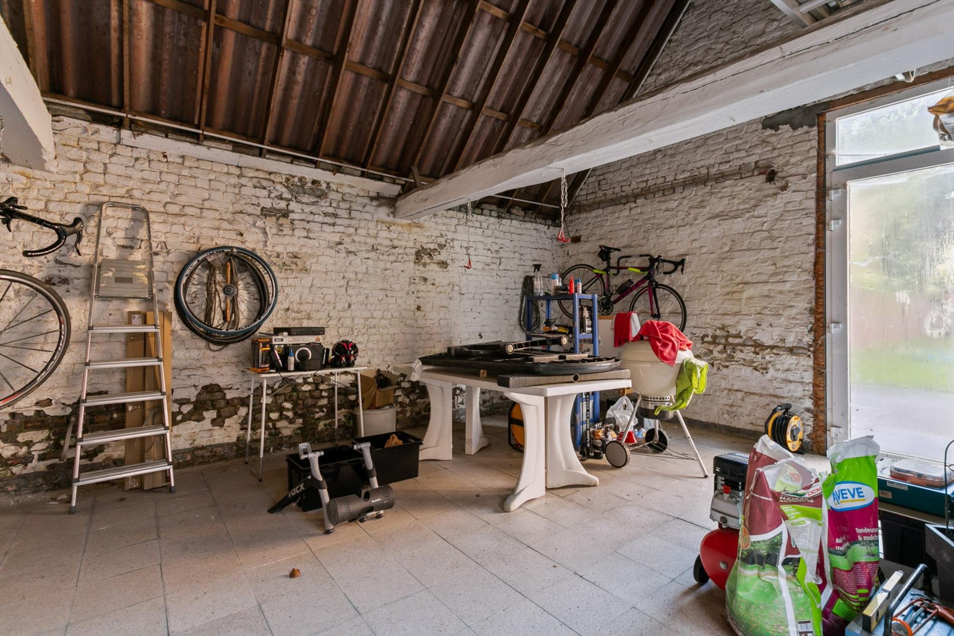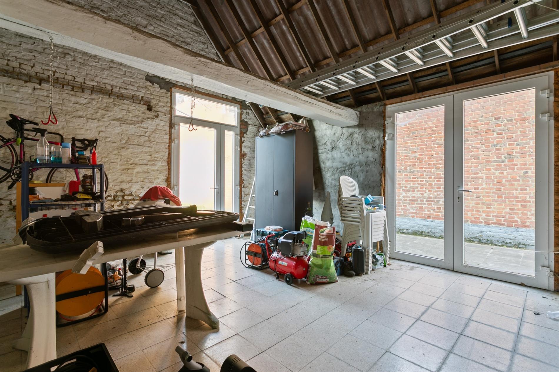 Achter de woning, en via de garage bereikbaar, bevindt zich een werkplaats van 40 m2 die dienst kan doen als atelier, hobbyruimte, .... Deze werkplaats beschikt over 2 ingangen en geeft uit op de diepe tuin.
