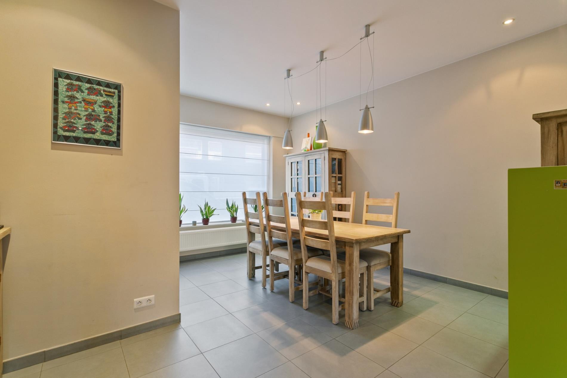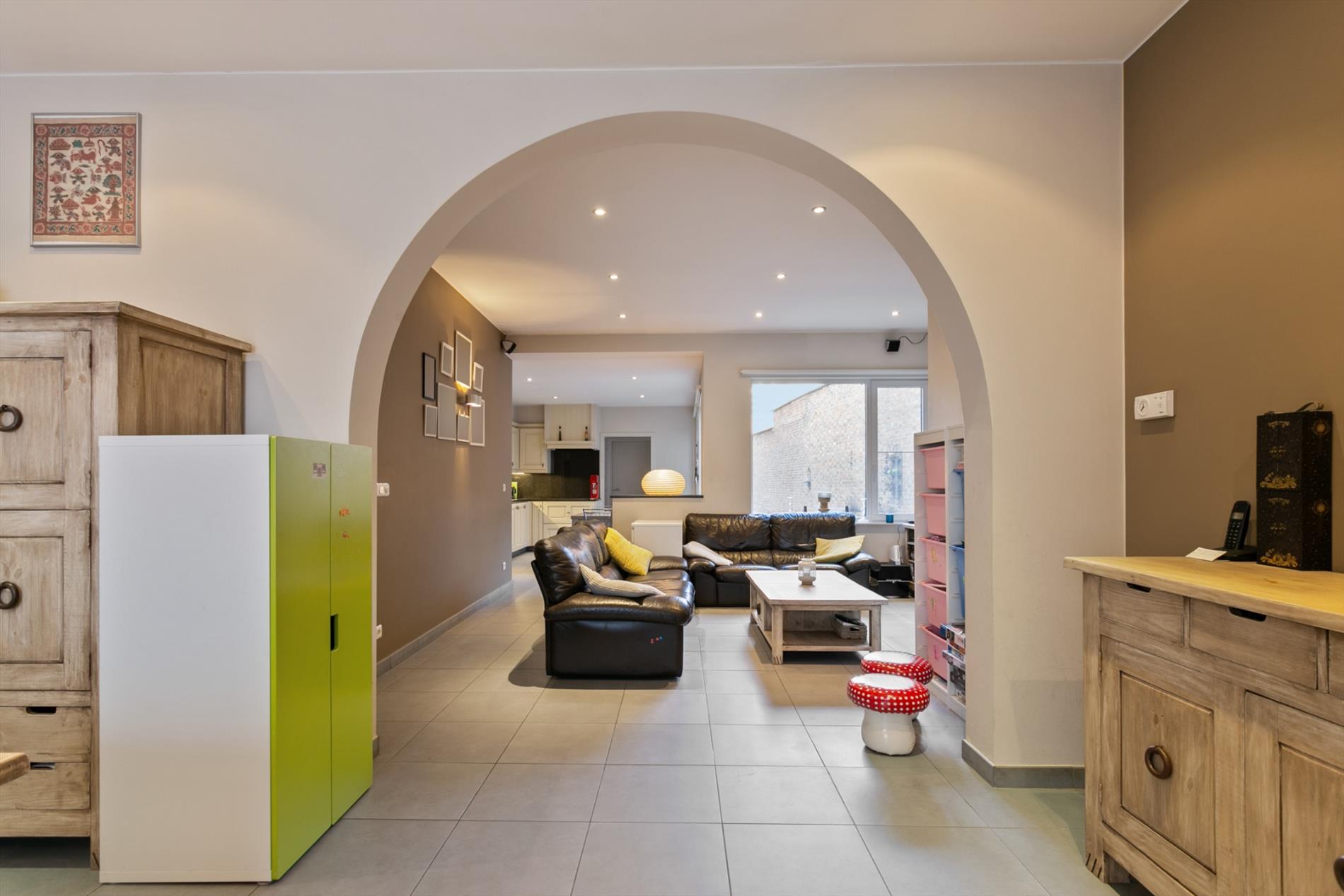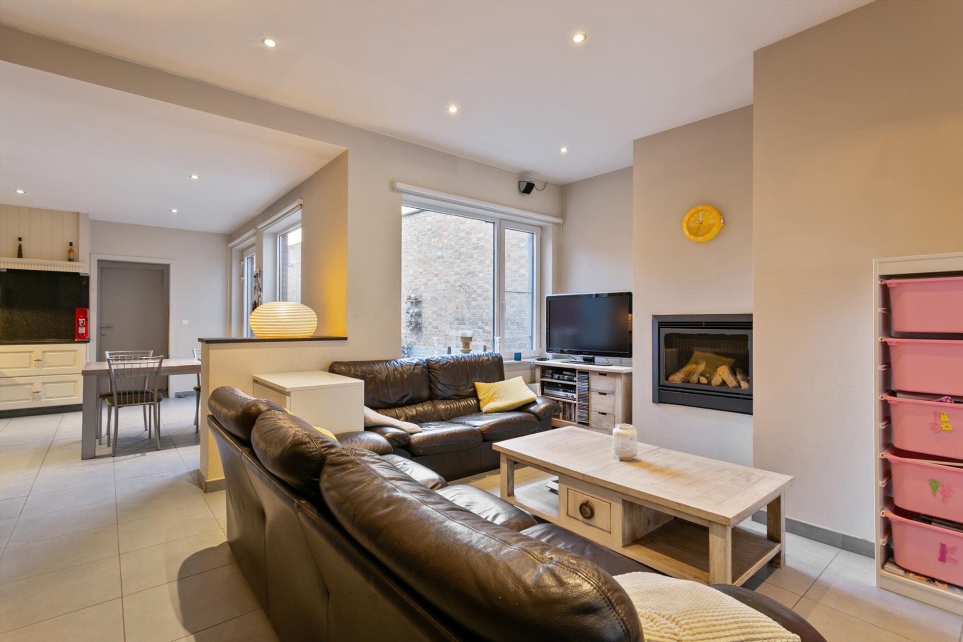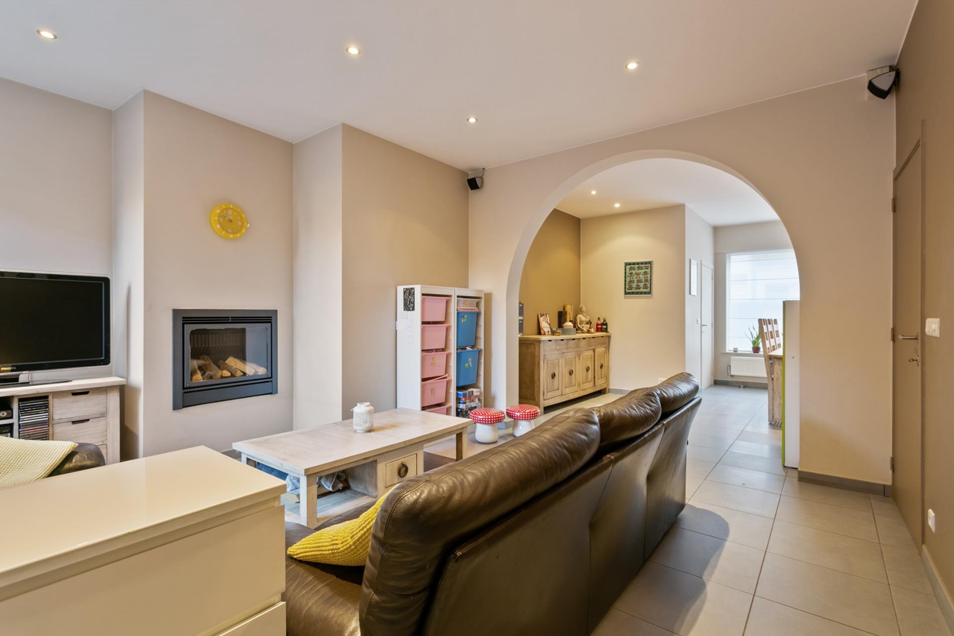 Achter de mooie gevel schuilt dit gezellig eigendom. We komen binnen langs de hal met vestiaire. De living is ruim en gezellig ingericht mede dankzij de gascassette en boog tussen voor- en middenplek. De woonkamer gaat naadloos over in de open keuken met ontbijthoek. Achter deze keuken bevindt zich een apart toilet en badkamer met dubbele lavabo en grote instapdouche.