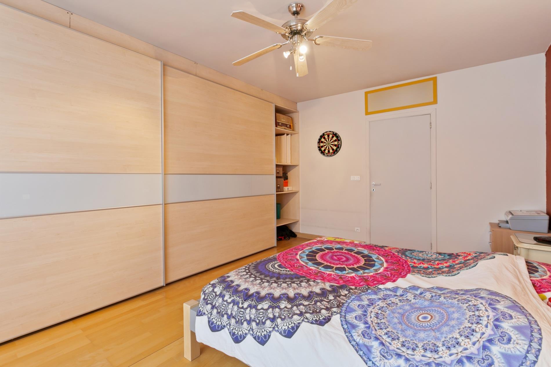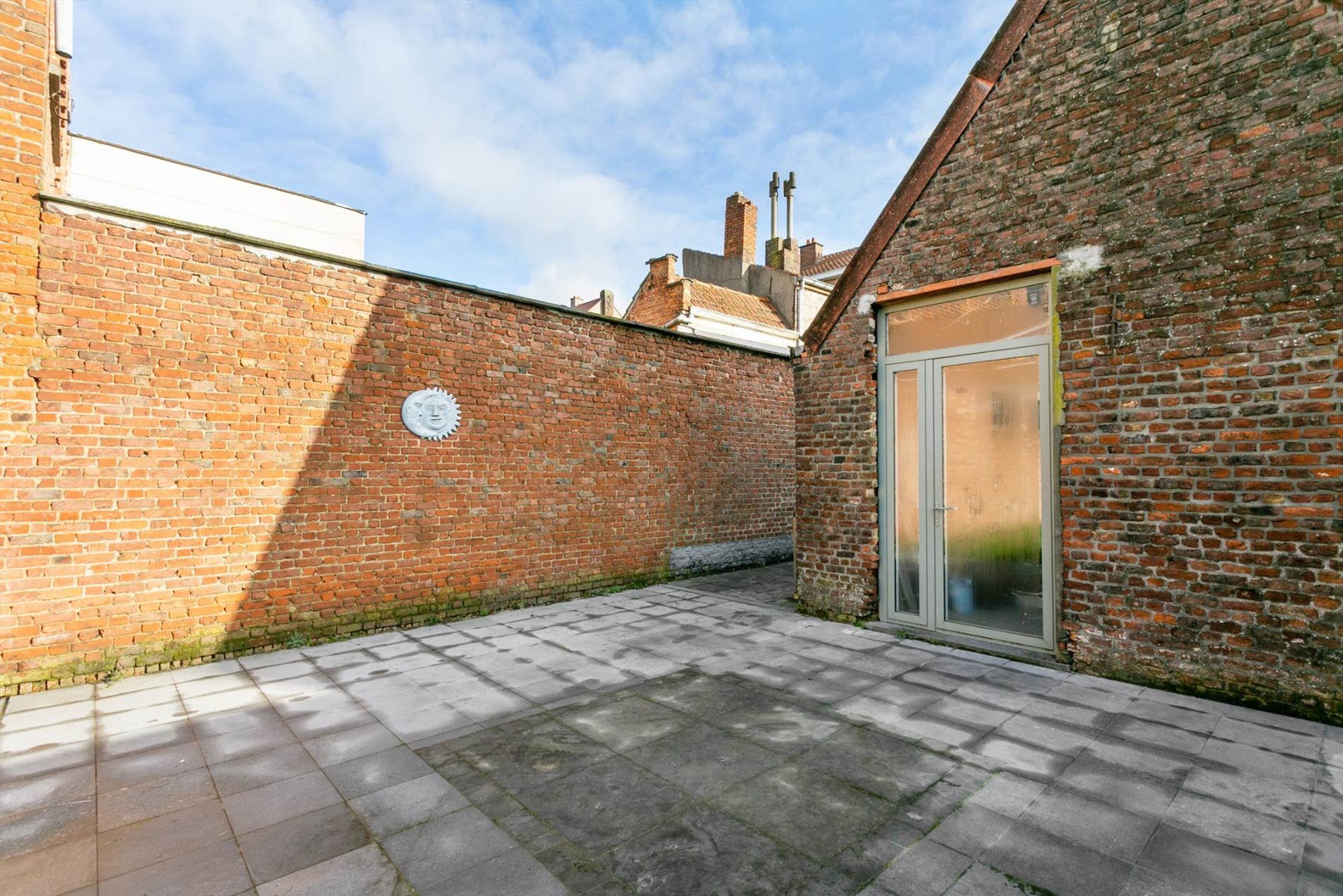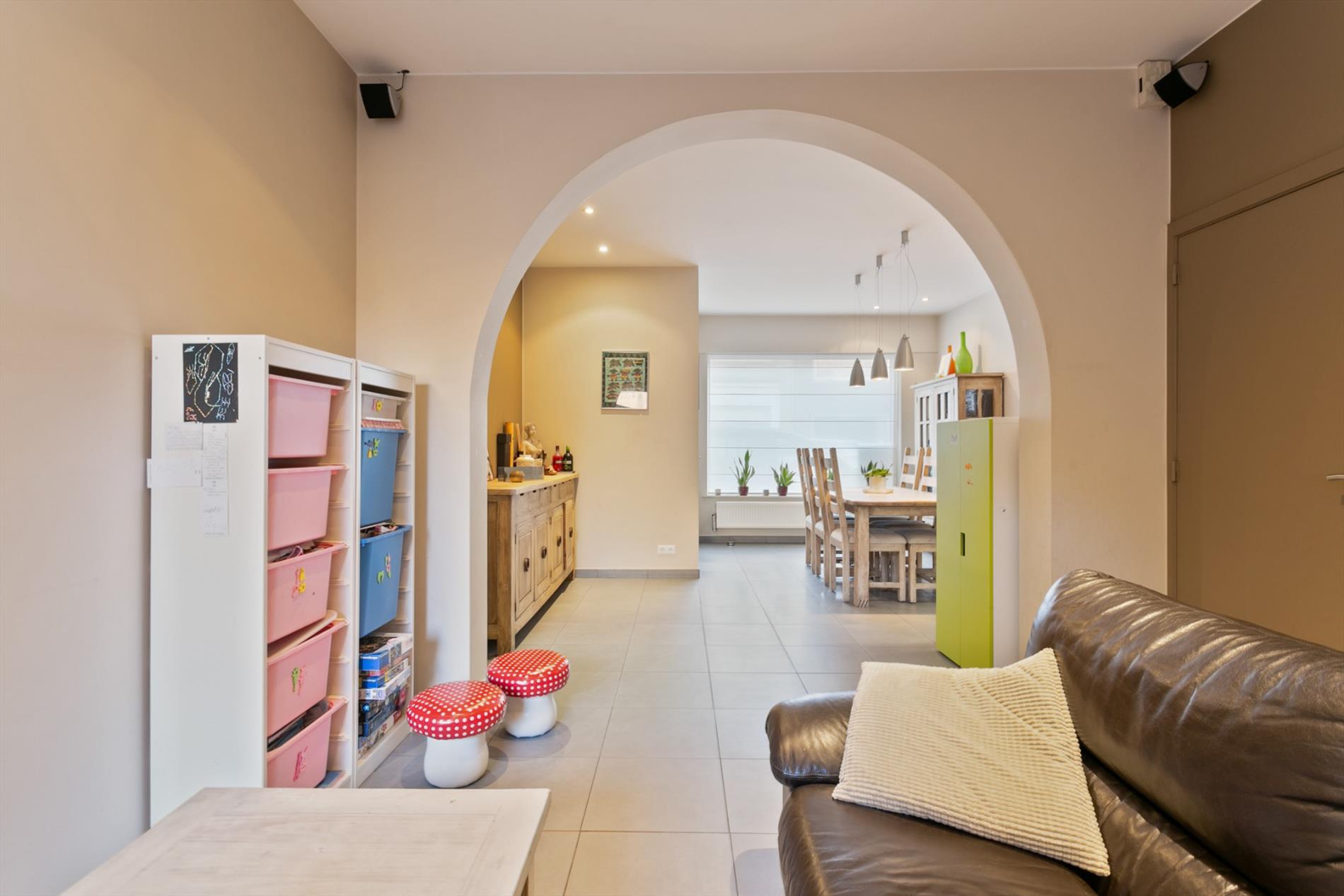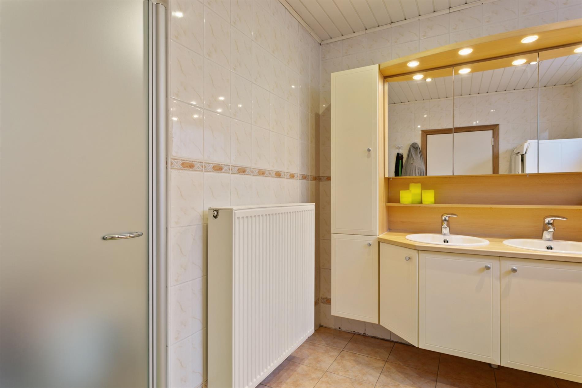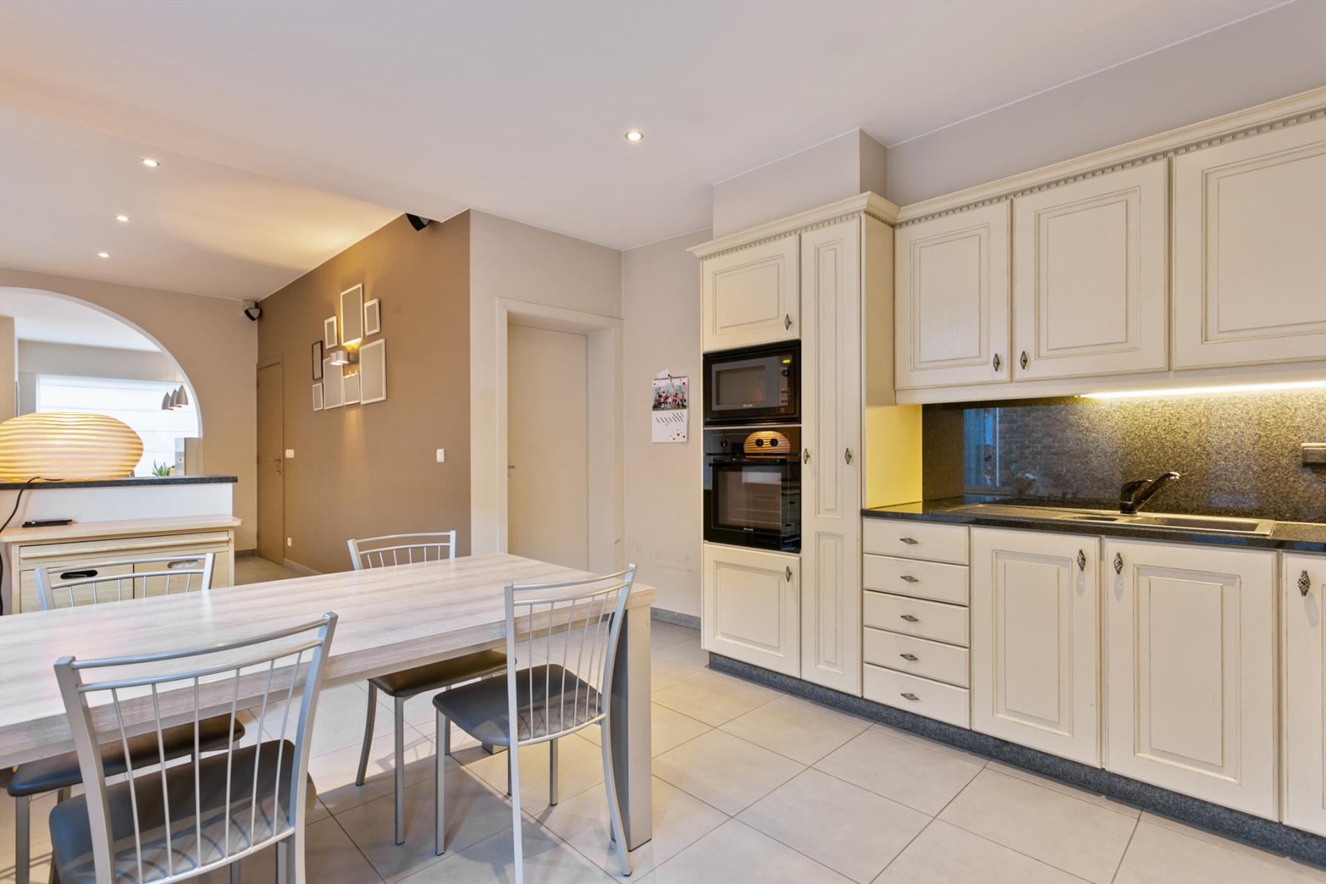 Achter de mooie gevel schuilt dit gezellig eigendom. We komen binnen langs de hal met vestiaire. De living is ruim en gezellig ingericht mede dankzij de gascassette en boog tussen voor- en middenplek. De woonkamer gaat naadloos over in de open keuken met ontbijthoek. Achter deze keuken bevindt zich een apart toilet en badkamer met dubbele lavabo en grote instapdouche.