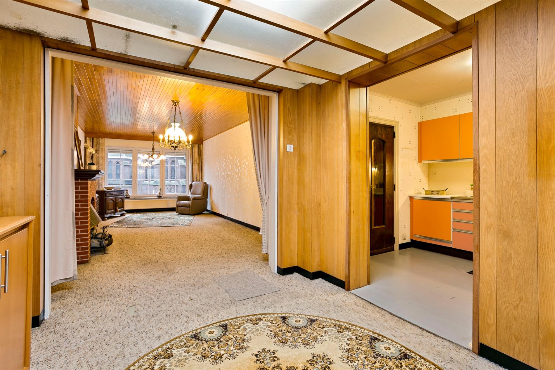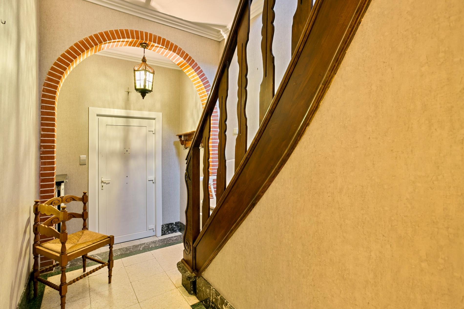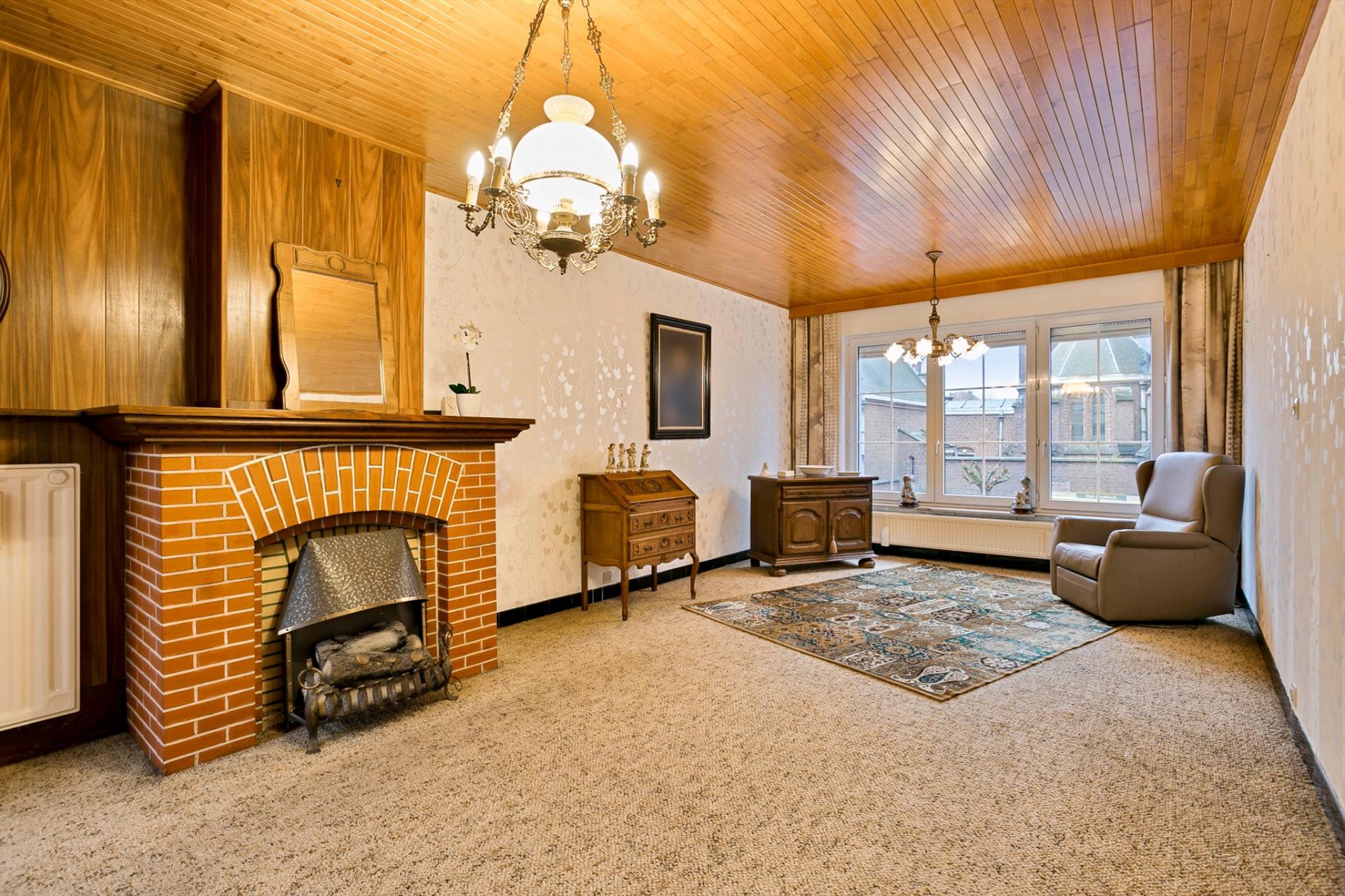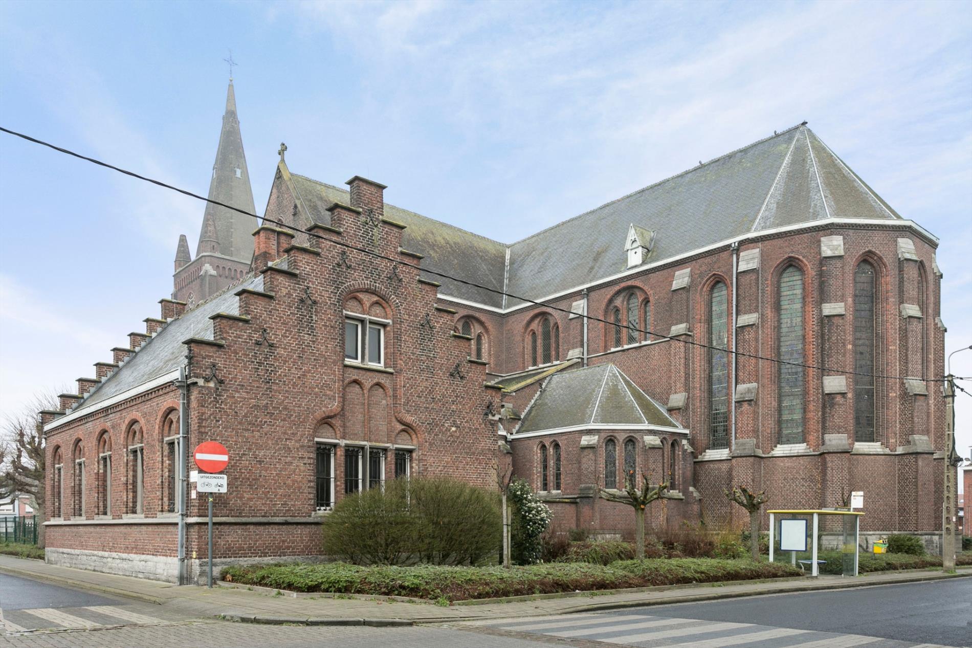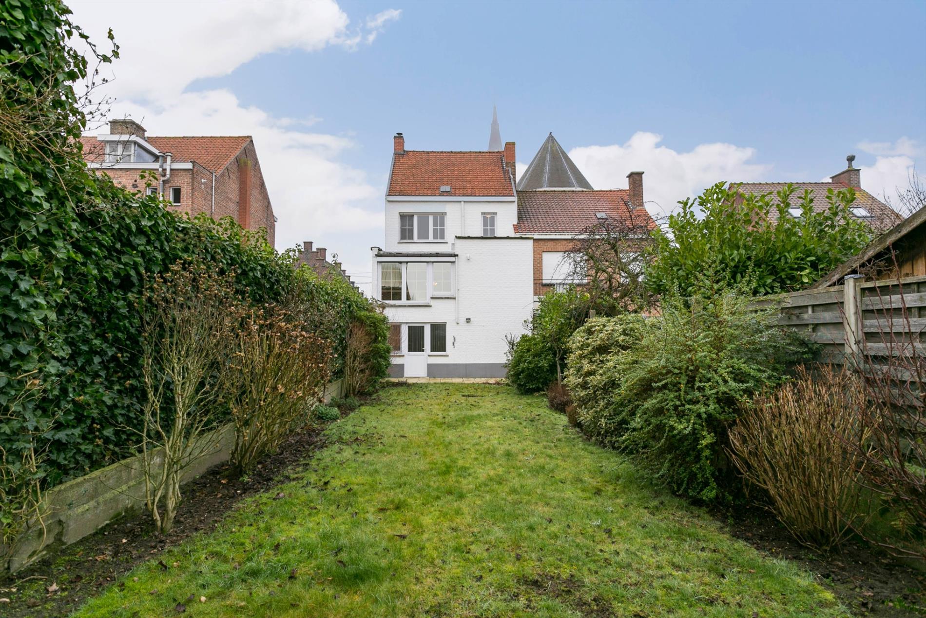 Vlak onder de kerktoren vinden we deze eigendom terug. De inkomhal leidt ons naar ofwel de garage met grote berging ofwel naar de leefruimte en keuken ofwel naar de 2 verdieping.