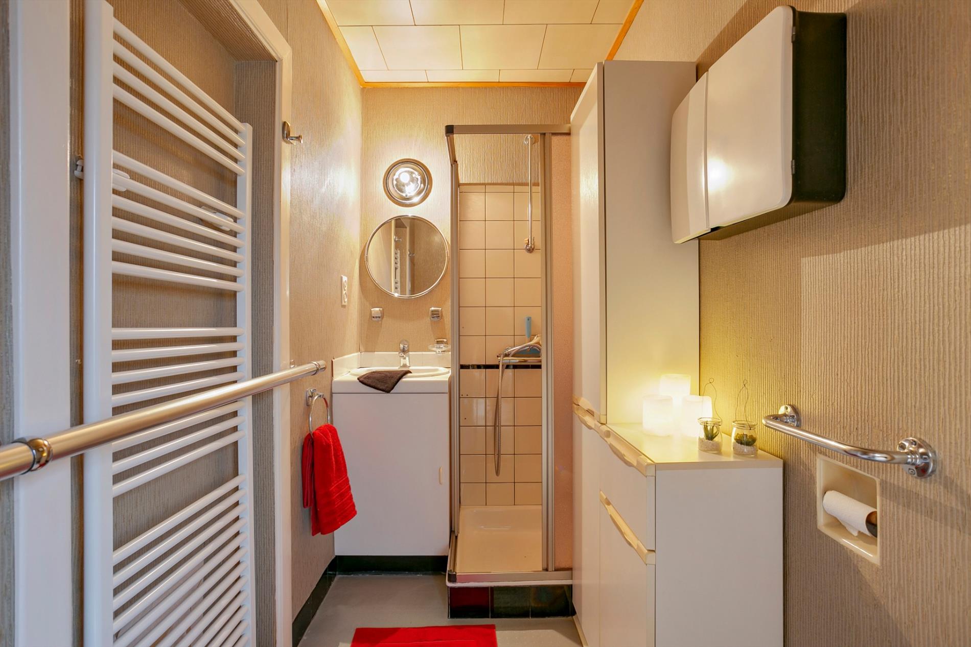 Op deze verdieping is er achter de keuken ook nog een badkamer met lavabo, douche en toilet.
