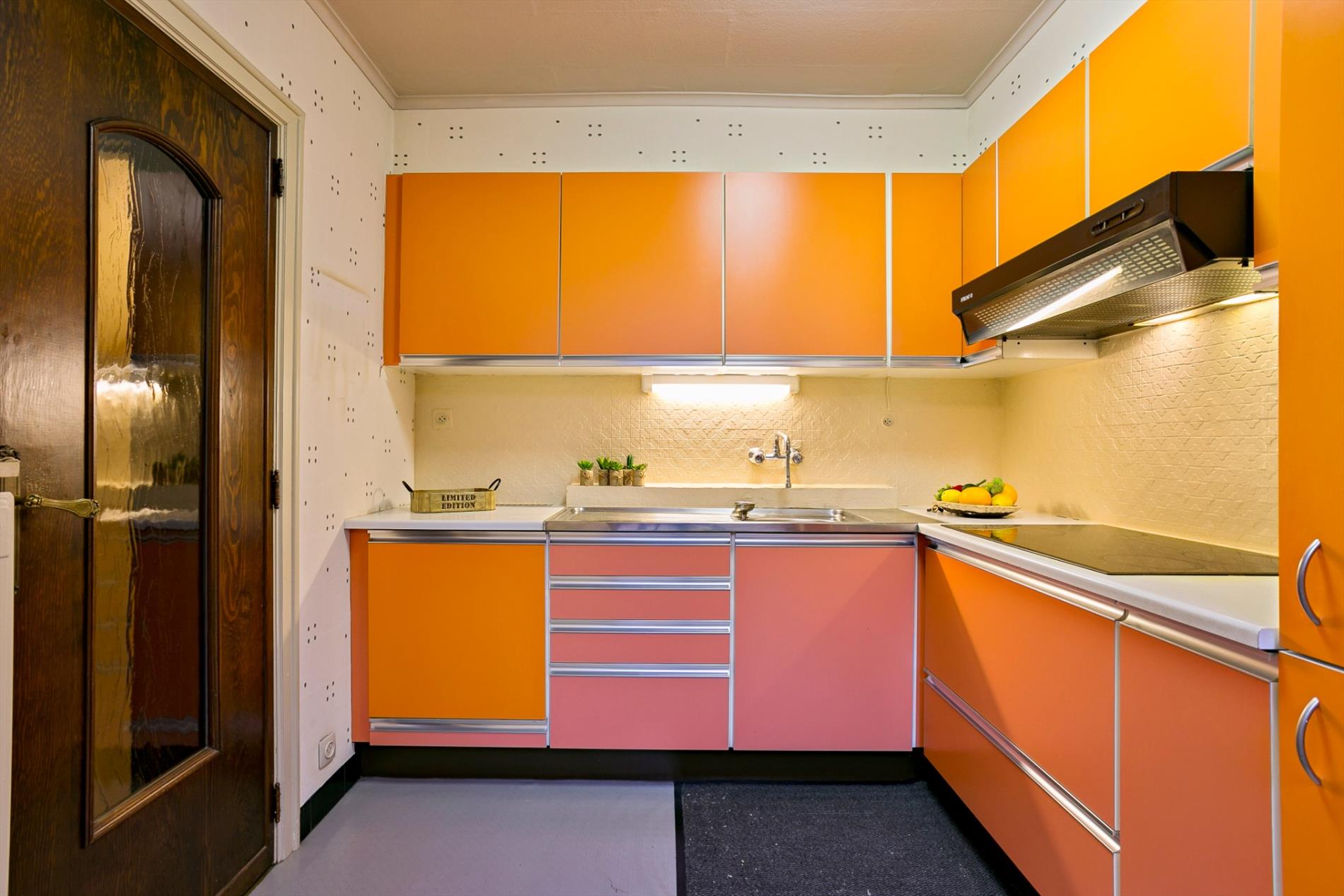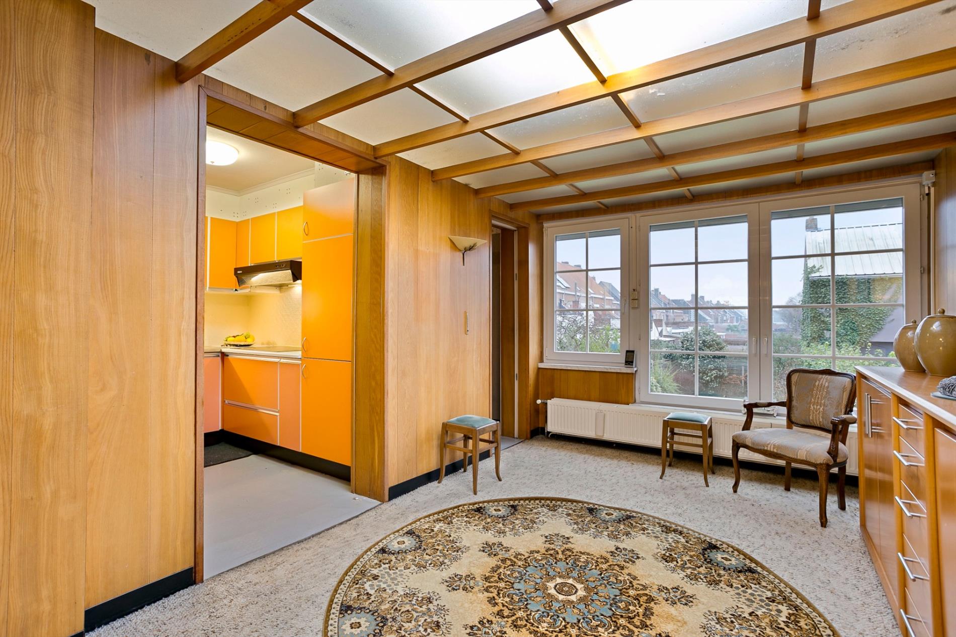 Op het eerste treffen we een grote, gezellige en heel lichtrijke living. De voorgevel bestaat volledig uit vensters. Dit zorgt ervoor dat u vanuit de hoogte het leven beneden in alle rust kan gadeslaan. De achtergelegen keuken met eethoek biedt ruimte voor een ontbijttafel en heeft ook zicht op de mooie, zonovergoten tuin.