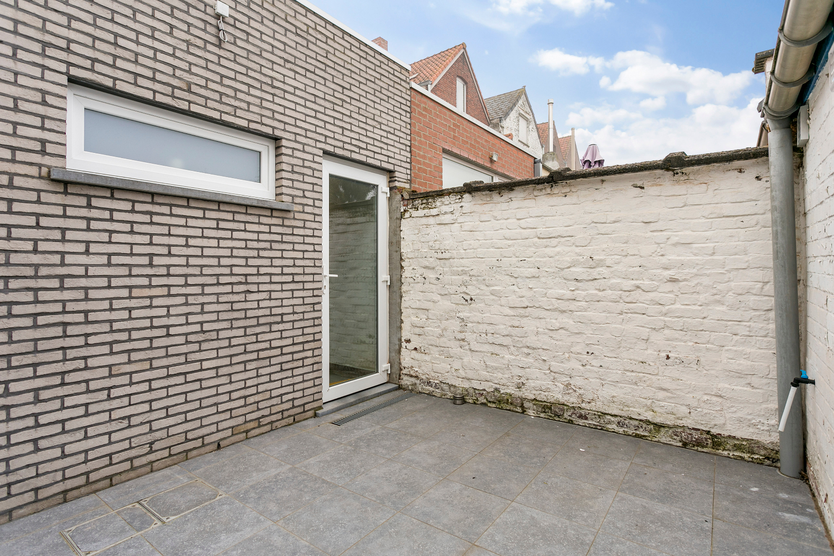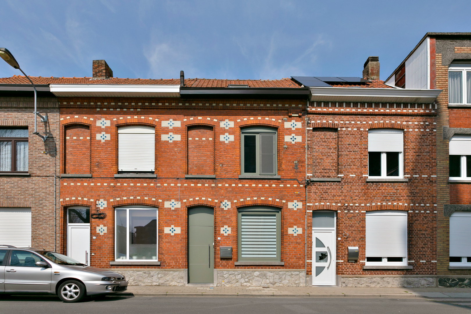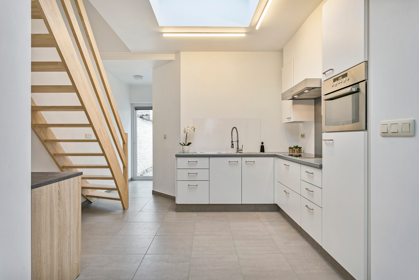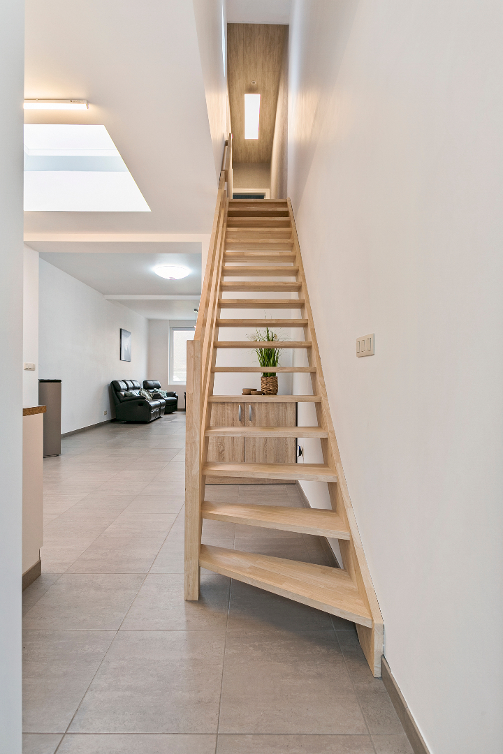 Achter de fraaie gevel schuilt een verrassend ruime woning. We komen de grote living binnen die overgaat in een volledig uitgeruste open keuken. Op het gelijkvloers vinden we nog een zeer mooie badkamer met lavabomeubel, toilet en inloopdouche. Achteraan is er nog een terras met handige buitenberging.