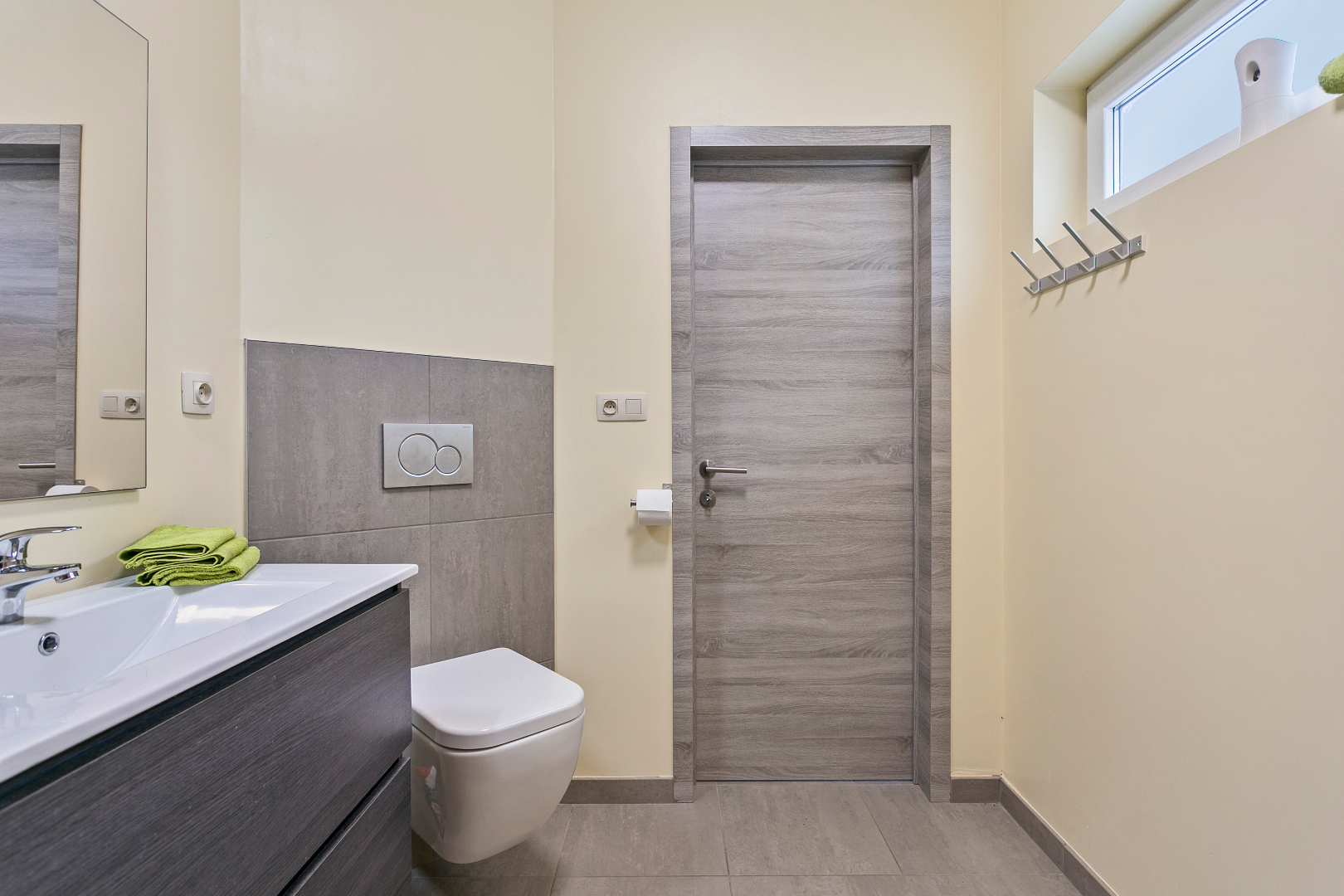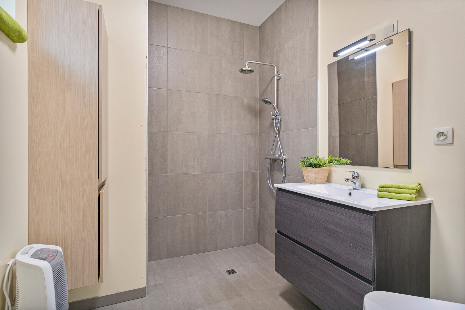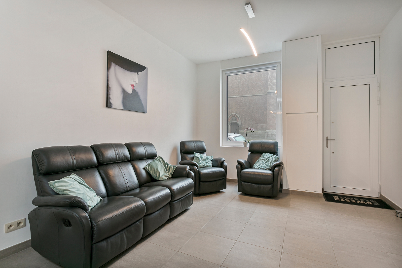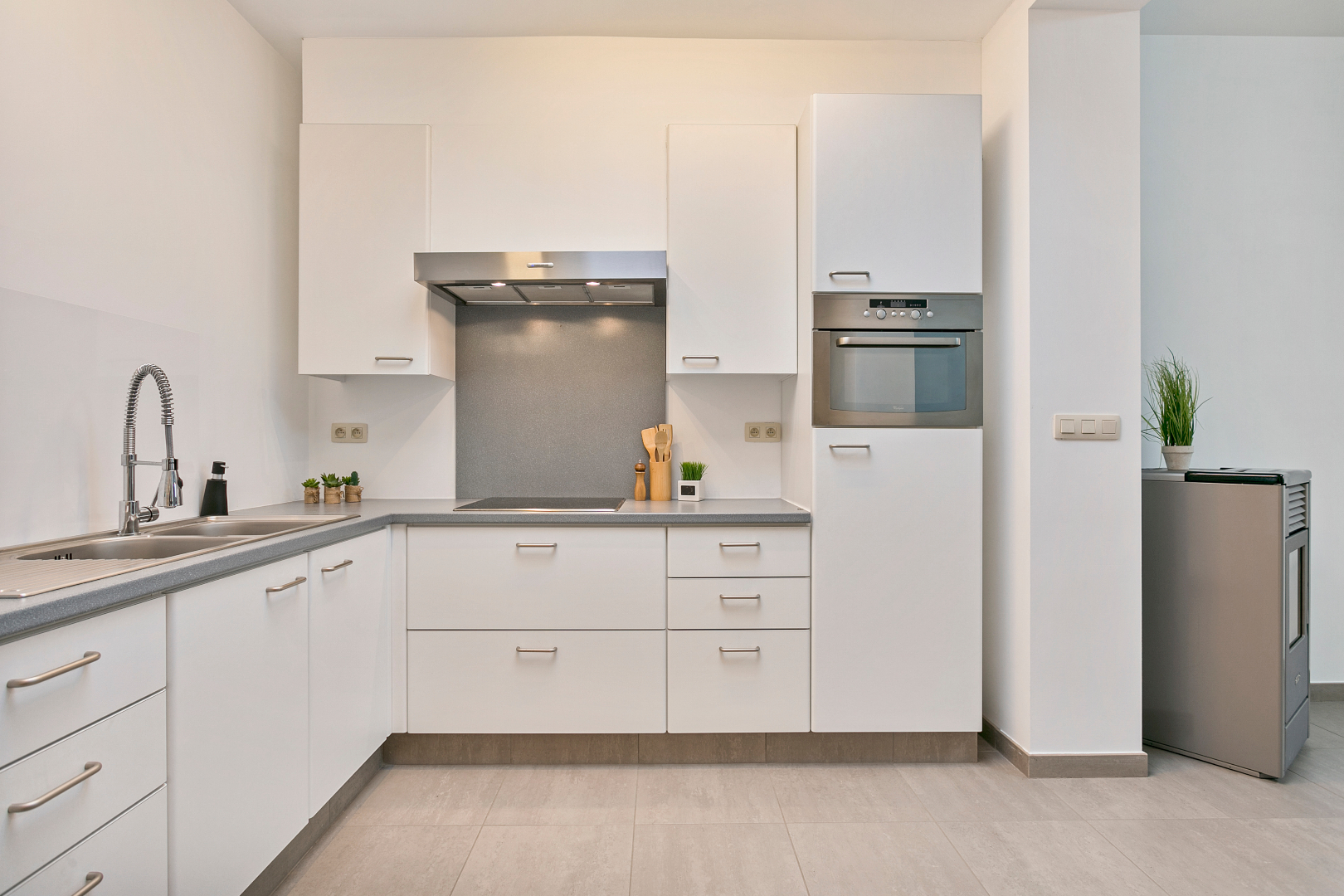 Achter de fraaie gevel schuilt een verrassend ruime woning. We komen de grote living binnen die overgaat in een volledig uitgeruste open keuken. Op het gelijkvloers vinden we nog een zeer mooie badkamer met lavabomeubel, toilet en inloopdouche. Achteraan is er nog een terras met handige buitenberging.