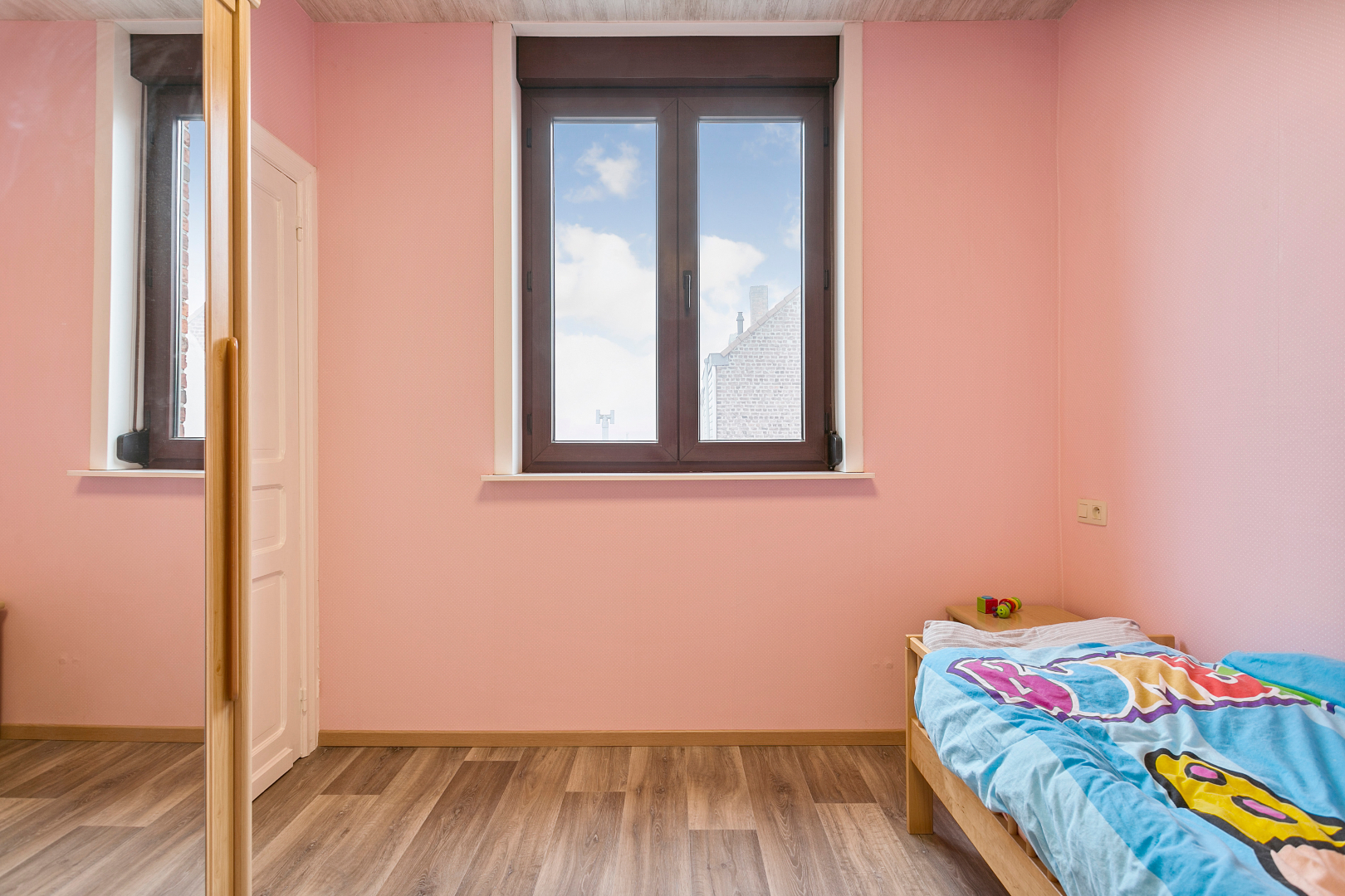 De 1e verdieping beschikt over 2 mooie slaapkamers en via een vaste trap kunnen we naar de zolderverdieping. Deze kan gebruikt worden als slaapkamer, bureau, hobbyruimte,....