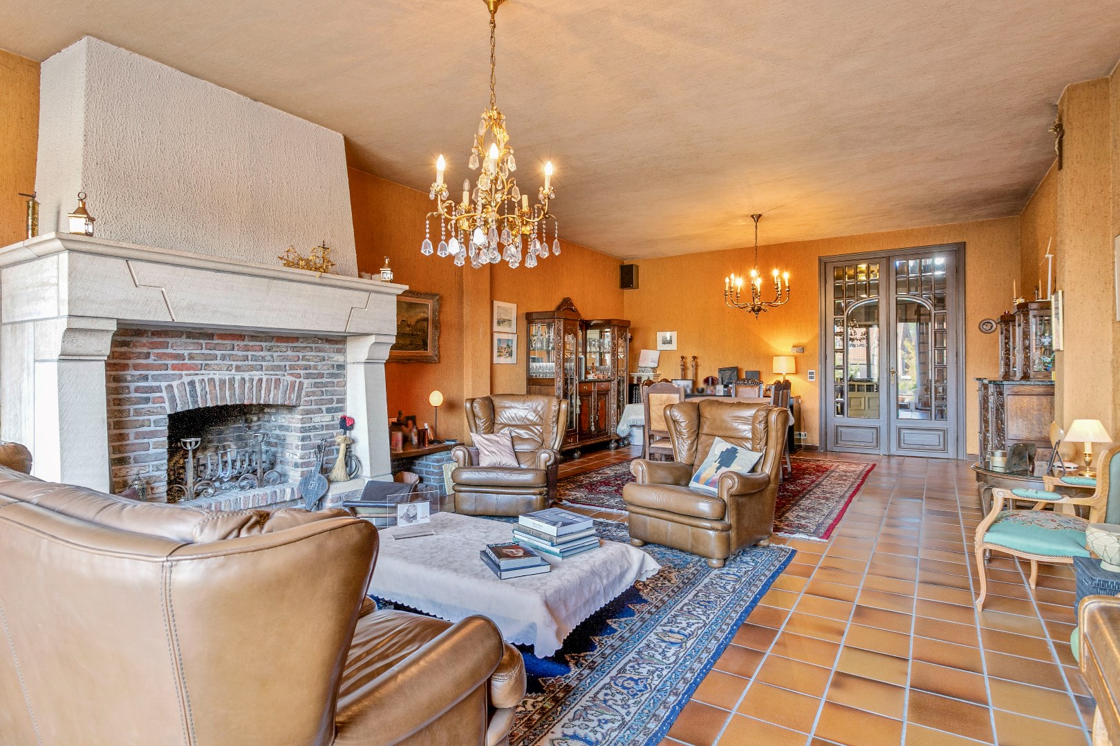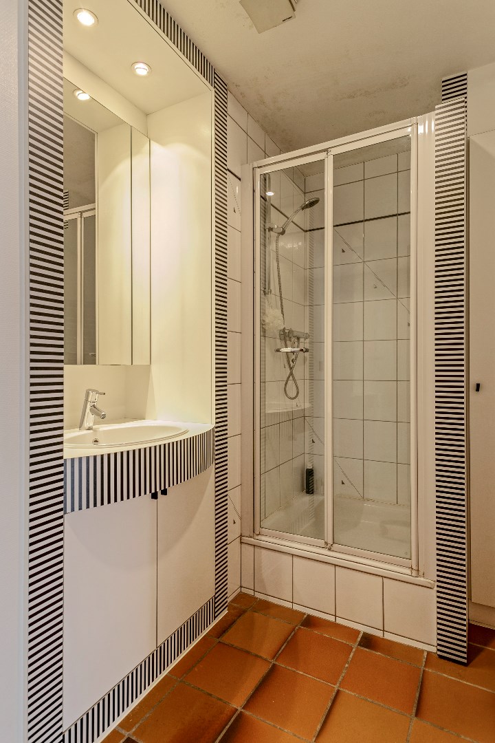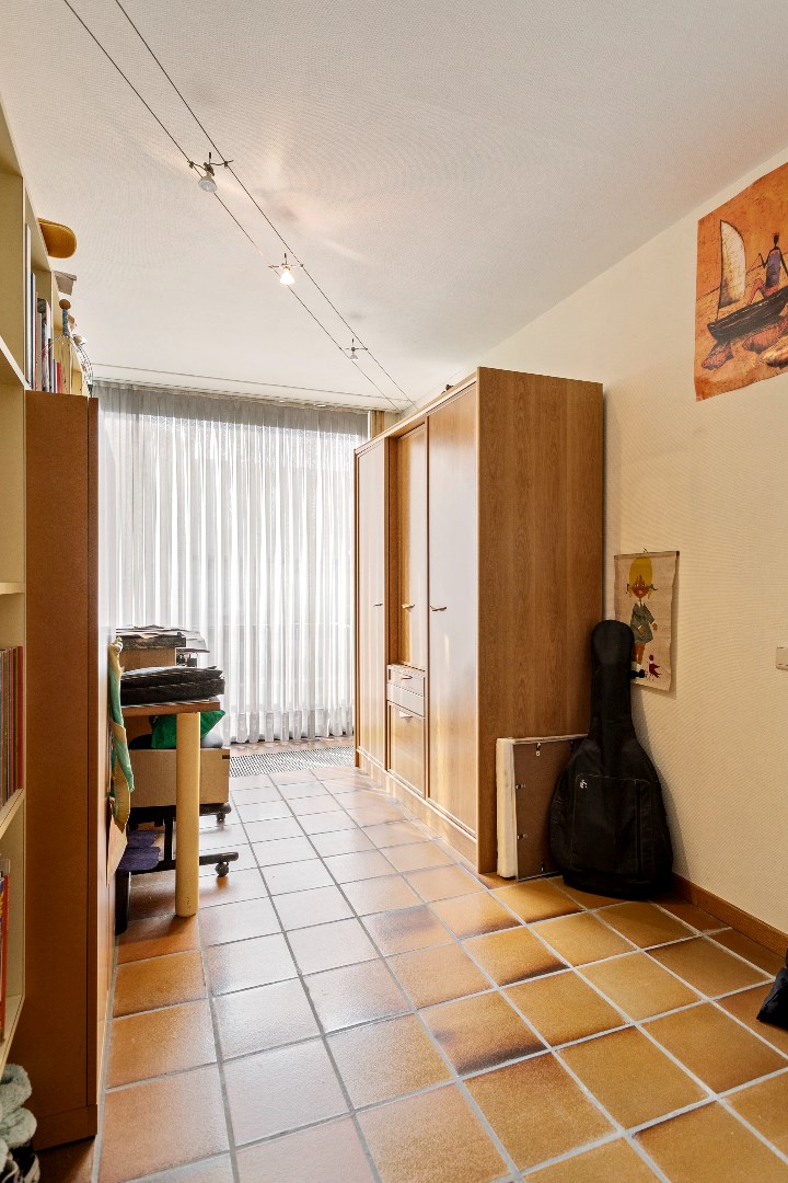 Op de eerste verdieping zijn er langs de voorzijde 2 kinderkamers met een eerste badkamer. Via de gang met mooie, originele elementen komen we in de tweede keuken. Op de gang is er ook nog een ruim toilet. Langs de achterzijde treffen we een heel leuke, ruime en lichtrijke leefruimte. De grote schouw met open haard zorgt voor een extra gezellige toets. Palend aan deze leefruimte is er een groot terras van 50 m2.