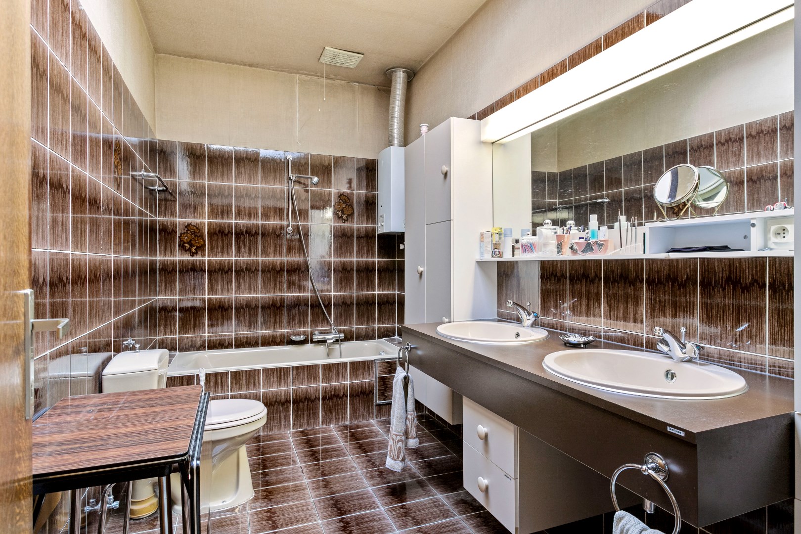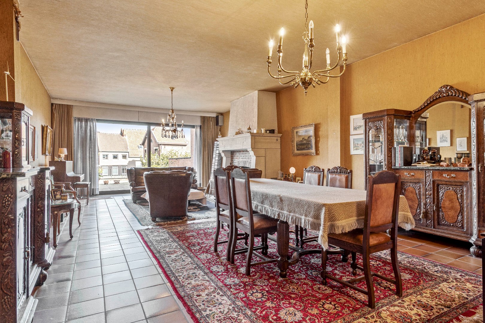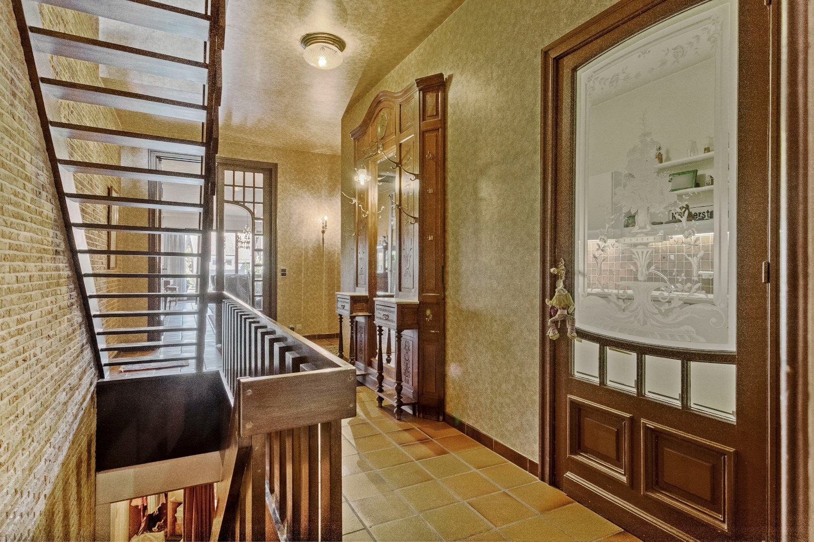 Op de eerste verdieping zijn er langs de voorzijde 2 kinderkamers met een eerste badkamer. Via de gang met mooie, originele elementen komen we in de tweede keuken. Op de gang is er ook nog een ruim toilet. Langs de achterzijde treffen we een heel leuke, ruime en lichtrijke leefruimte. De grote schouw met open haard zorgt voor een extra gezellige toets. Palend aan deze leefruimte is er een groot terras van 50 m2.