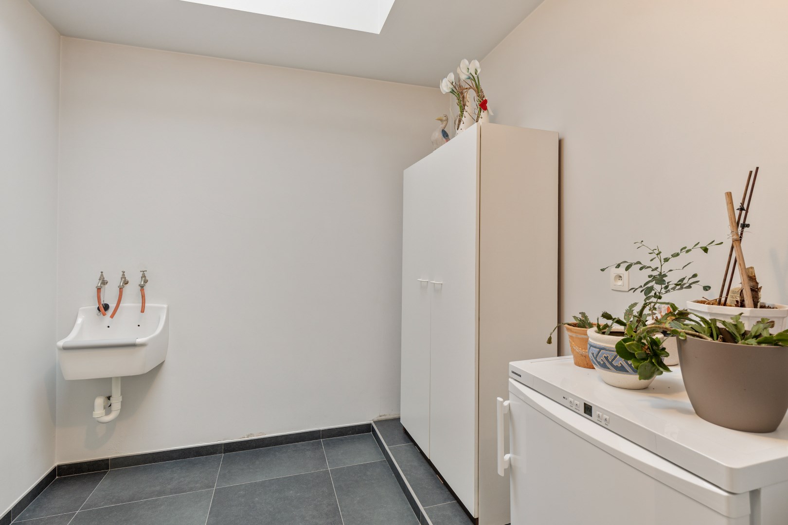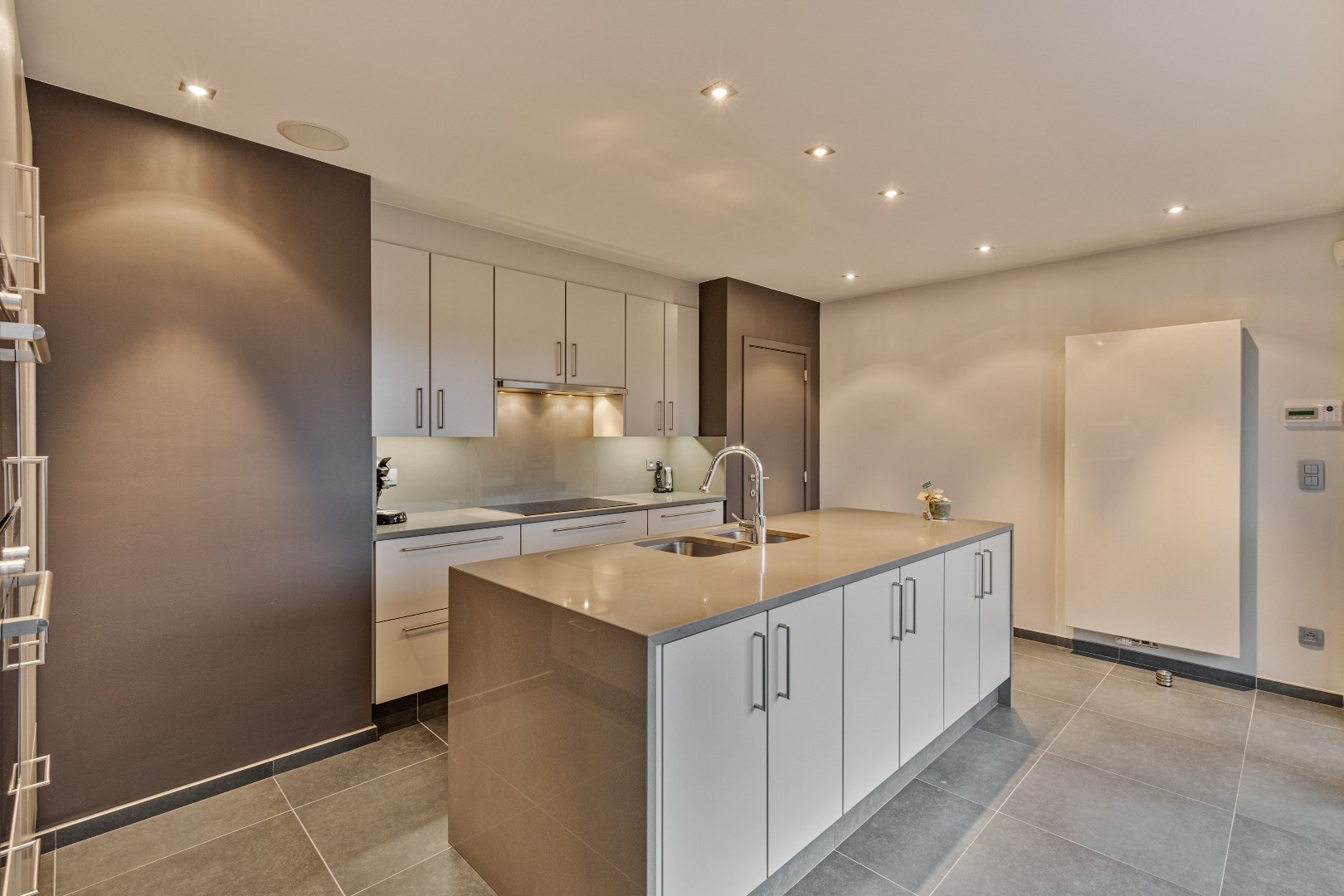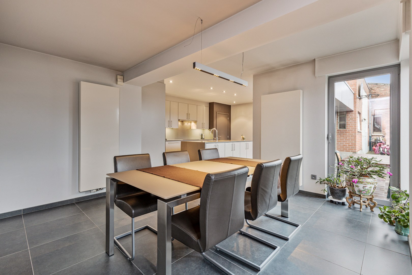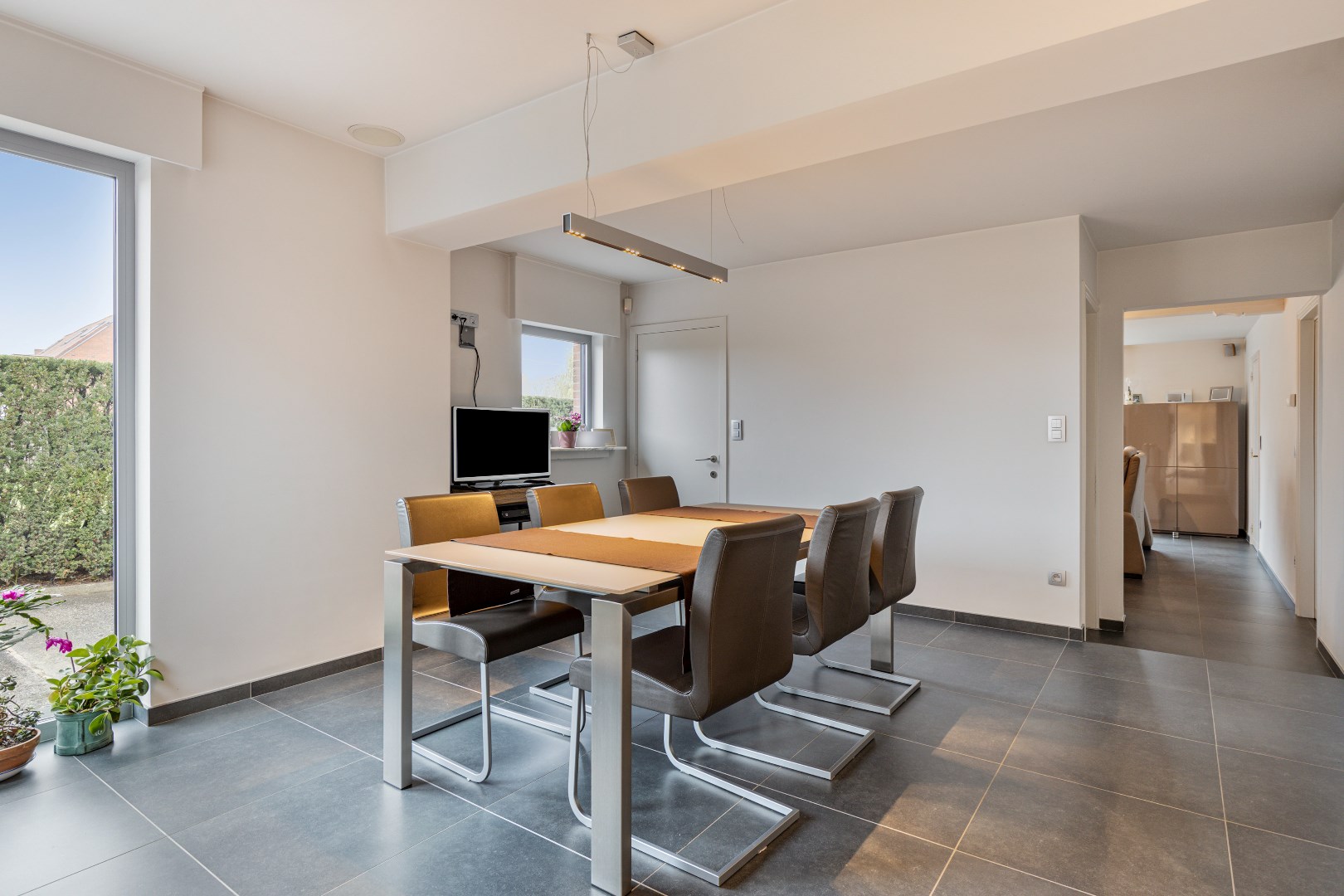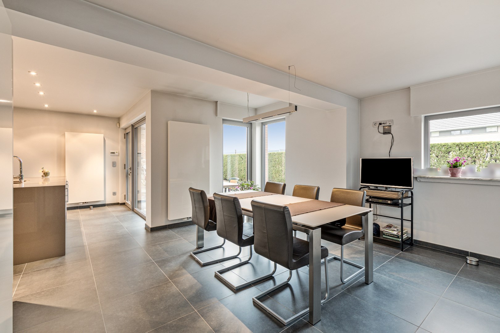 Bij binnenkomst in de hal vinden we langs de linkerkant een buro. Rechts stappen we binnen in het lichtrijke salon met gashaard. We gaan verder naar de eetkamer met open keuken. De grote raampartijen maken het hier zalig zitten. De keuken met composieten werkblad is tot in de puntjes ingericht. Naast de keuken treffen we een eerste berging met toegang tot de gelijkvloerse, nieuwe badkamer met lavabo, toilet en inloopdouche. Gelijkvloers is er nog een gastentoilet en een grote tweede berging waar plaats is voor de wasmachine en droogkast. Er staat hier ook een waterontharder.