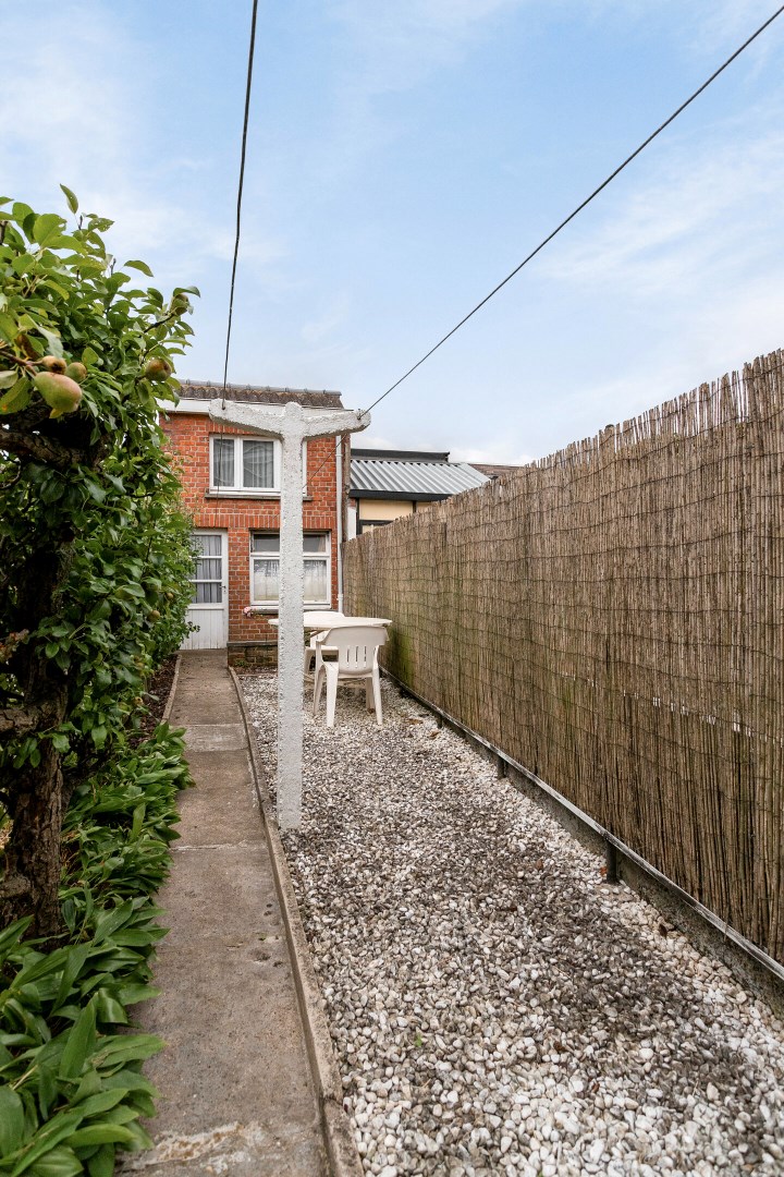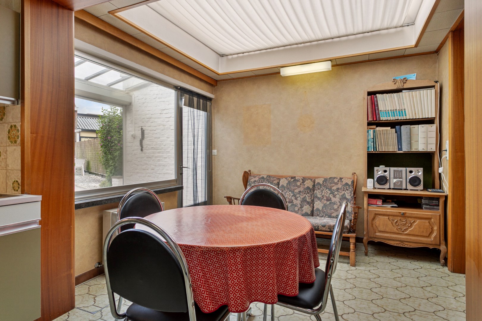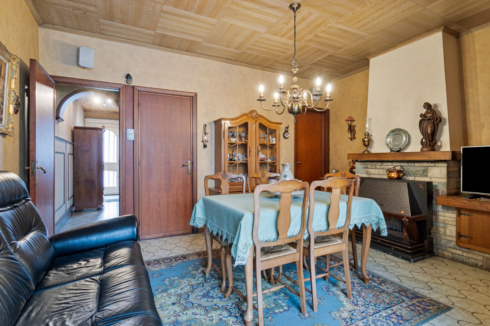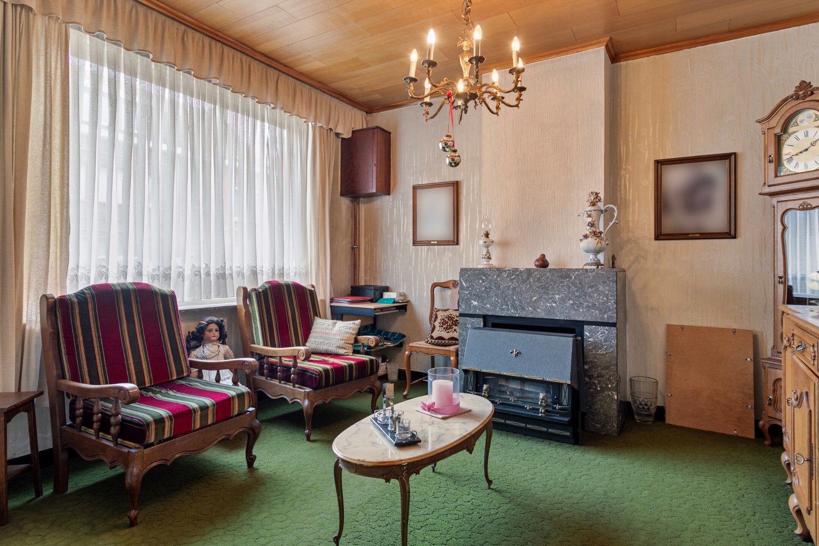 We komen de woning binnen en meteen merken we in de gezellige zithoek enkele mooie originele elementen van weleer. De leefruimte sluit aan op de keuken achteraan. Van hieruit kunnen we naar het overdekte terras met tuin. Achteraan is er een ruime berging aanwezig. Op het gelijkvloers vinden we nog een toilet.