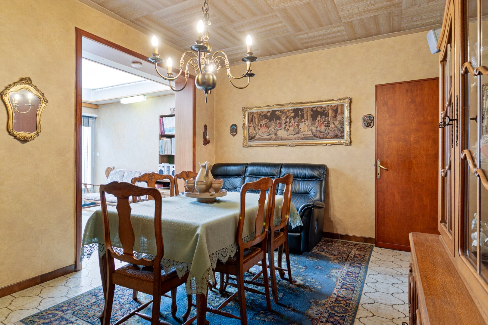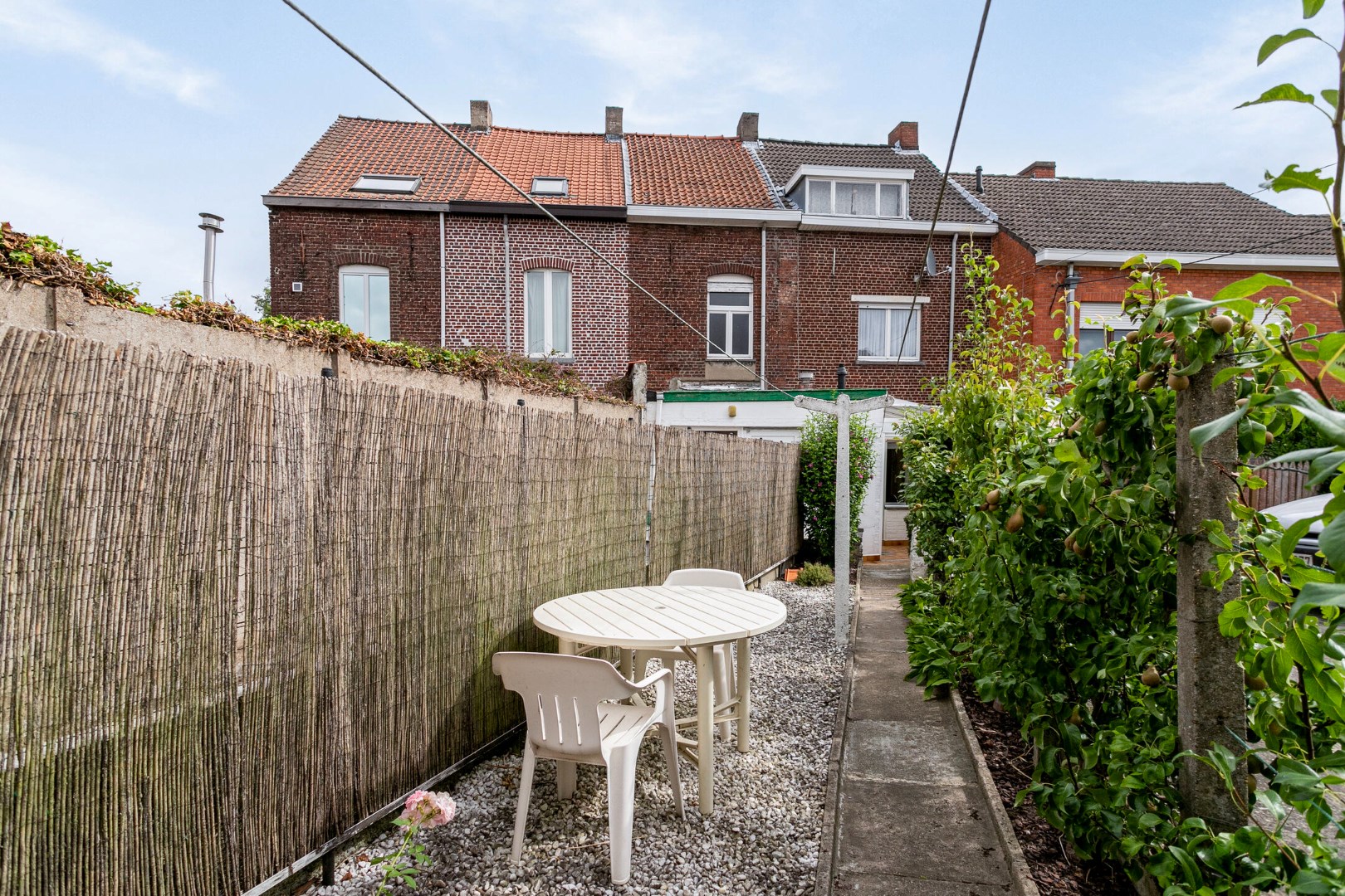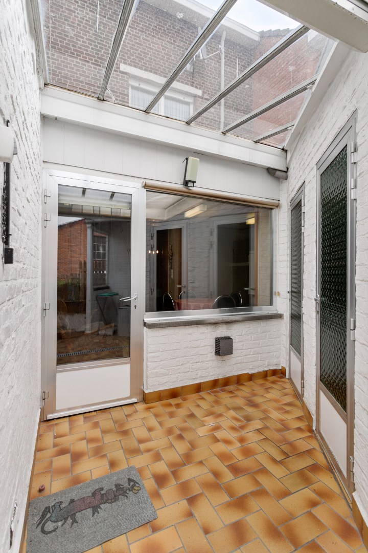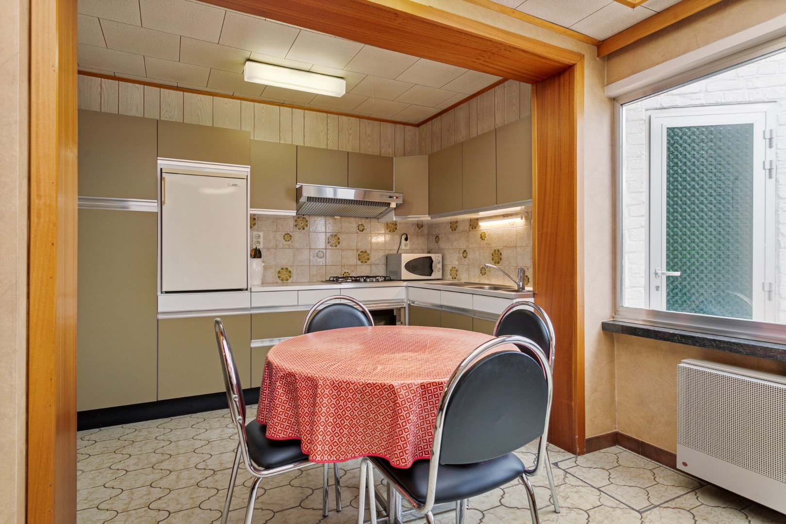 We komen de woning binnen en meteen merken we in de gezellige zithoek enkele mooie originele elementen van weleer. De leefruimte sluit aan op de keuken achteraan. Van hieruit kunnen we naar het overdekte terras met tuin. Achteraan is er een ruime berging aanwezig. Op het gelijkvloers vinden we nog een toilet.