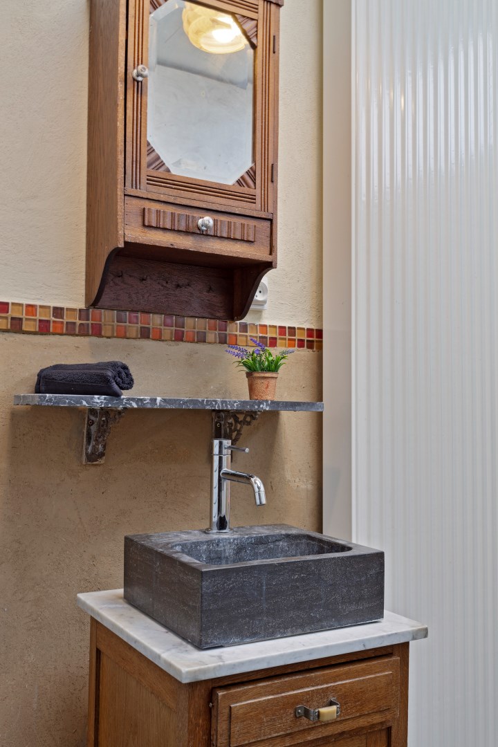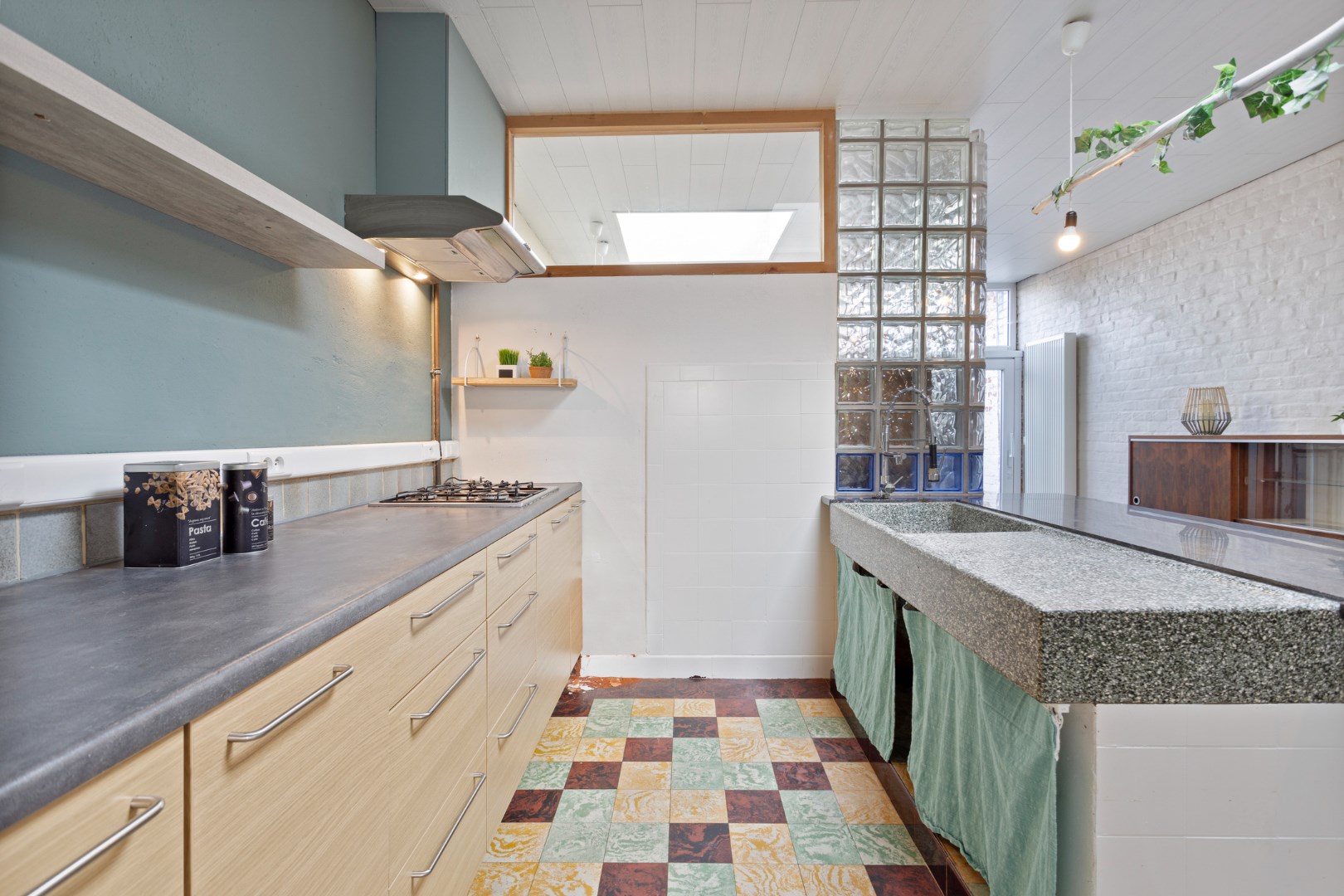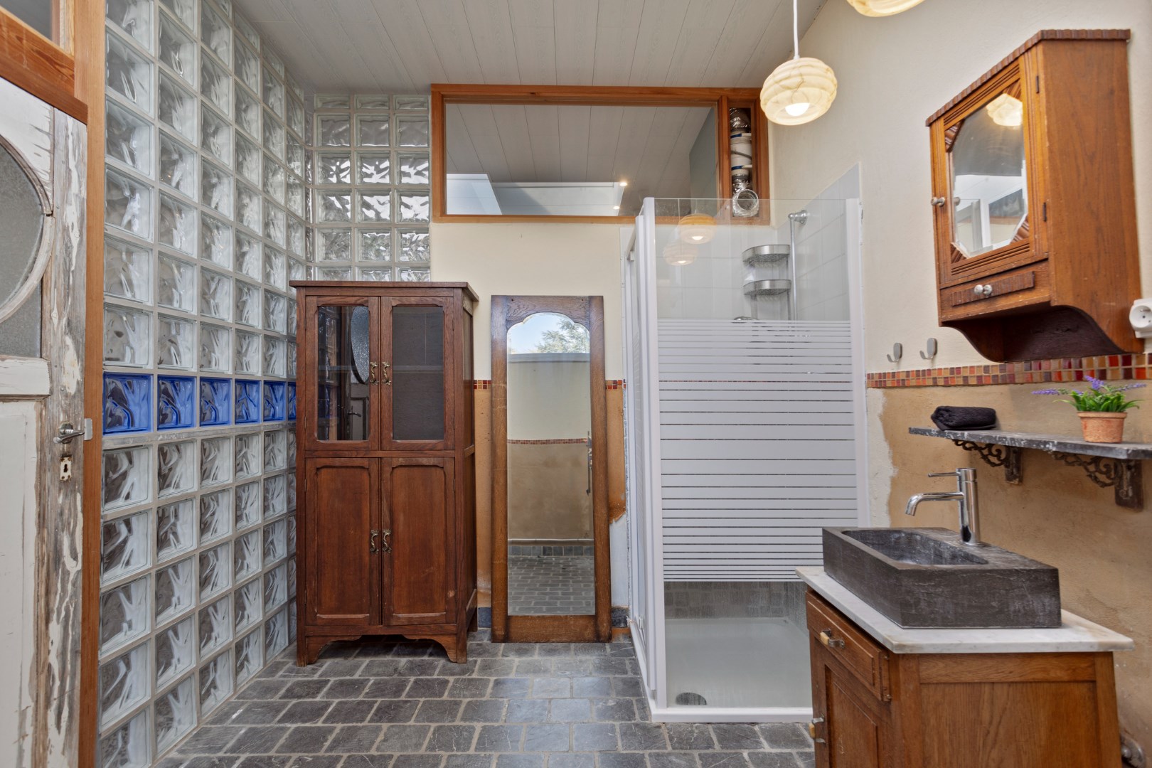 Via de inkomhal komen we in de voorplek of middenplek. De originele vloer in cementtegels en de oorspronkelijke deuren zorgen voor extra uitstraling. De knetterende houtkachel in de zitruimte draagt bij tot de gezelligheid. Ook hier is extra aandacht besteed aan de aparte afwerking. De aanpalende keuken herbergt wederom veel authentieke elementen. De muurtegeltjes en de mooie pompsteen vertellen geschiedenis. De keuken is uitgebouwd, beschikt over een schuifraam achteraan en is heel lichtrijk. De achtergelegen badkamer heeft een lavabo, douche en toilet. Er is hier ook plaats voor een wasmachine en droogkast. Op de stevige bovenverdieping vinden we 2 ruime kamers terug. Een vaste trap breng ons naar de handige en nette bergzolder. Achter de woning is er een ruime berging met daarachter een diepe tuin waar het aangenaam vertoeven is. Hier kan u rustig baden in het zonnetje.