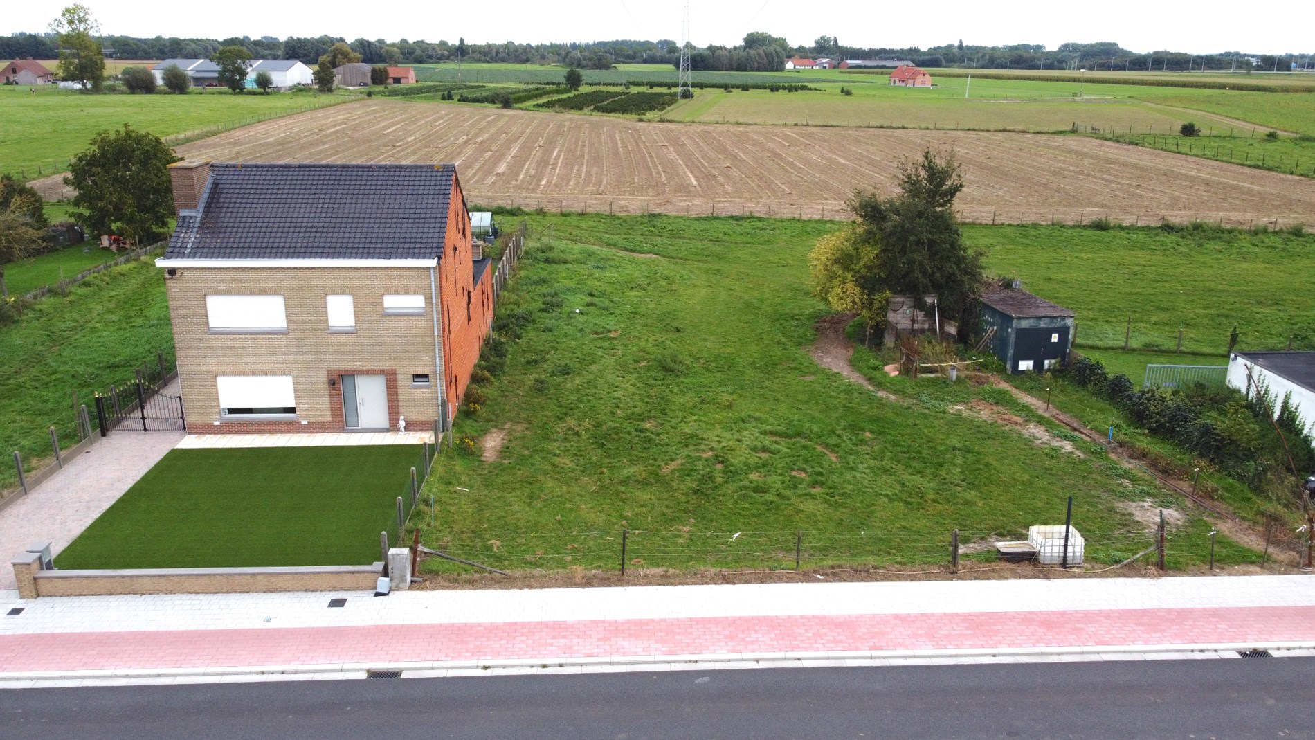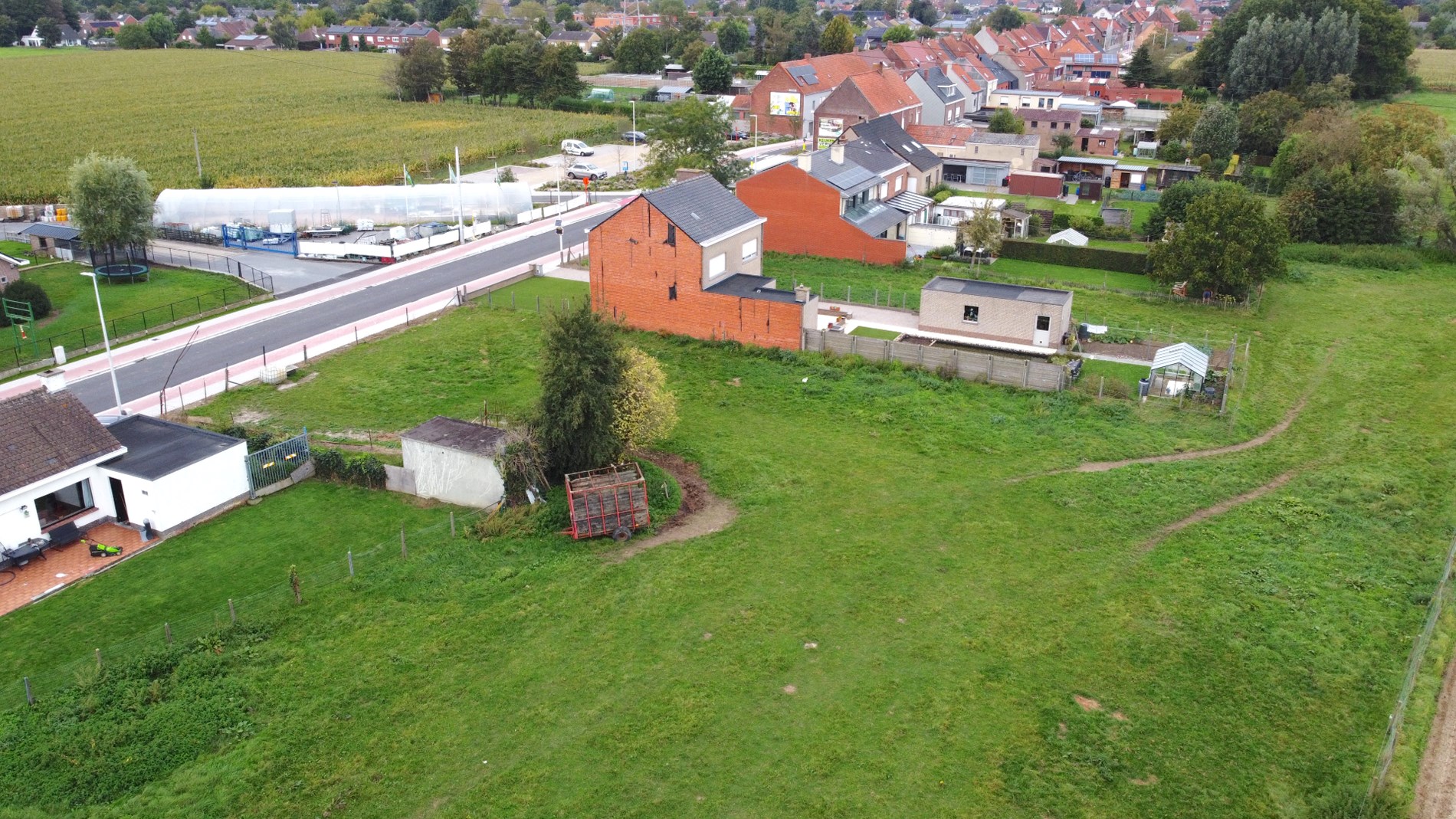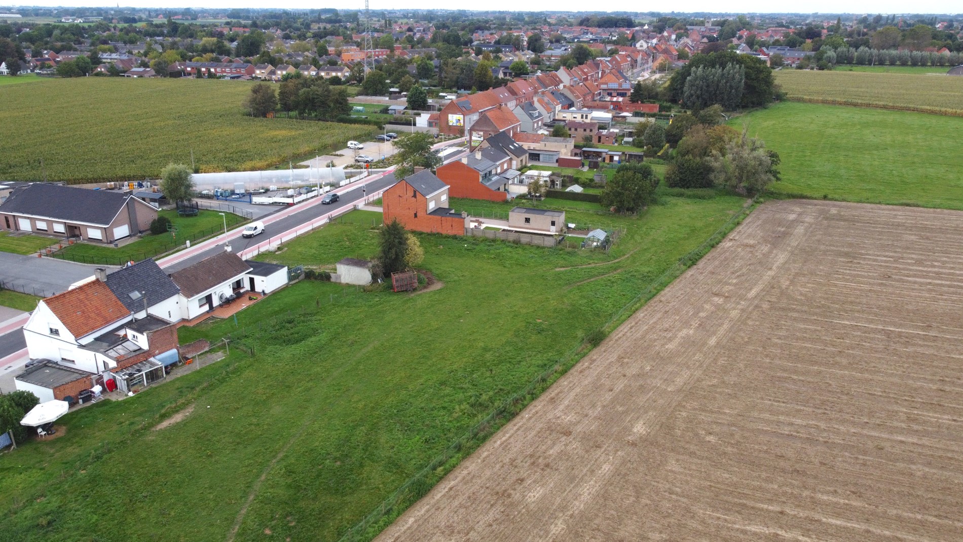 Op de baan tussen Wevelgem en Moorsele vinden we dit uitzonderlijk stuk bouwgrond. Gezien de breedte van het perceel is het mogelijk om zowel een halfopen woning als een open woning te bouwen.