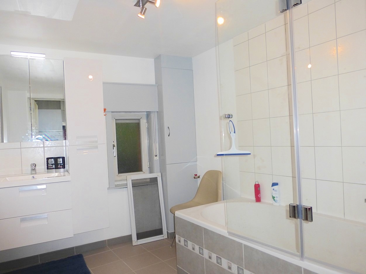 De vernieuwde badkamer beschikt over een lavabomeubel en bad/douche combinatie. Er is tevens een ruimte die kan dienst doen als dressing. Het toilet is apart.
