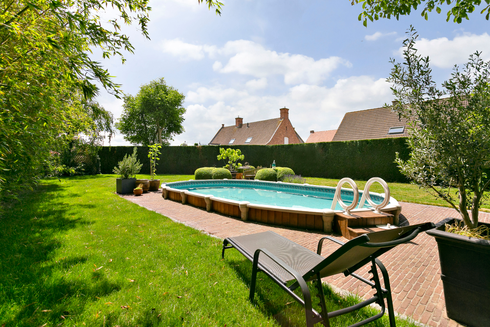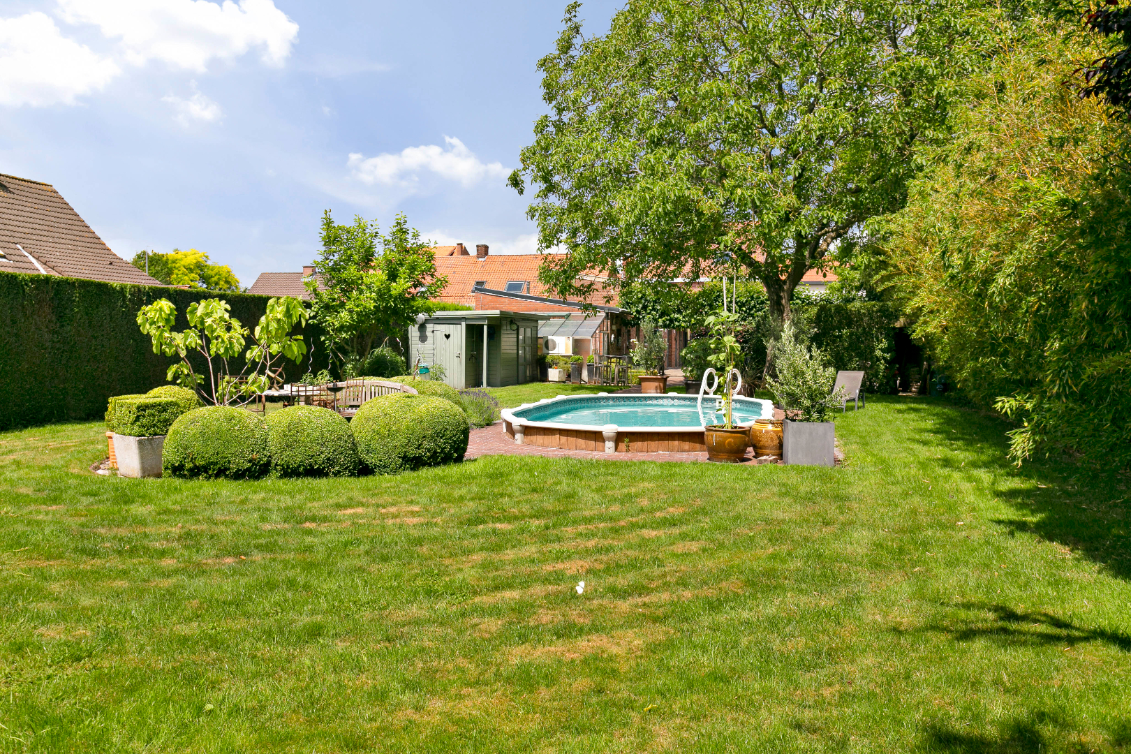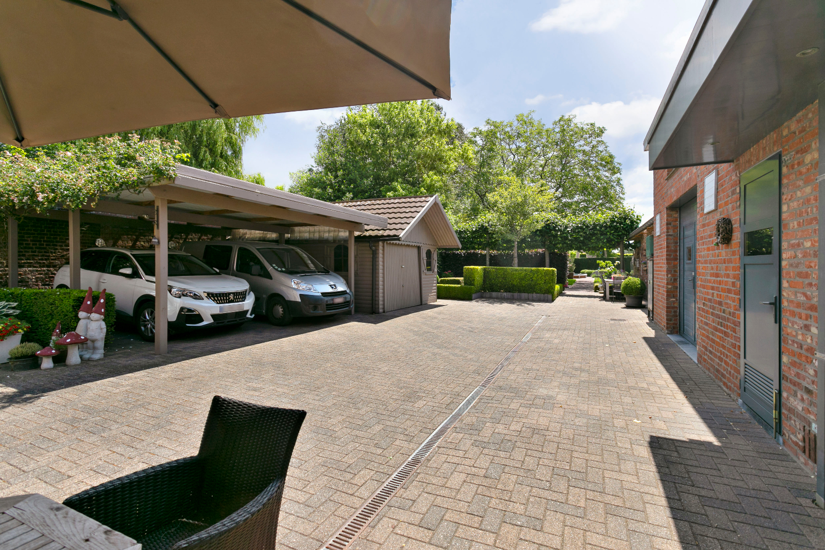 Dit eigendom heeft achteraan een prachtige zuidtuin met zwembad, waar het heerlijk vertoeven is in alle rust en privacy. Naast de woning is een garage bereikbaar met een dubbele carport. De verharde binnenkoer is uitermate geschikt als parking voor klanten.