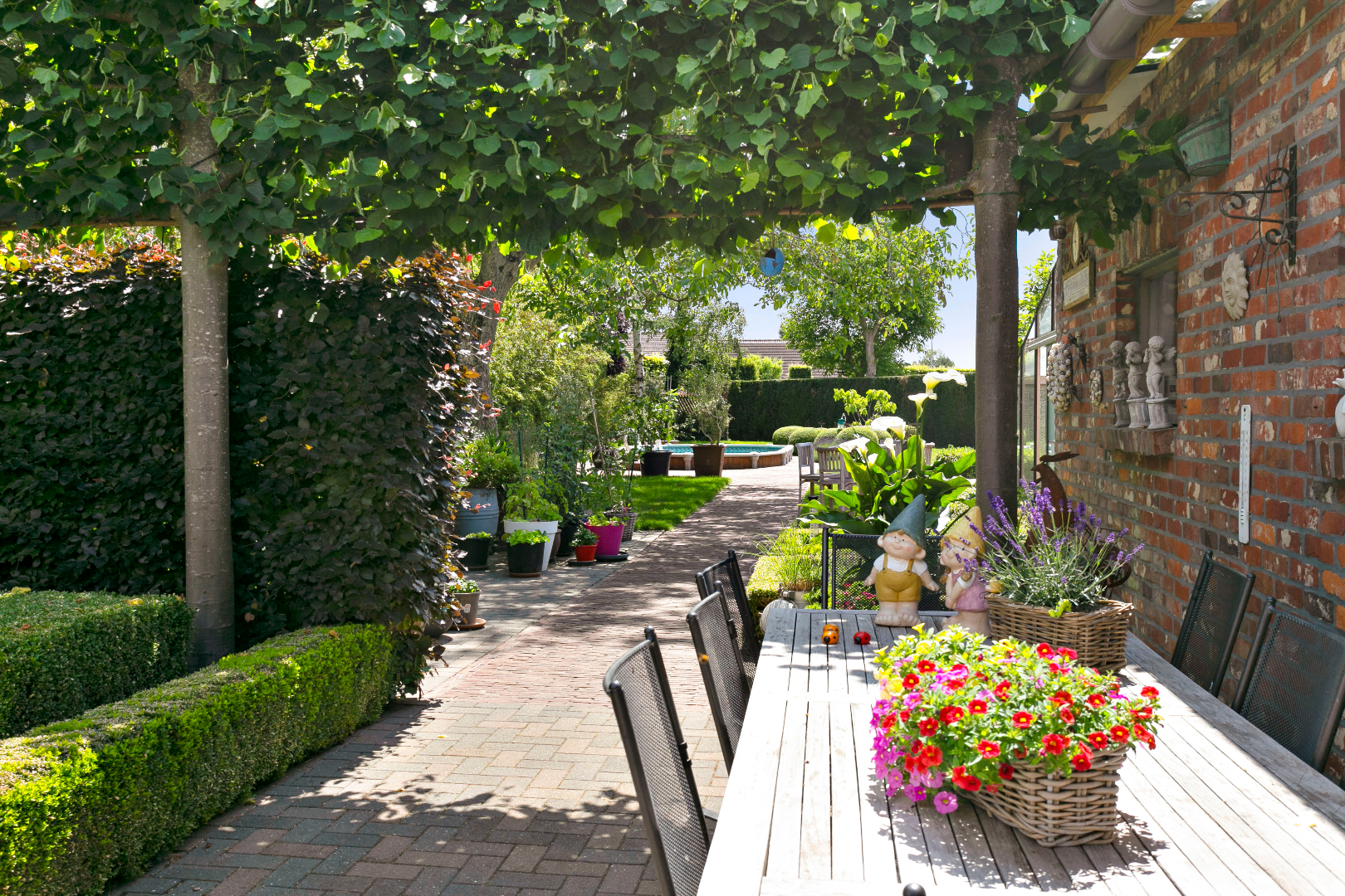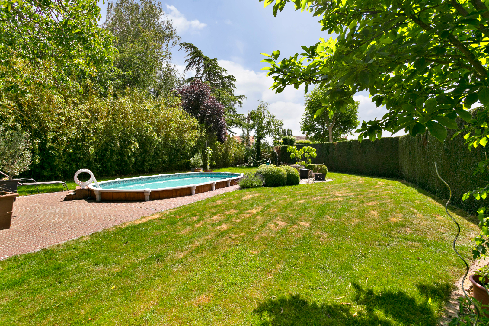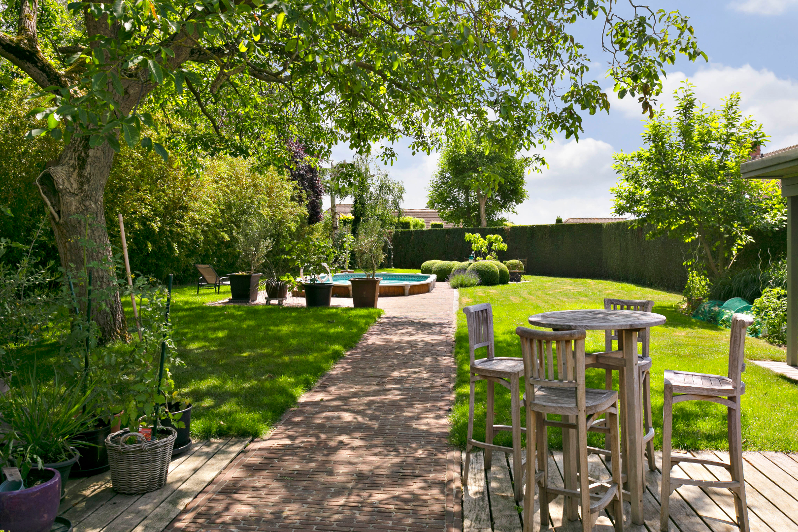 Dit eigendom heeft achteraan een prachtige zuidtuin met zwembad, waar het heerlijk vertoeven is in alle rust en privacy. Naast de woning is een garage bereikbaar met een dubbele carport. De verharde binnenkoer is uitermate geschikt als parking voor klanten.