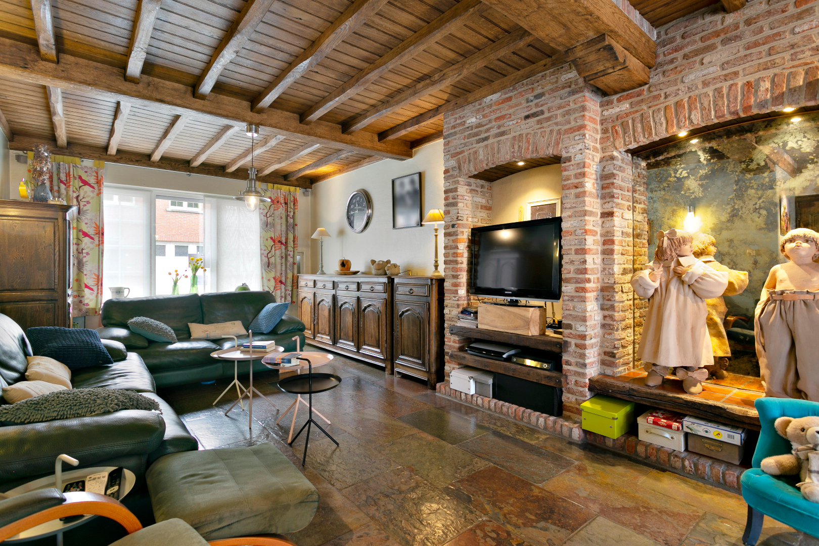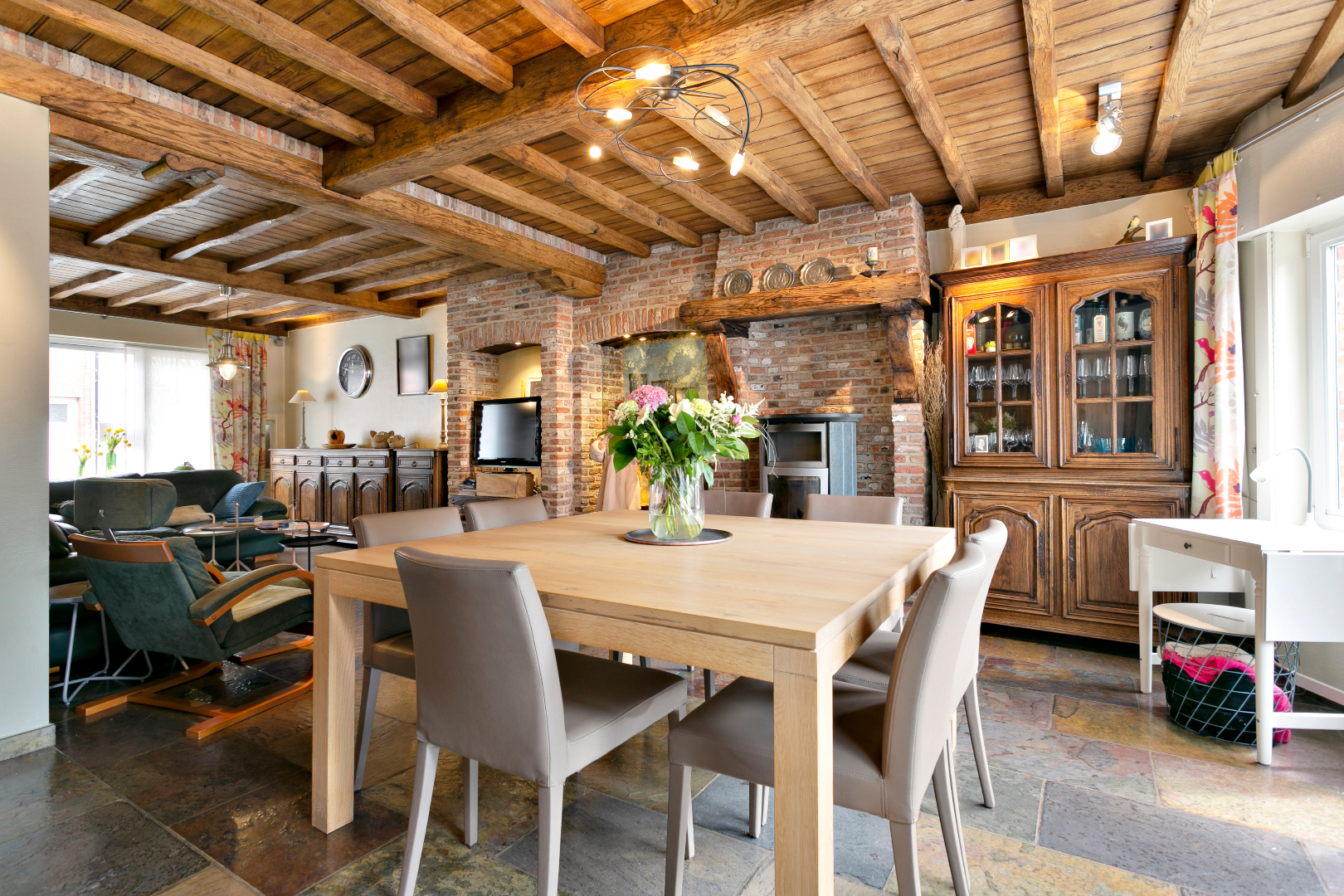 De woonst is afgescheiden van de zaak en bestaat uit een prachtige rustieke living, vernieuwde keuken, apart WC en op de 1e verdieping: 3 slaapkamers en een ruime vernieuwde badkamer. Via een valtrap kunnen we naar de ruime geïsoleerde zolder.