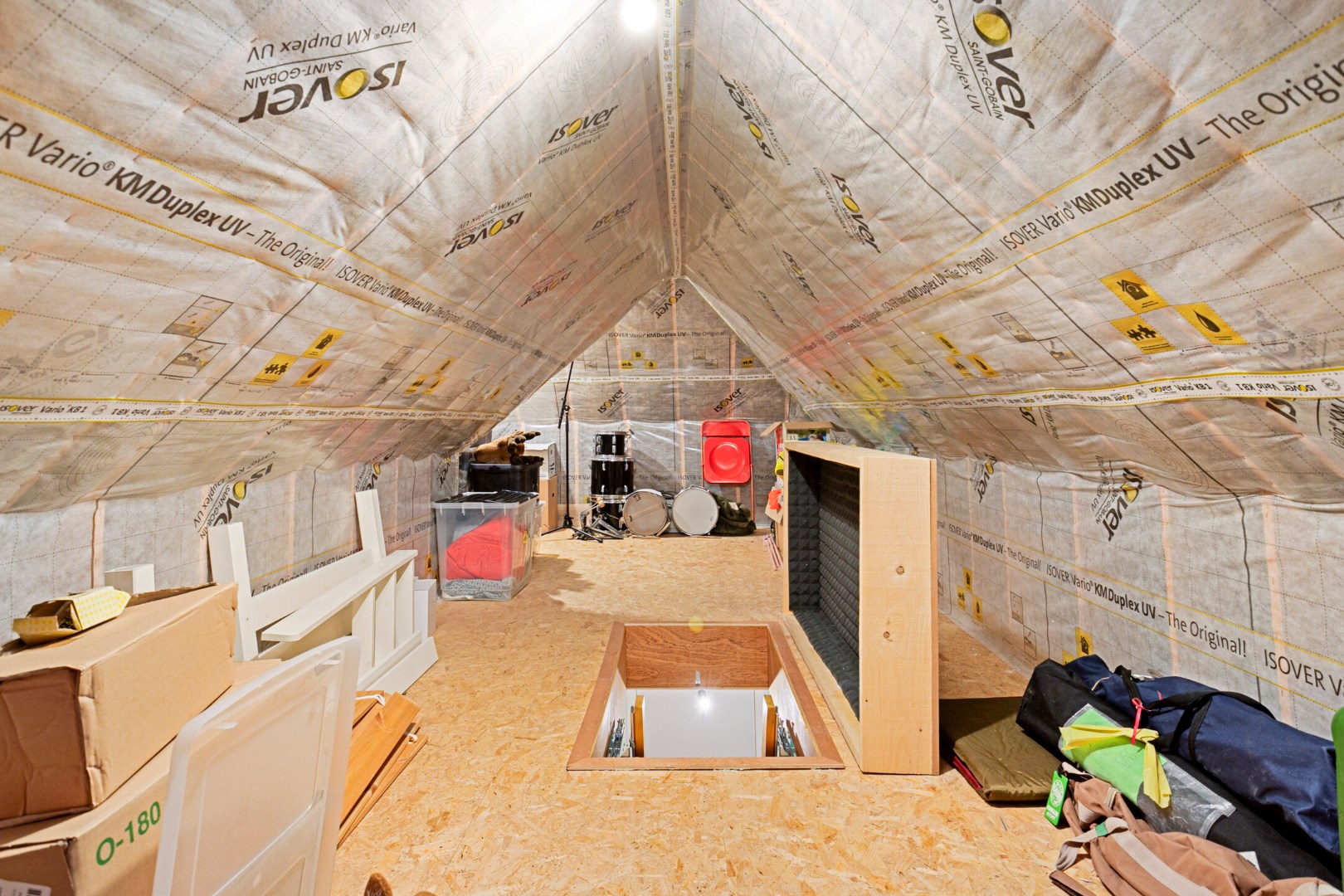 Via een valtrap kunnen we naar de zolder. Een ideale stockageplaats!