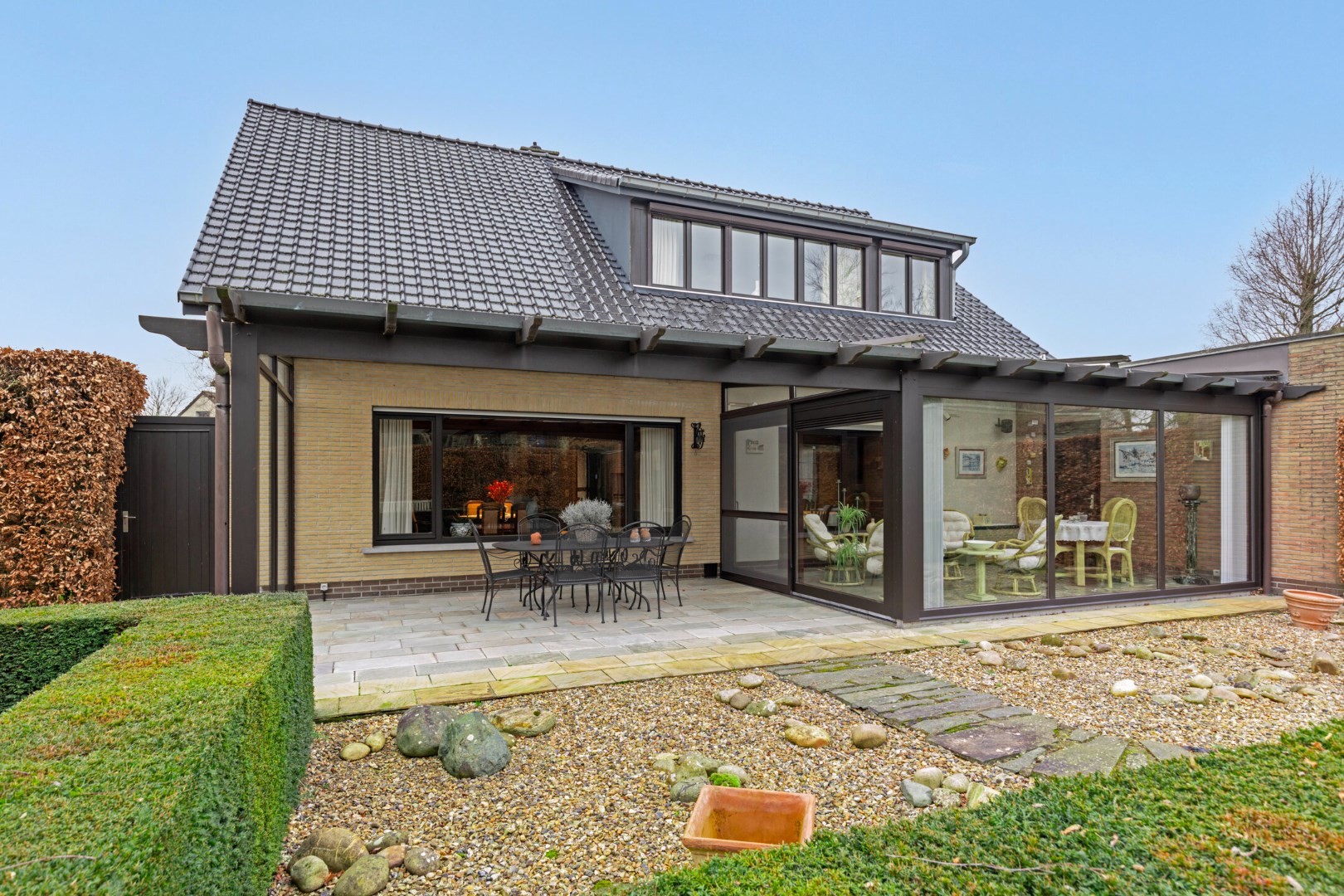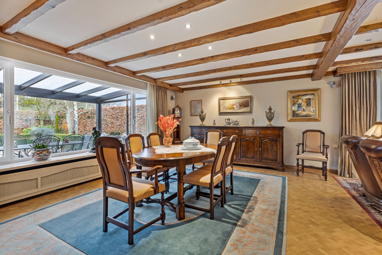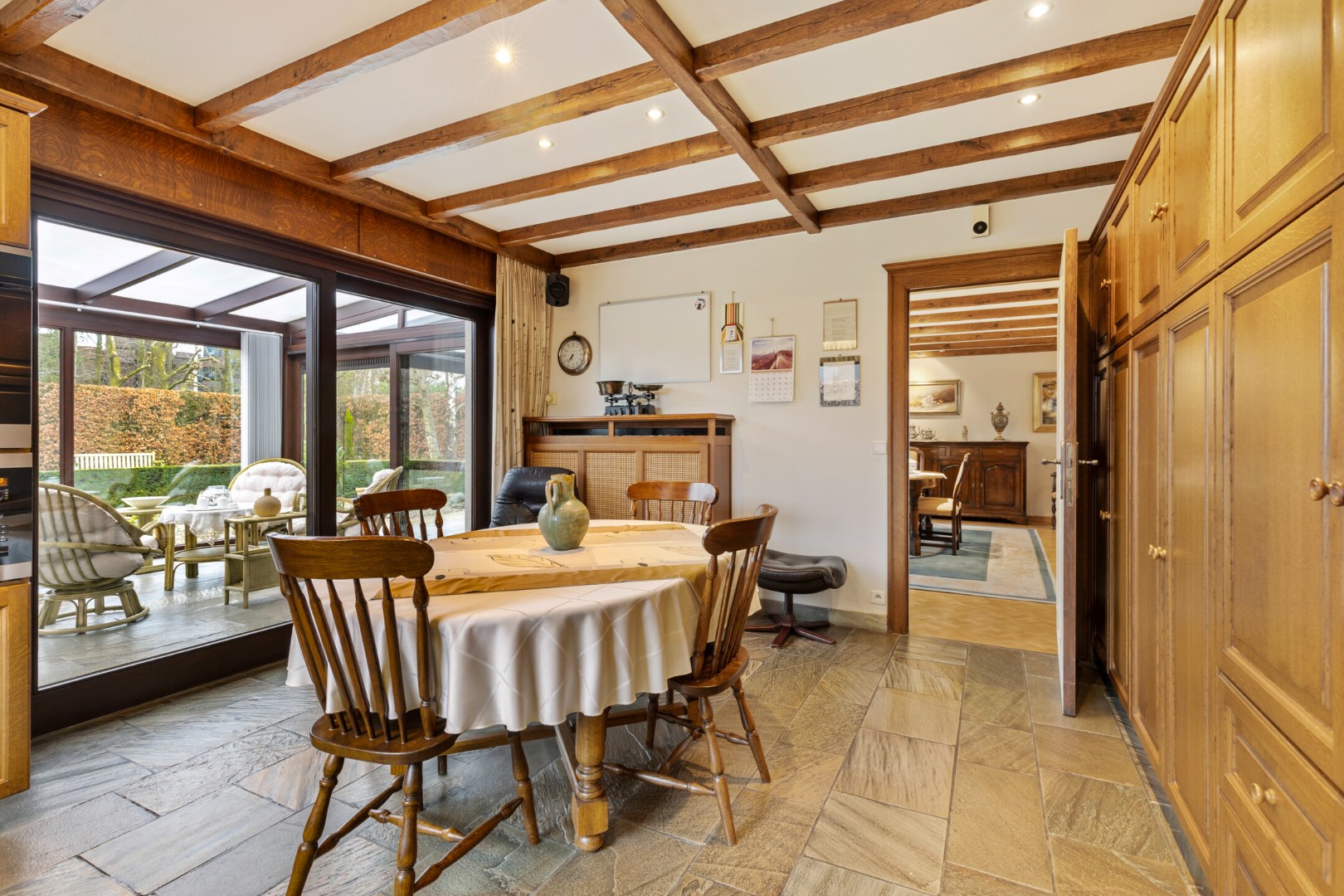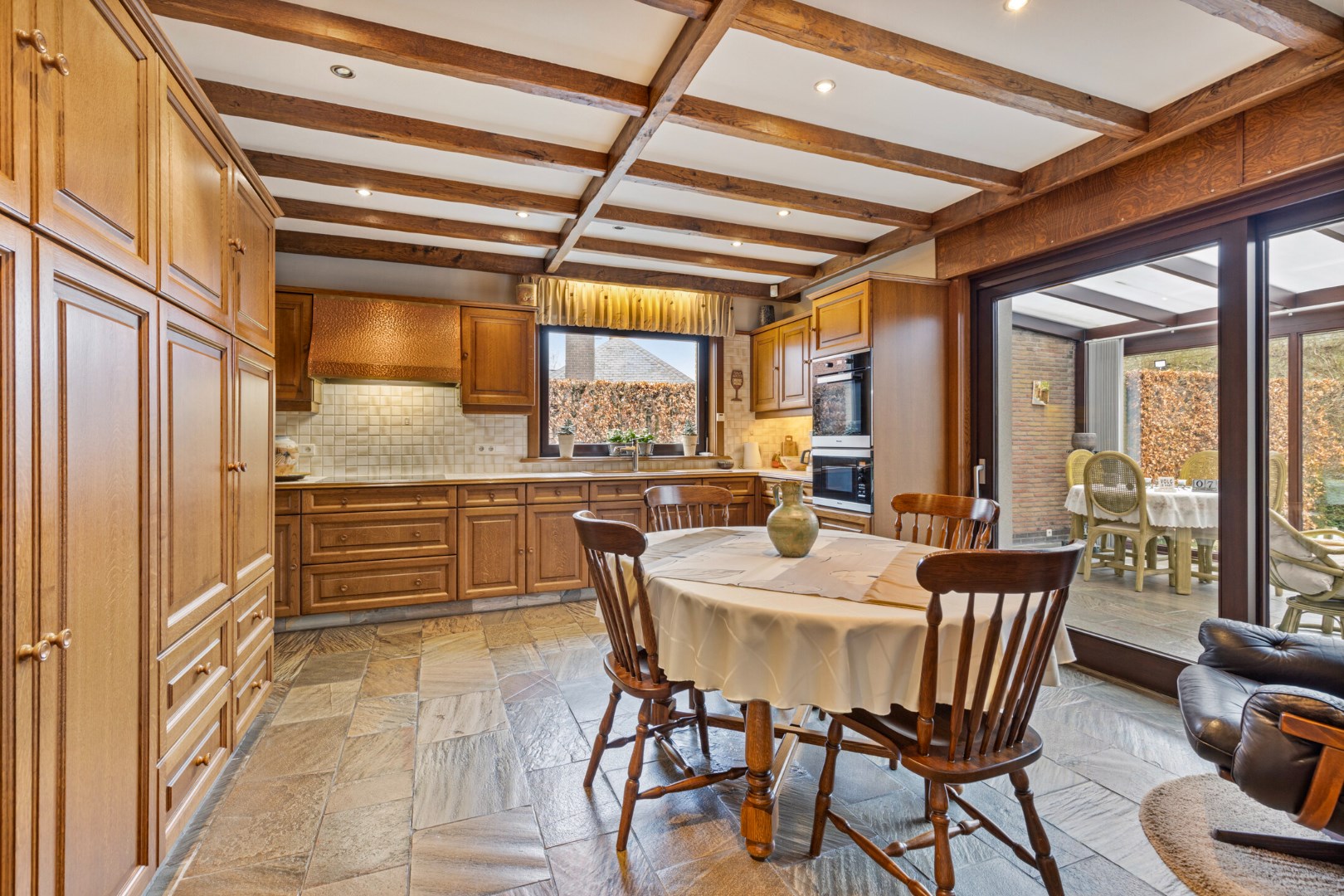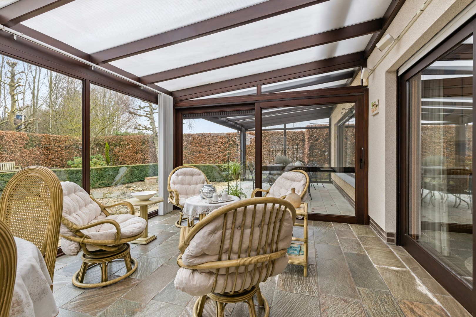 In de lente en zomer is het zalig vertoeven in de veranda met zicht op de mooie tuin.