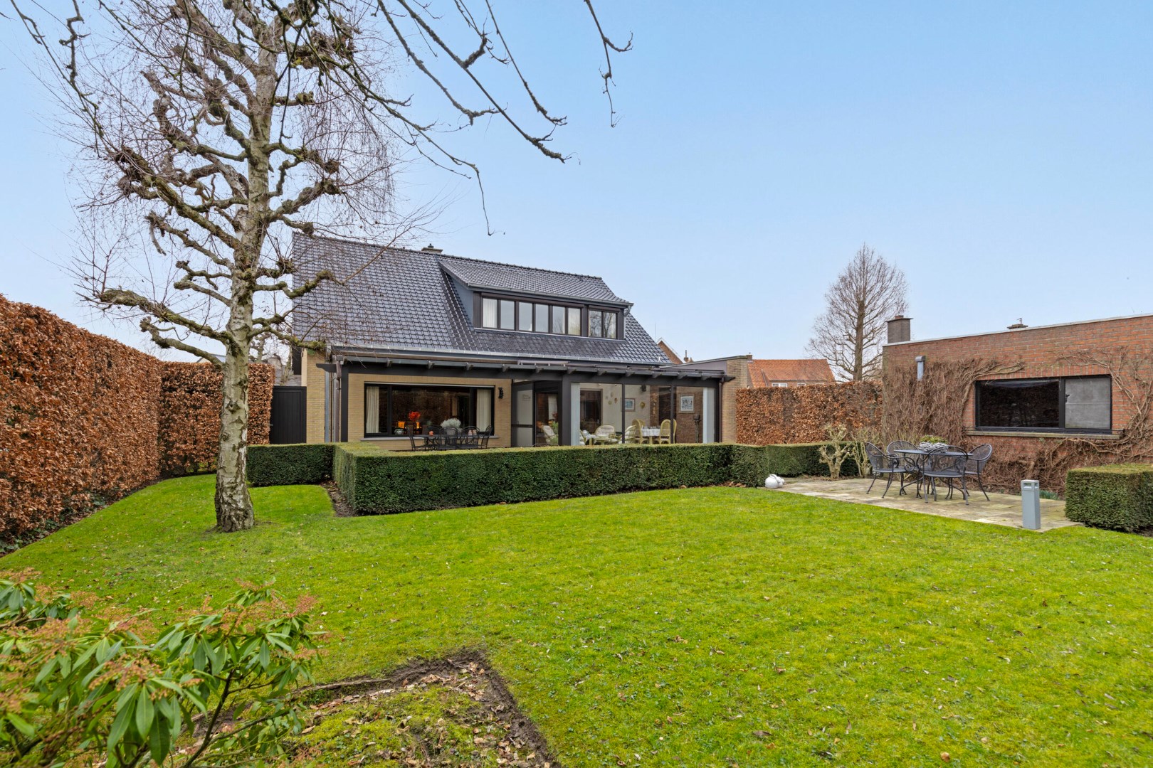De tuin is mooi aangelegd en heeft een perfecte zuidwest-oriëntatie. Met de vogeltjes op de achtergrond is het hier vanop het overdekt terras of de verschillende zitplaatsen in de tuin zalig genieten.