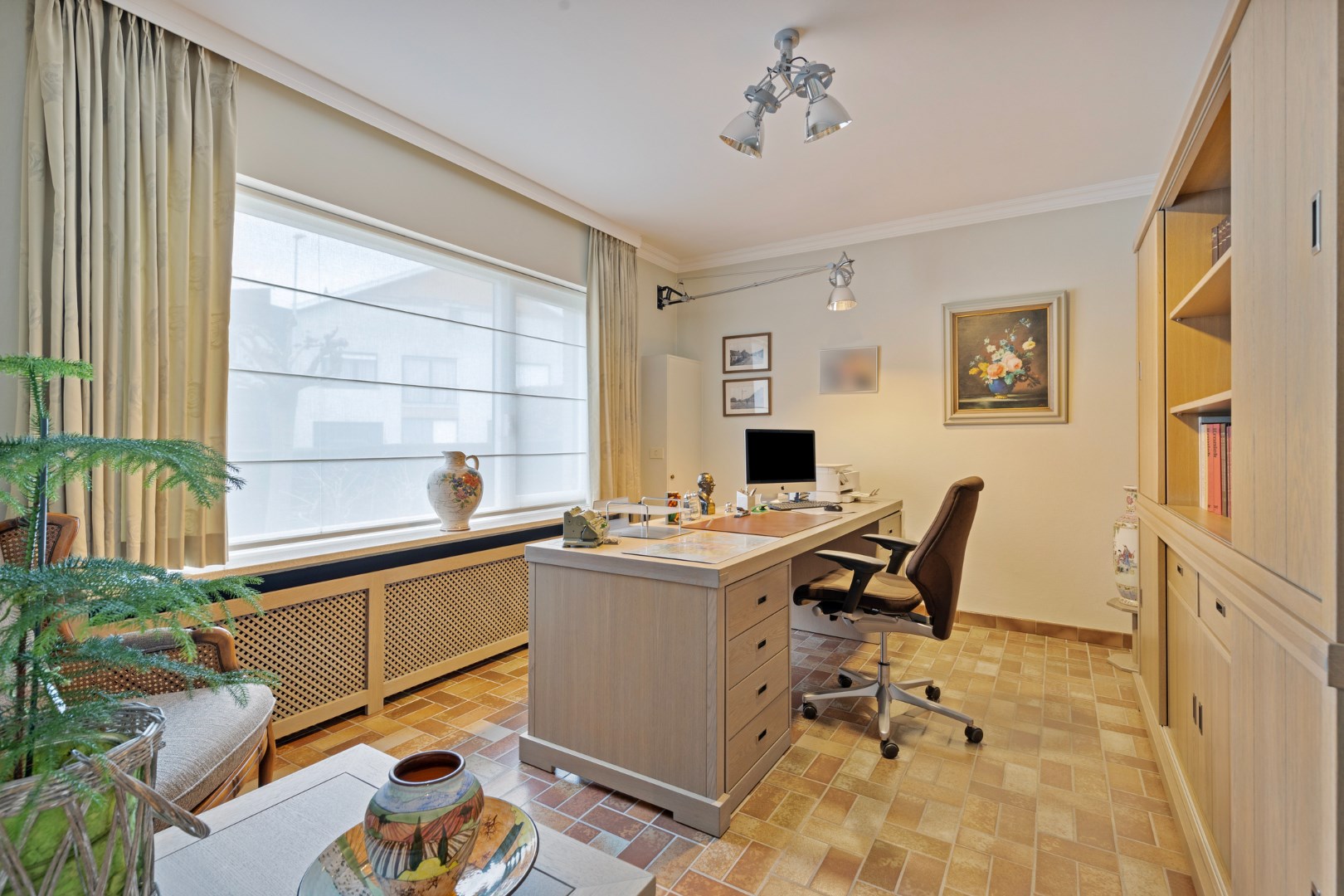 Vanuit de ruime inkomhal met gastentoilet en vestiaire hebben we toegang tot het gelijkvloers buro en de leefruimte. Het buro dat zich langs de voorzijde bevindt, kan eventueel ook dienst doen als slaapkamer.