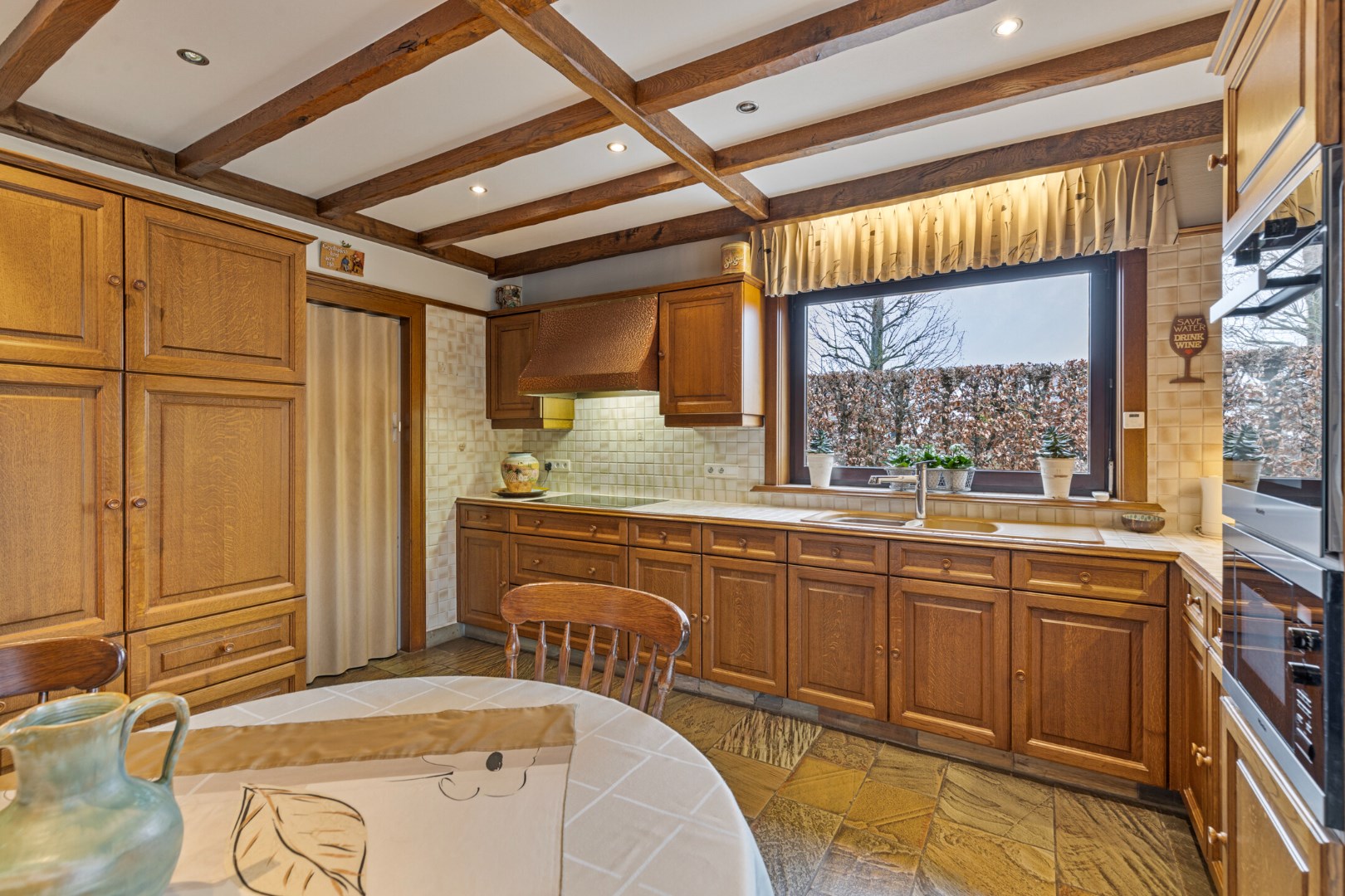 We stappen vervolgens verder naar de leefruimte die dankzij de vele ramen heel lichtrijk is en een schitterend zicht biedt op de tuin. De grote living met cassette straalt gezelligheid uit. Aanpalend is er de eveneens ruime keuken met een zee aan kastruimte. Naast de keuken bevindt zich een wasberging met toegang tot de kelder. De kelder is opdeeld in een voorraadruimte en een technische ruimte.