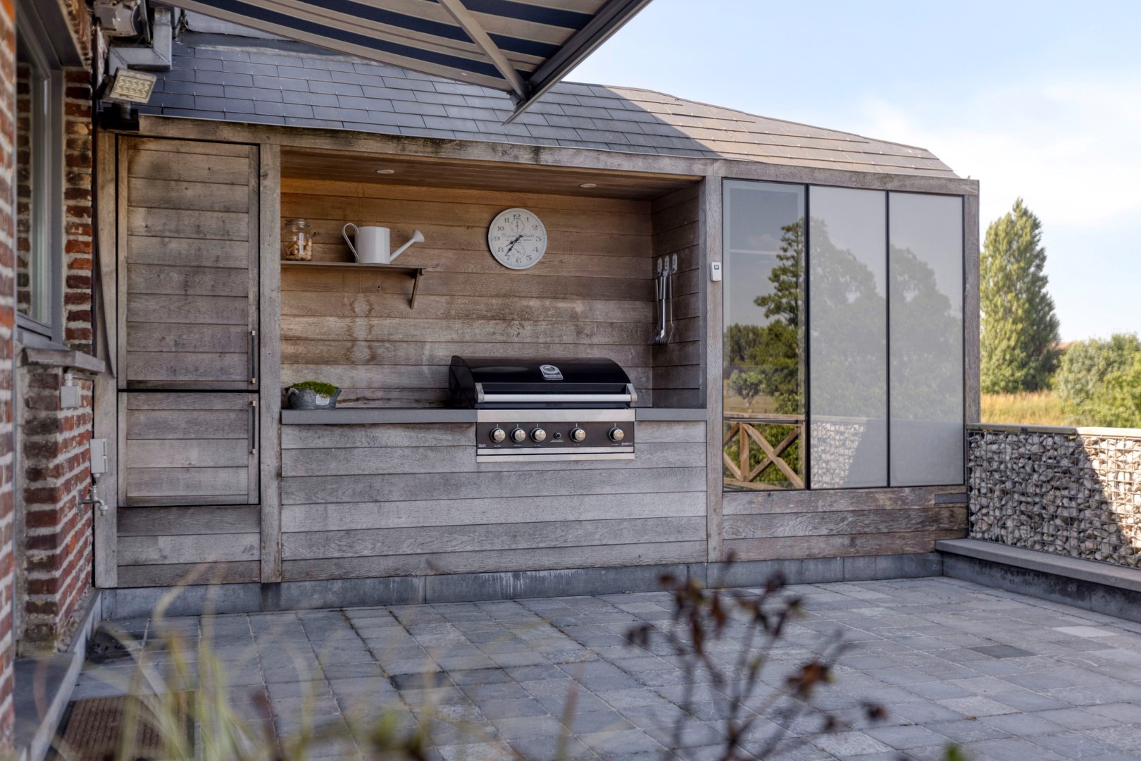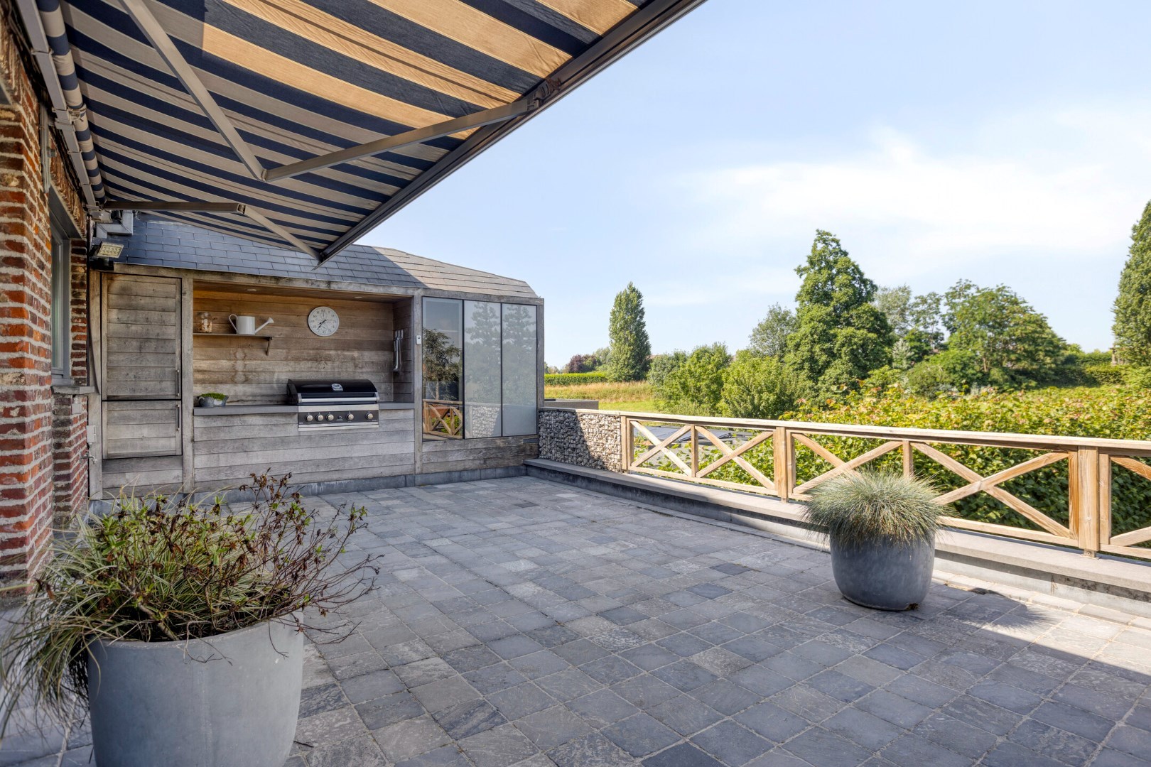 Op de 1e en 2e verdieping vinden we de woonst terug. Er is een prachtige, zeer ruime leefruimte met aangrenzend de keuken. We kunnen naar het gigantische terras met buitenkeuken. Van hieruit hebben we een mooi open zicht op de groene omgeving. Er is een trap die ons naar de mooie tuin leidt.