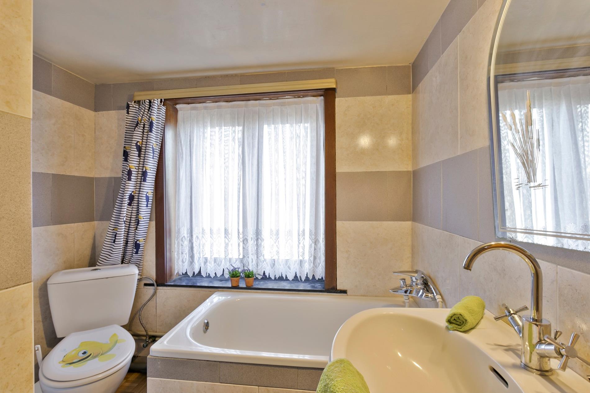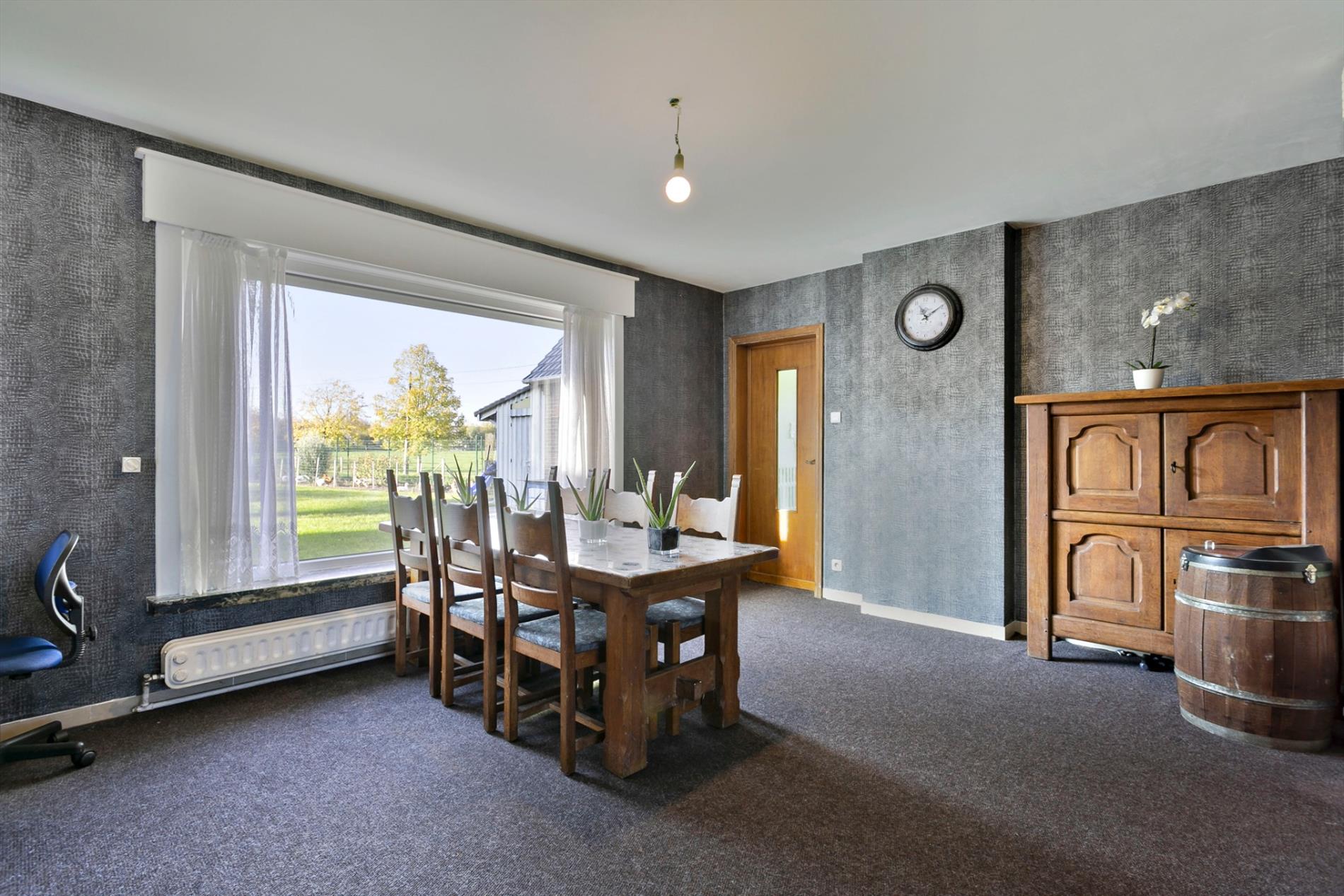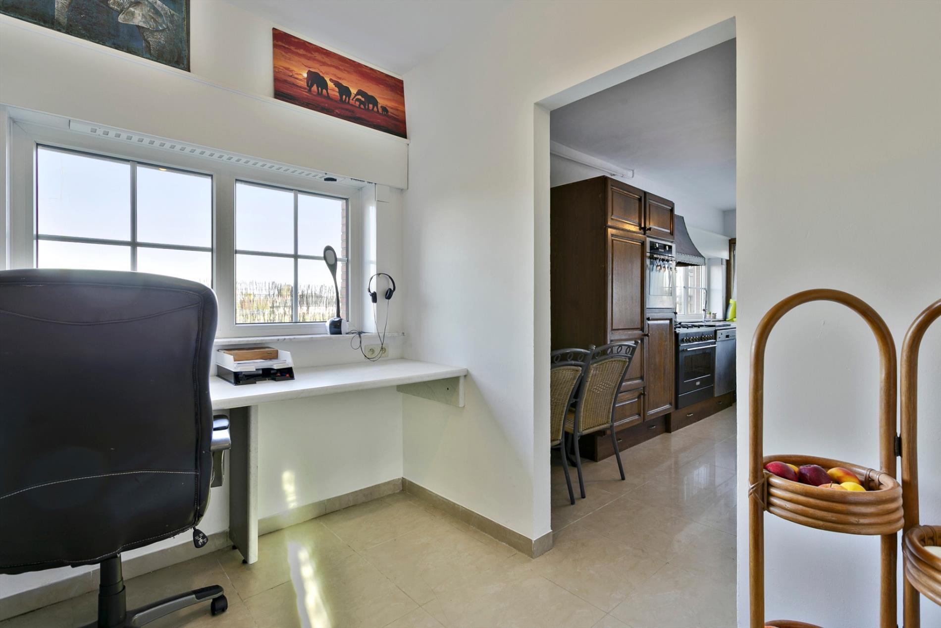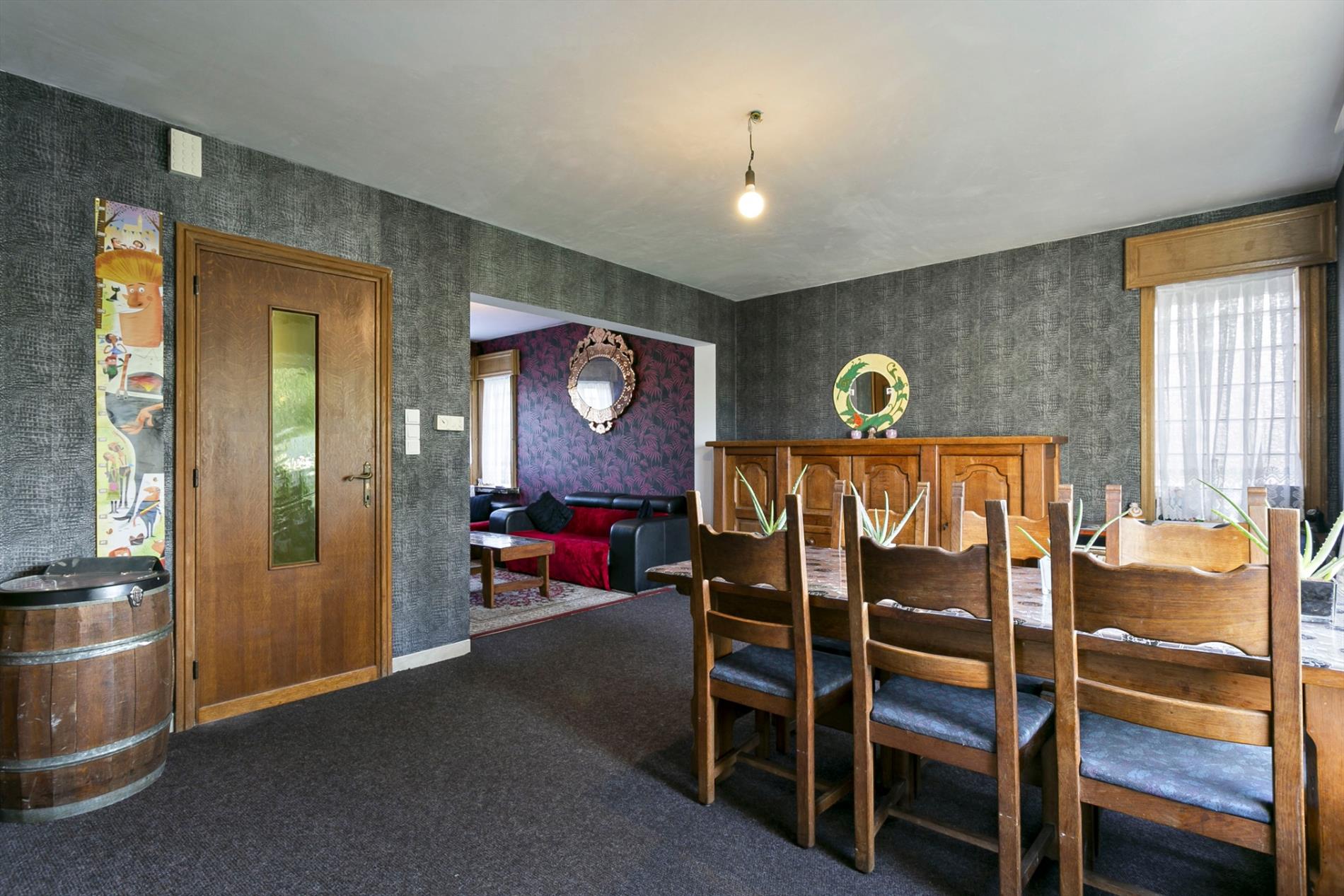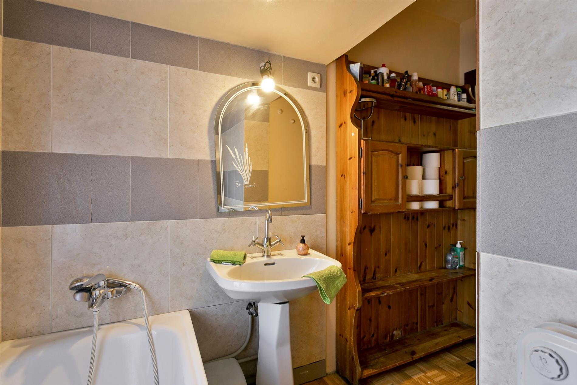 Via de voortuin stappen we naar de karaktervolle woning toe die gezelligheid uitstraalt. In de inkomhal vinden we een apart gastentoilet. We hebben toegang tot de leefruimte of de bovenverdieping. De leefruimte met salon is gezellig en lichtrijk. Er is een heel mooi zicht op de grote, zongerichte tuin. Naast de leefruimte vinden we een buroruimte of bijkeuken. Daarnaast vinden we de keuken terug. Vanuit de keuken kunnen we ook naar de droge en gerieflijke kelder.