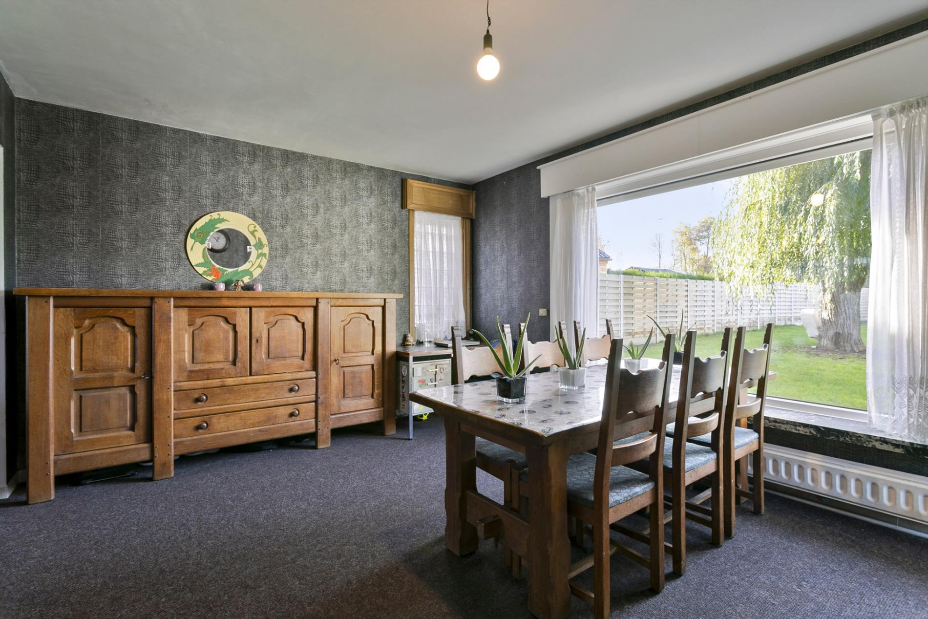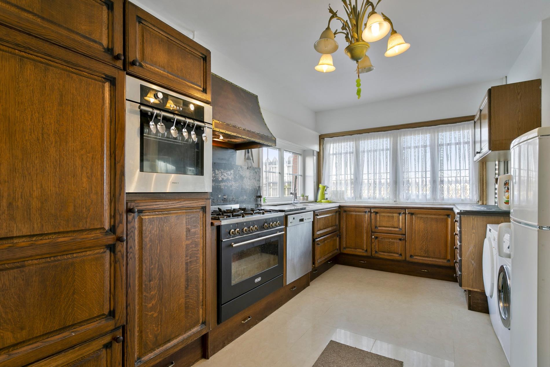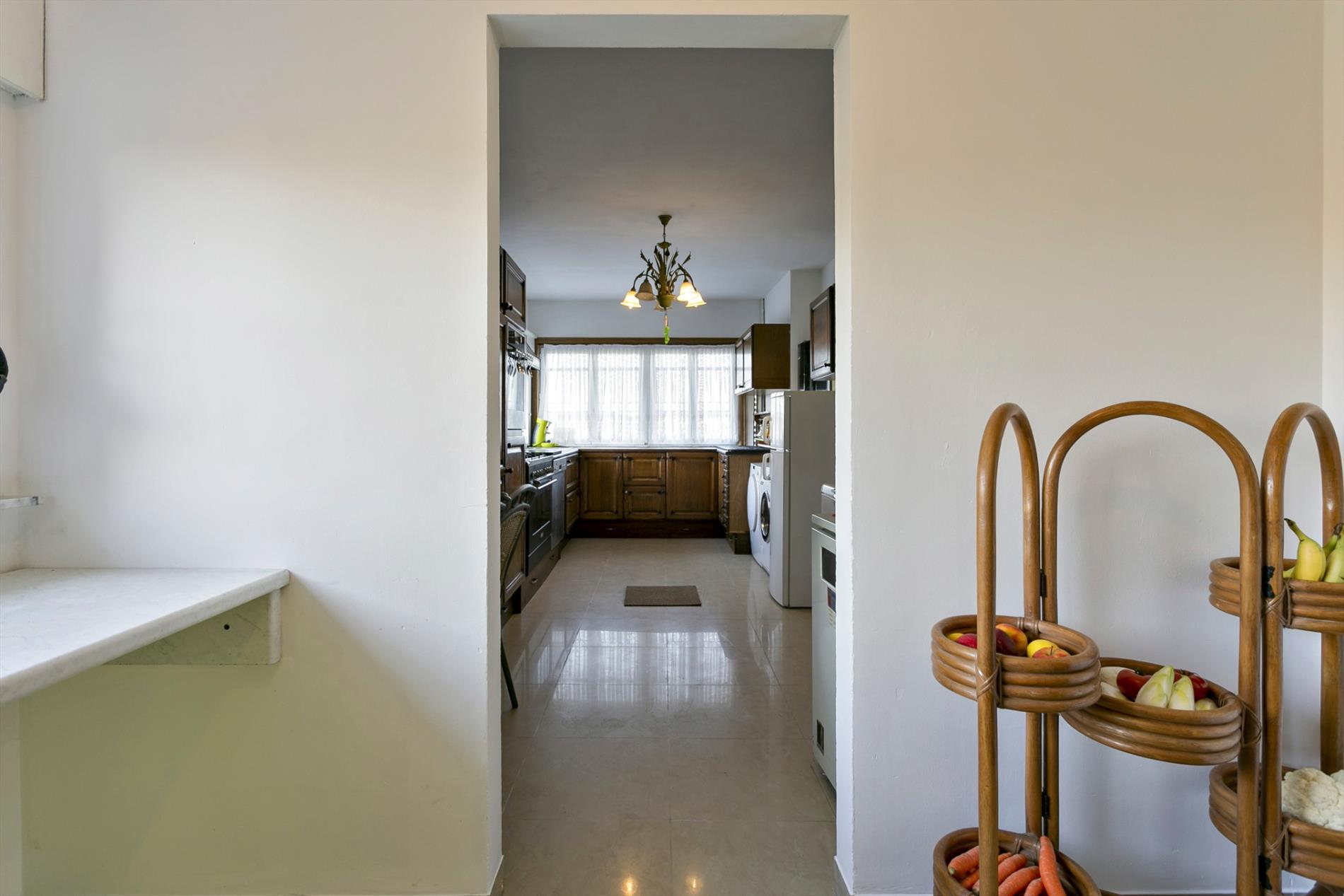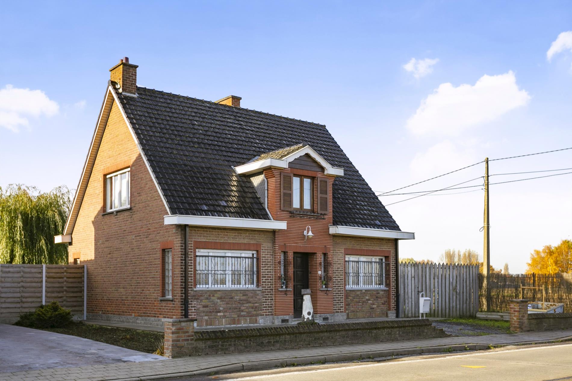 Via de voortuin stappen we naar de karaktervolle woning toe die gezelligheid uitstraalt. In de inkomhal vinden we een apart gastentoilet. We hebben toegang tot de leefruimte of de bovenverdieping. De leefruimte met salon is gezellig en lichtrijk. Er is een heel mooi zicht op de grote, zongerichte tuin. Naast de leefruimte vinden we een buroruimte of bijkeuken. Daarnaast vinden we de keuken terug. Vanuit de keuken kunnen we ook naar de droge en gerieflijke kelder.