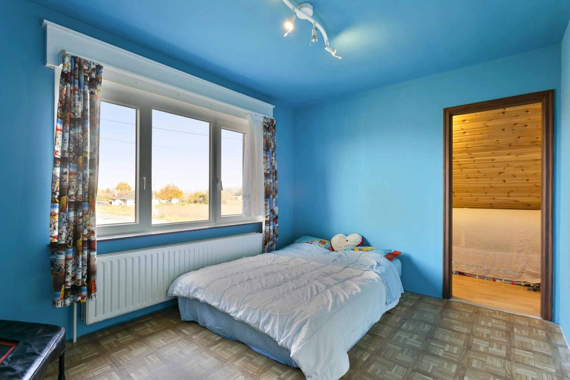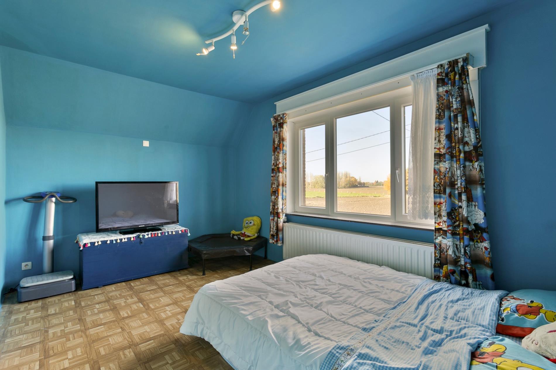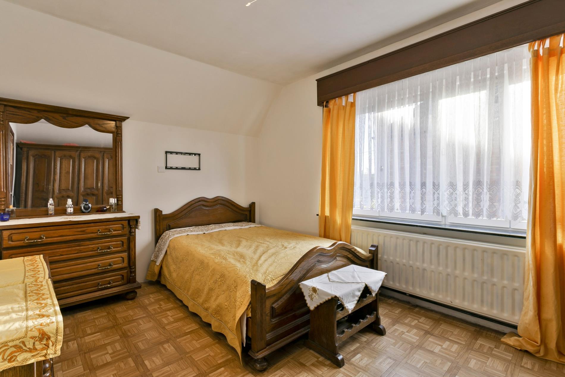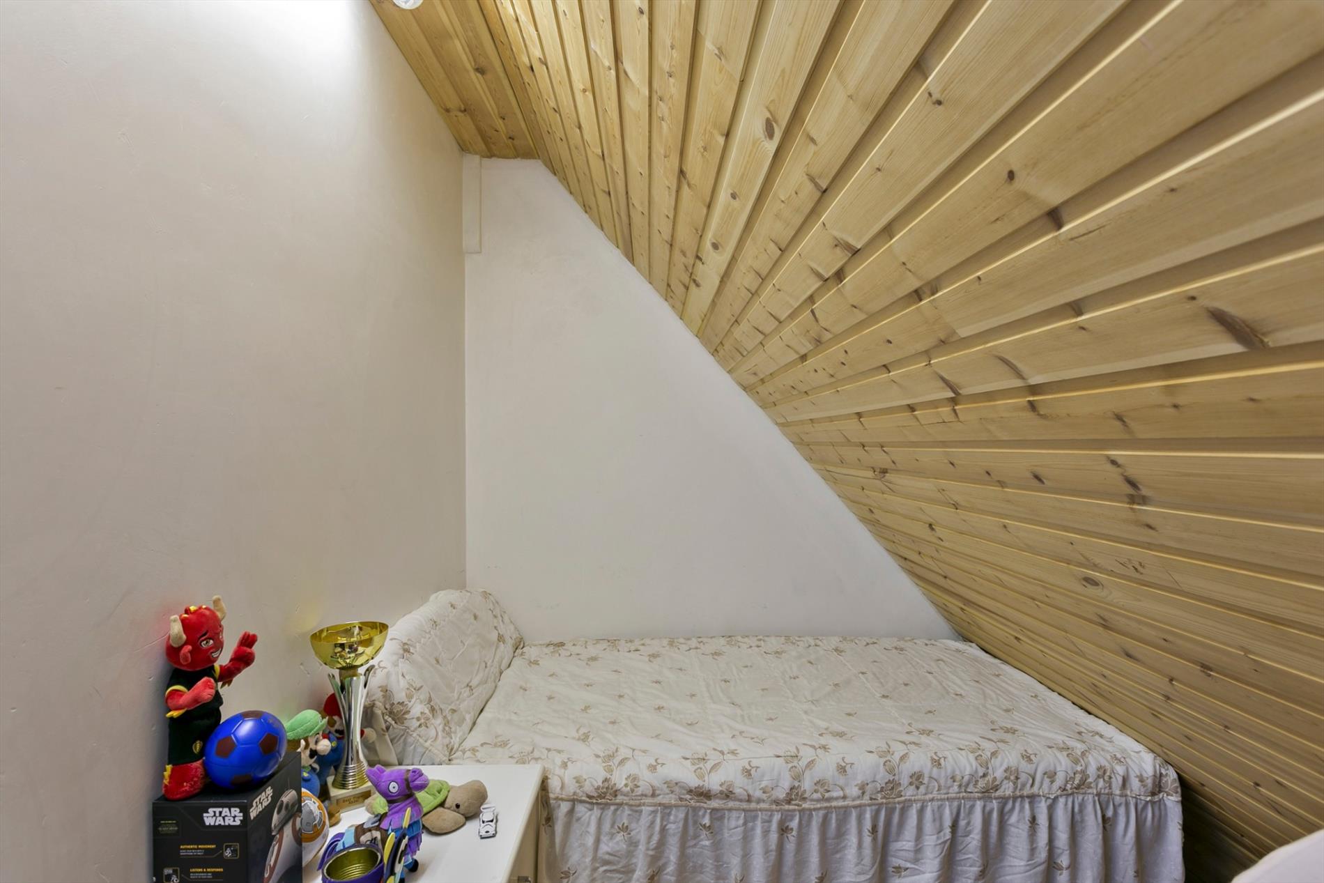 Op de bovenverdieping zijn er 3 slaapkamers en nog een 4e kamer die kan dienst doen als dressing of burootje. In iedere kamer is alle ruimte benut. De schuine wanden onder het dak doen er telkens dienst als berging. Langs de voorzijde is er een badkamer met lavabo, bad en toilet.