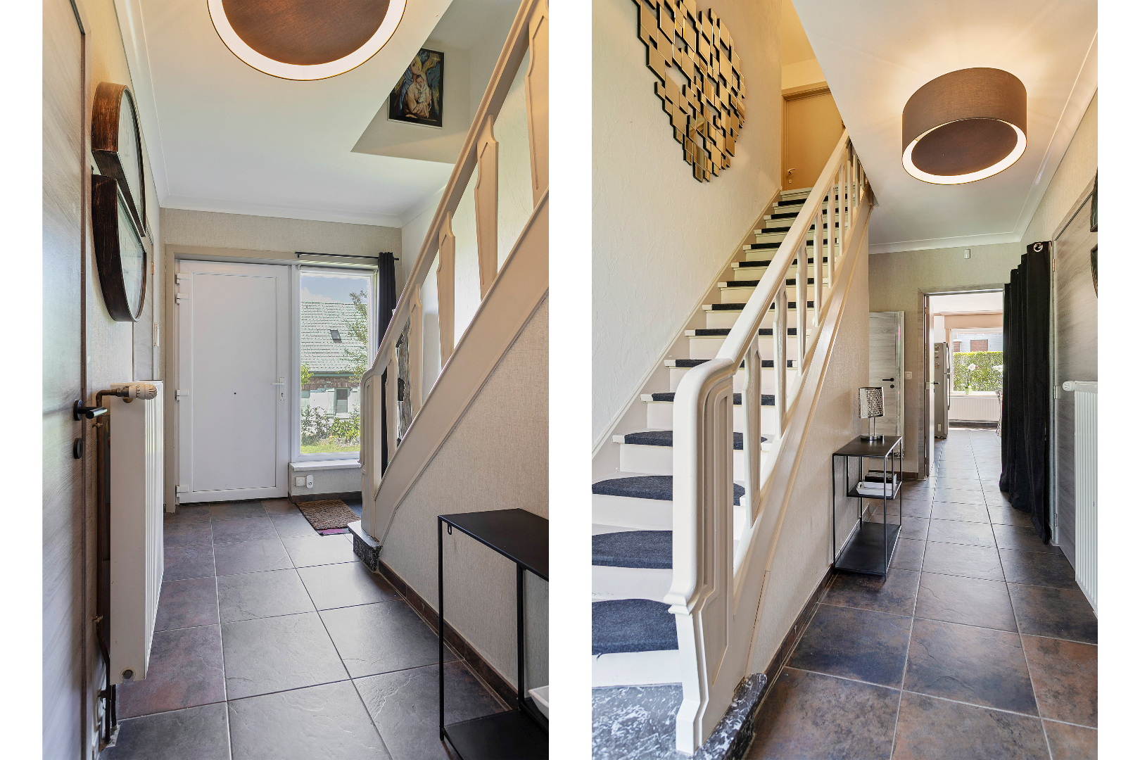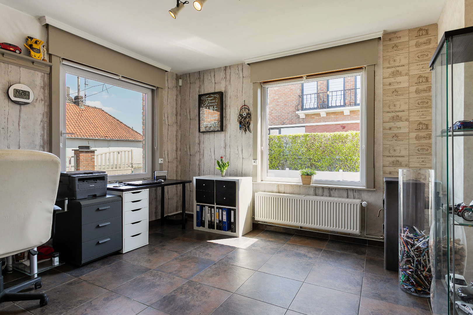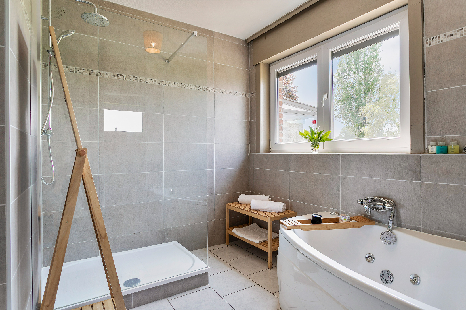 Via de inkomhal hebben we toegang tot alle ruimtes op de benedenverdieping. Langs de voorzijde van het huis bevinden zich het salon en het buro. Langs de achterzijde komen we in de keuken. Vanuit de keuken met kook- en eeteiland hebben we een fantastisch zicht op de tuin. Er is gelijkvloers ook nog een gastentoilet en de recent vernieuwde badkamer met bubbelbad, inloopdouche en dubbele lavabo.