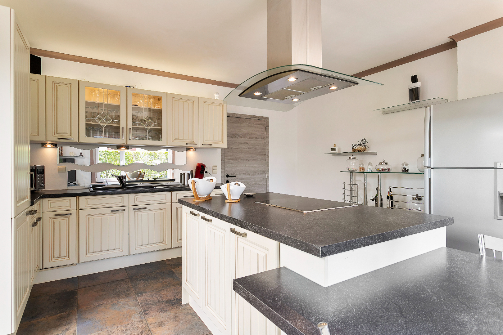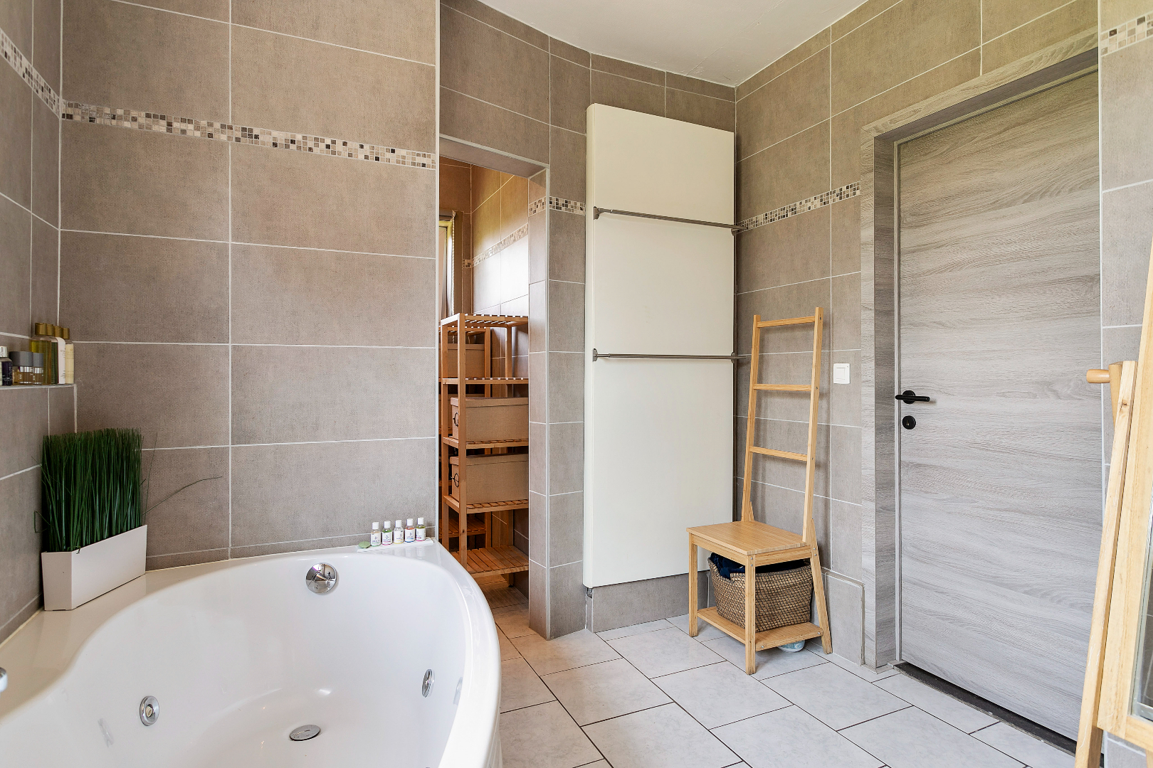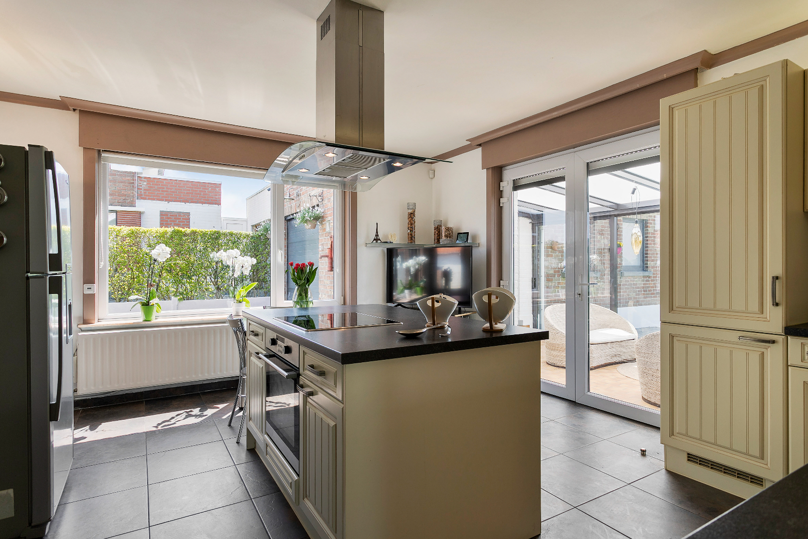 Via de inkomhal hebben we toegang tot alle ruimtes op de benedenverdieping. Langs de voorzijde van het huis bevinden zich het salon en het buro. Langs de achterzijde komen we in de keuken. Vanuit de keuken met kook- en eeteiland hebben we een fantastisch zicht op de tuin. Er is gelijkvloers ook nog een gastentoilet en de recent vernieuwde badkamer met bubbelbad, inloopdouche en dubbele lavabo.