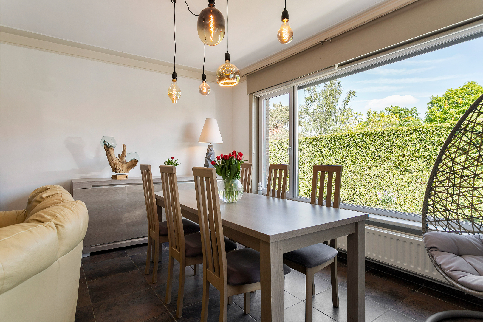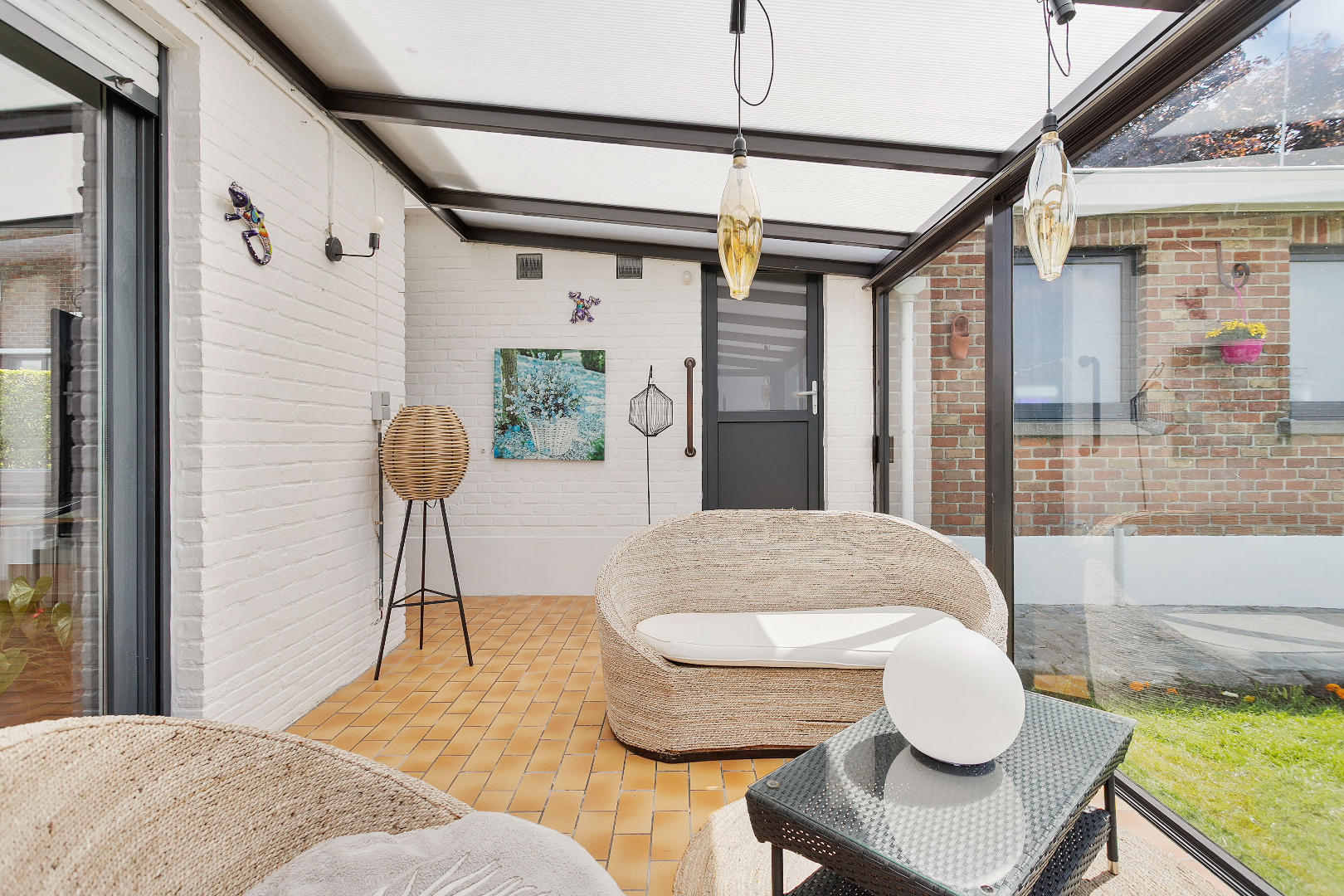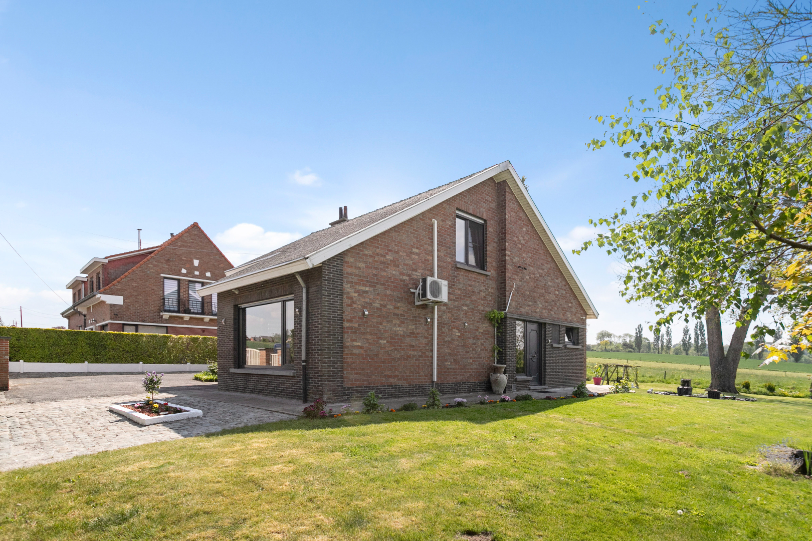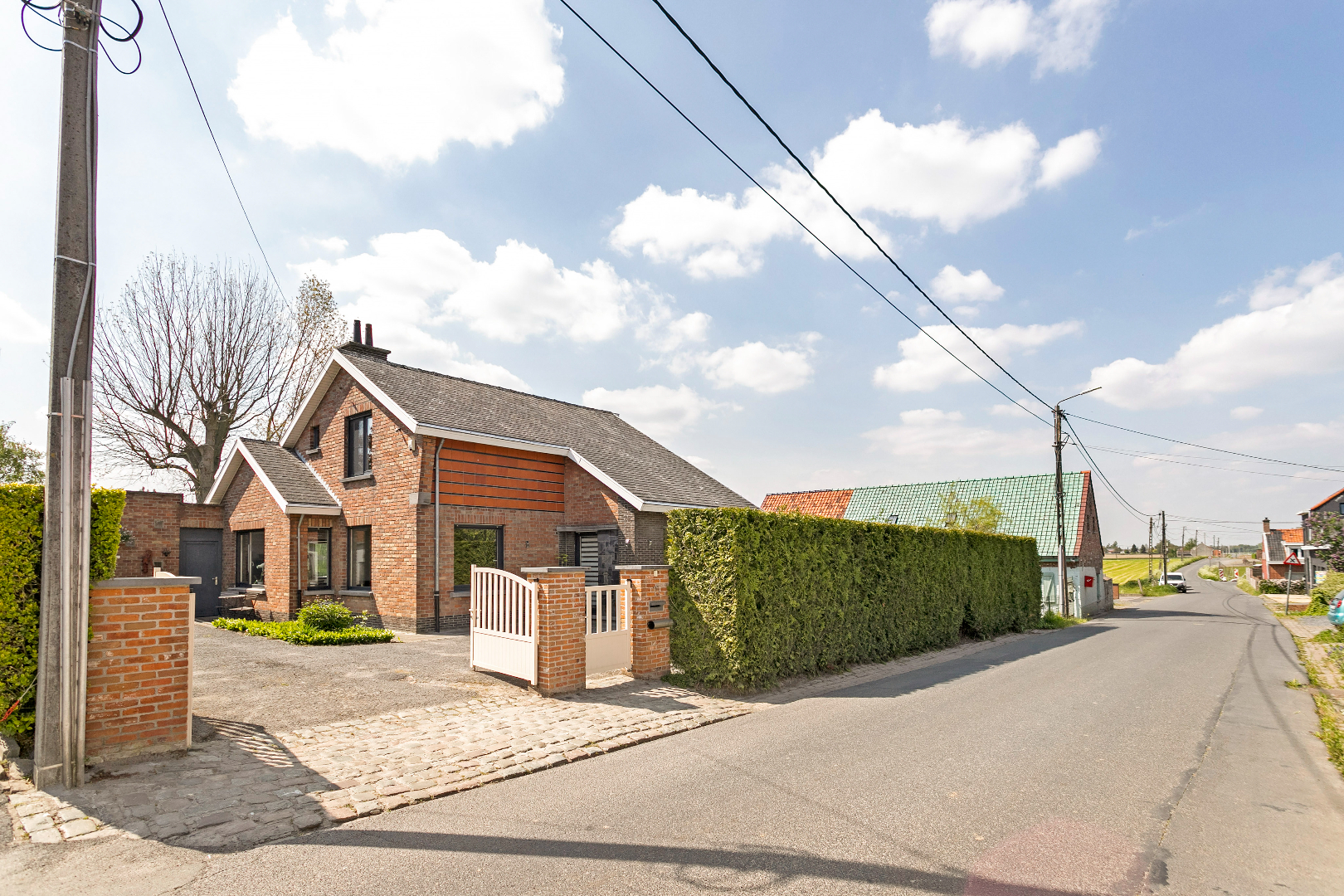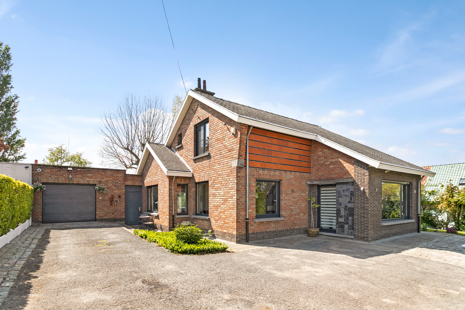 Via een rustige weg met een handvol huizen rijden we deze woning tegemoet. We stappen doorheen het mooie hekken het eigendom binnen. De wagen kunnen we meteen binnenrijden in de ruime garage of op de oprit plaatsen. De garage is uitgerust met een elektrische sectionaalpoort en biedt voldoende plaats voor fietsen en een wasmachine/droogkast. Langs de zijgevel stappen we de woning binnen. Bij de voordeur gekomen, valt ons meteen het adembenemend zicht op de tuin en de omgeving op.