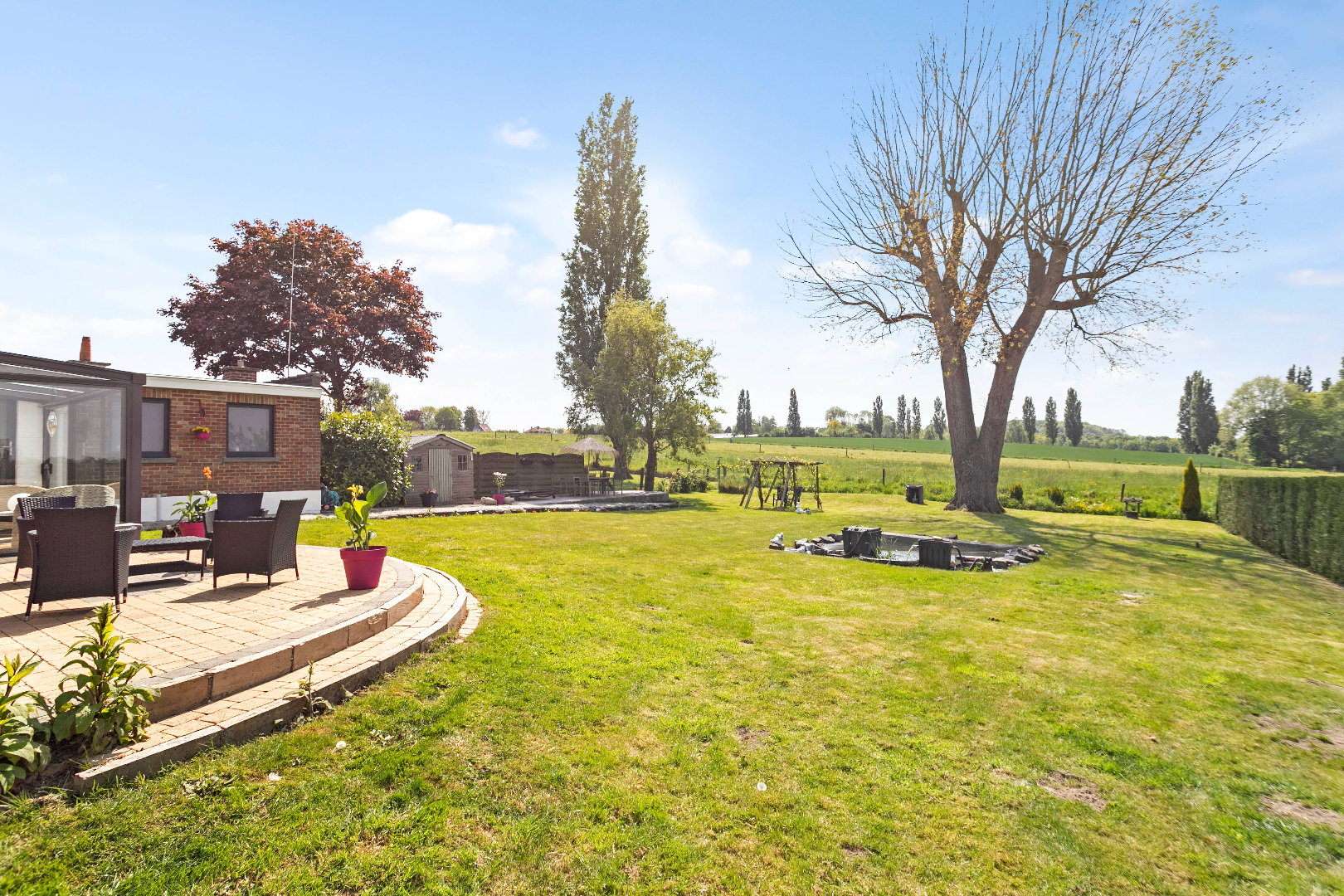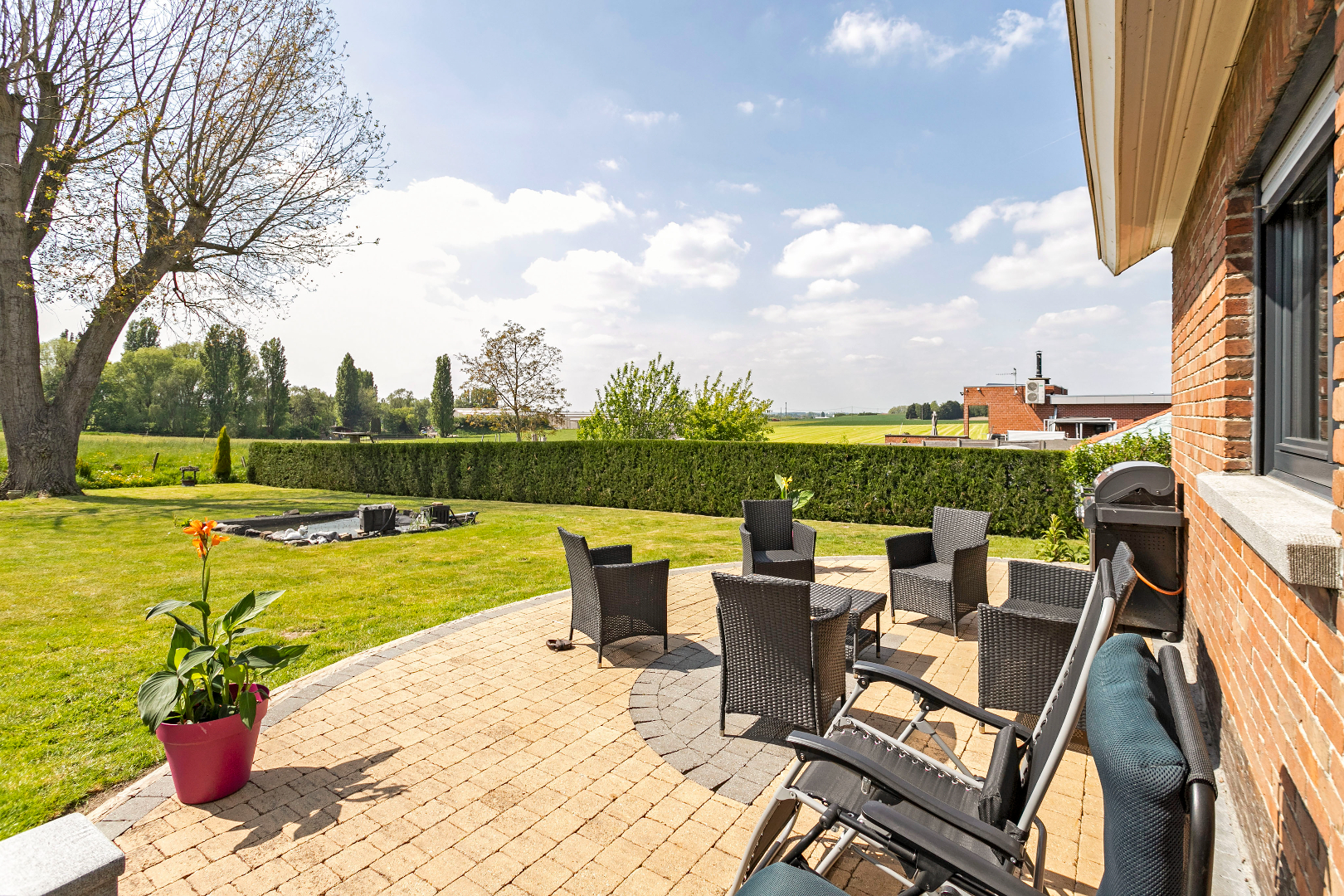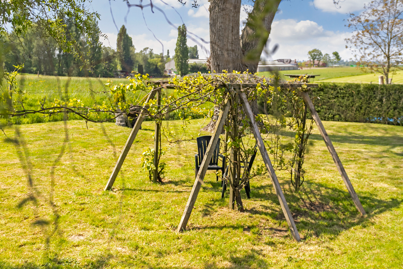 Nadat u de vele kois in de vijver heeft bewonderd wandelt u rustig verder naar het 2e terras achteraan of u nestelt zich gezellig met een glaasje onder de druivelaar. Materiaal opbergen kan in het tuinhuis. Achteraan de tuin is er een echte jarenoude sprookjesboom met een omtrek van ettelijke meters. Met de rug hiertegen geleund, geniet u van het weidse uitzicht. Mooier kan echt niet meer!