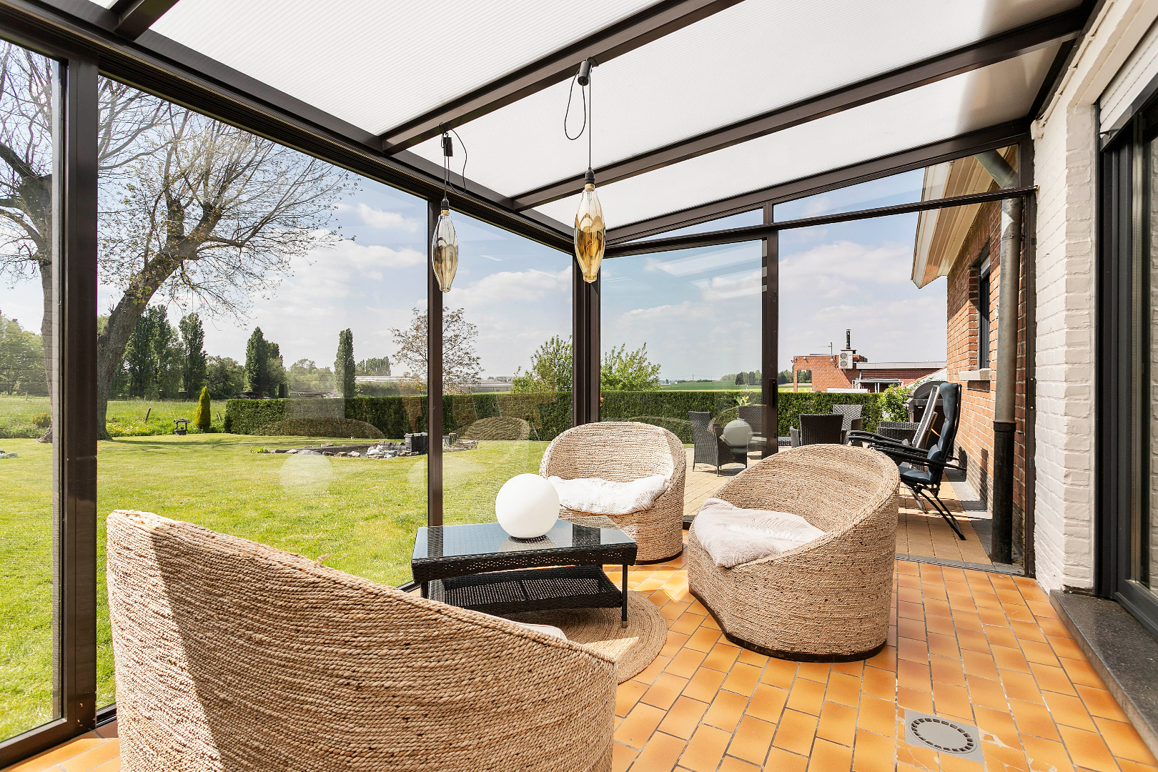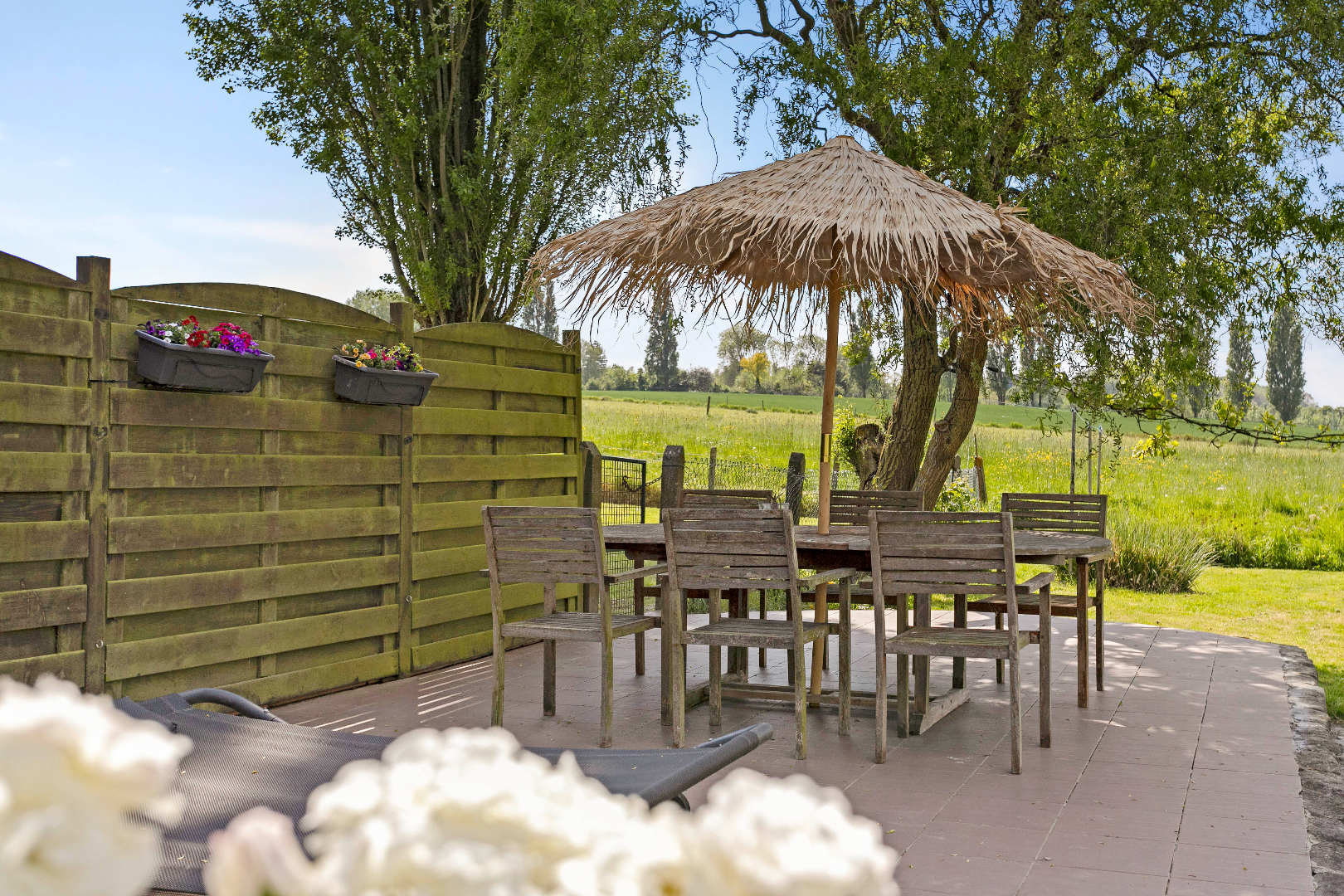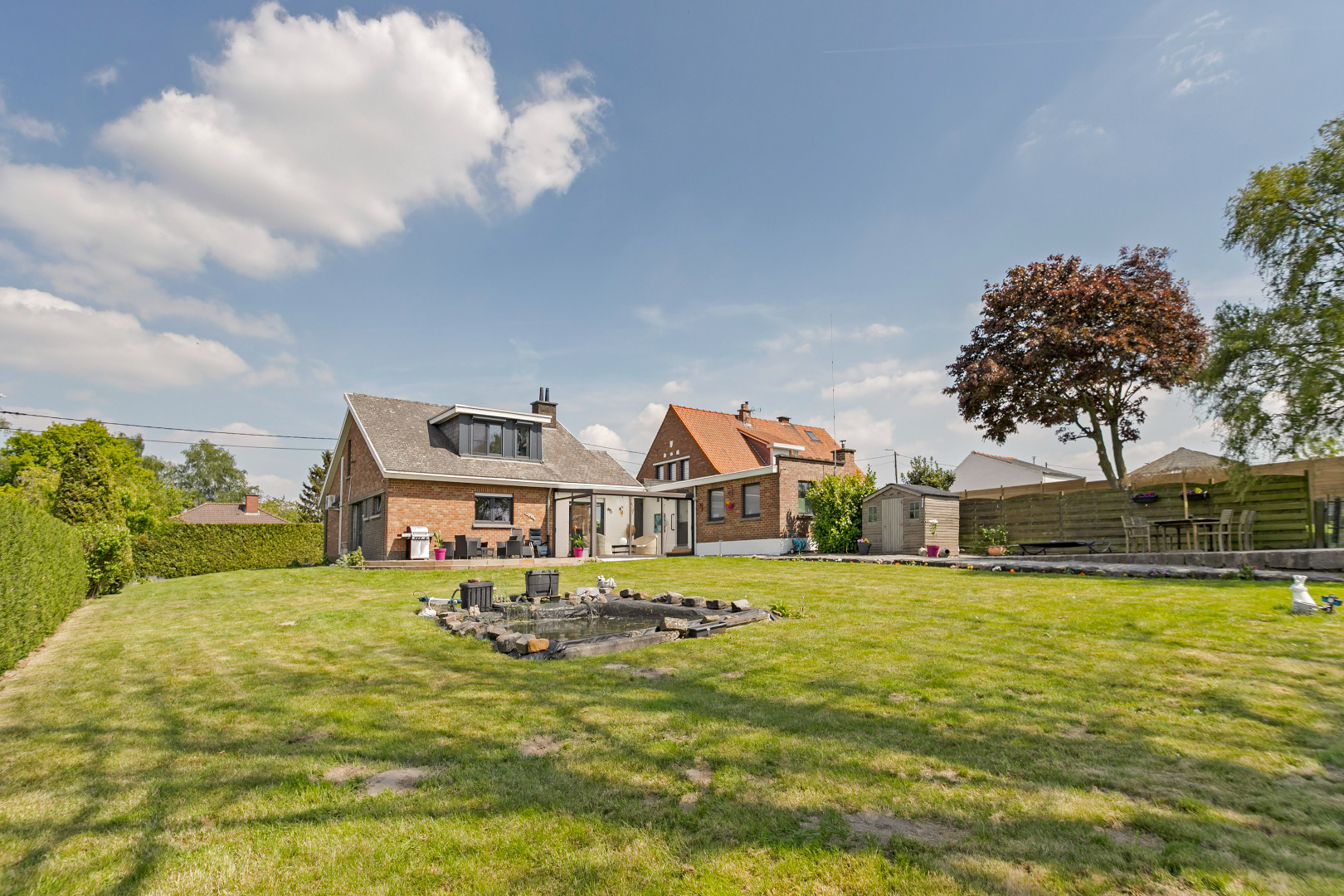 Nadat u de vele kois in de vijver heeft bewonderd wandelt u rustig verder naar het 2e terras achteraan of u nestelt zich gezellig met een glaasje onder de druivelaar. Materiaal opbergen kan in het tuinhuis. Achteraan de tuin is er een echte jarenoude sprookjesboom met een omtrek van ettelijke meters. Met de rug hiertegen geleund, geniet u van het weidse uitzicht. Mooier kan echt niet meer!