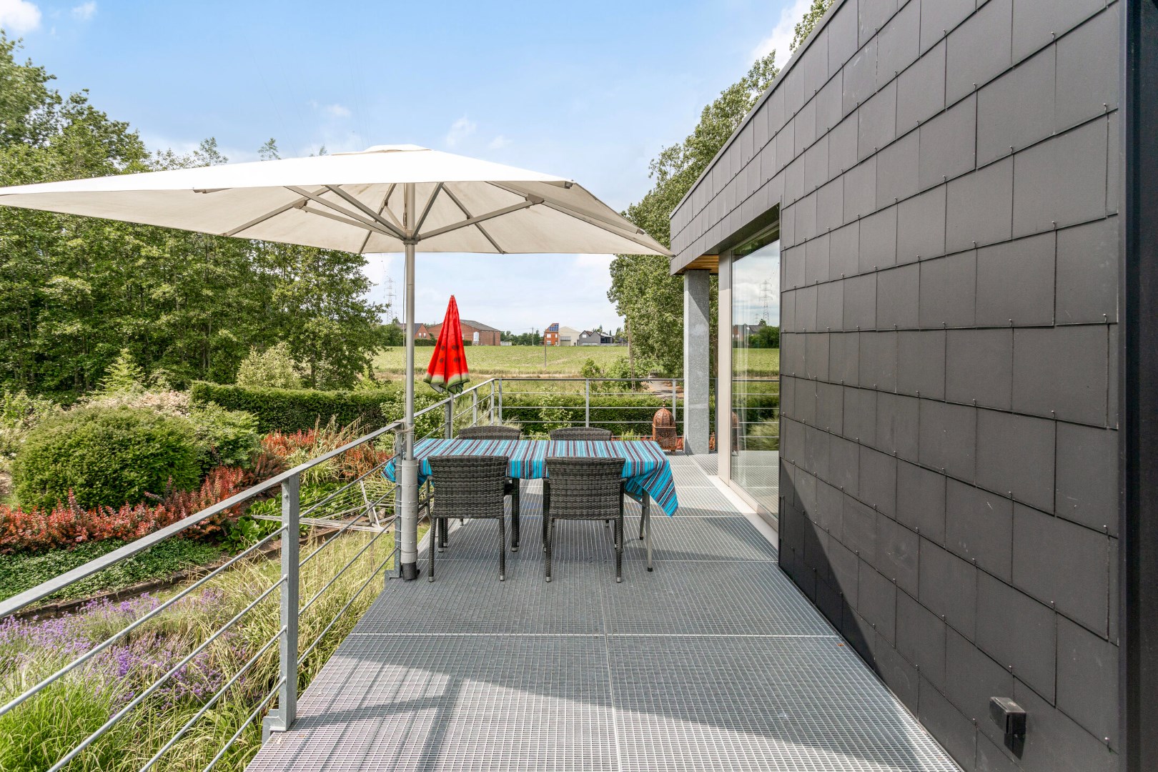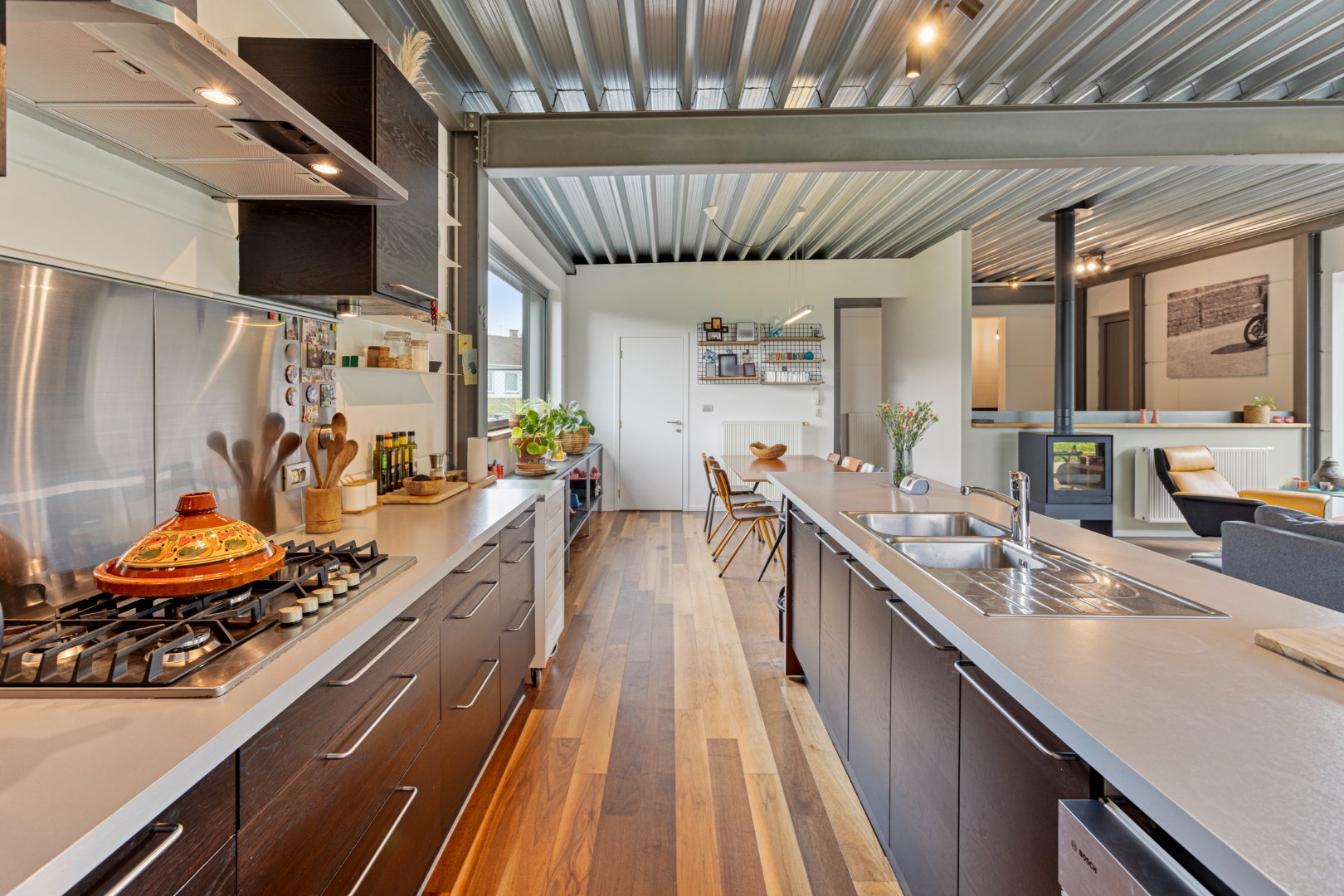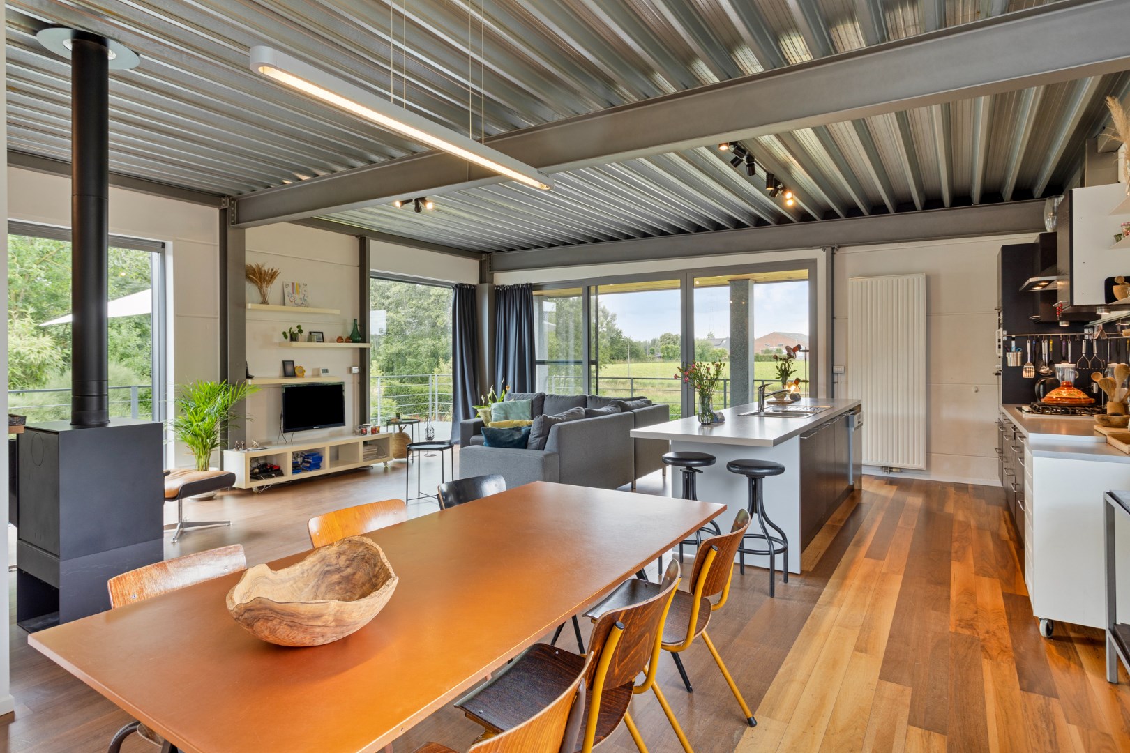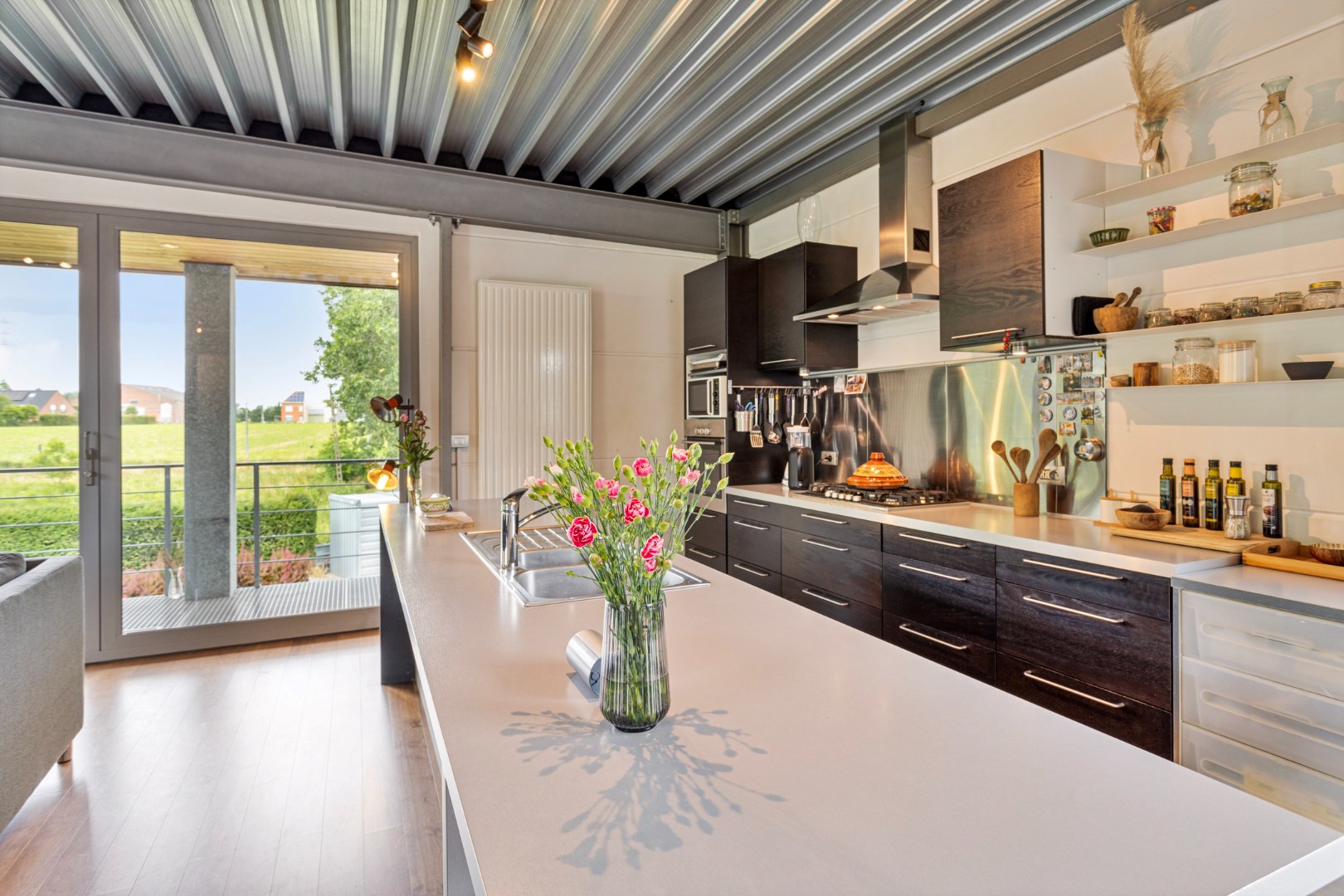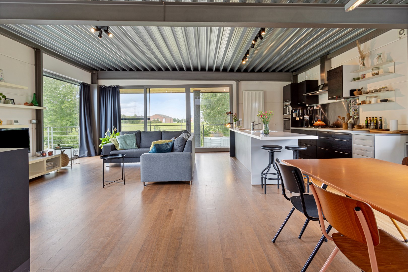 In de leefruimte komt u werkelijk helemaal tot rust. Door de vele raampartijen heeft u het gevoel buiten te leven. Vanop de sofa of terwijl u kokkerelt kijkt u uit over de beekvallei en de weelderige tuin. Als u het schuifraam opent, haalt u de groene omgeving helemaal binnen.