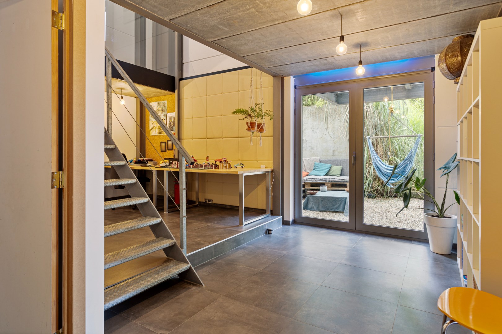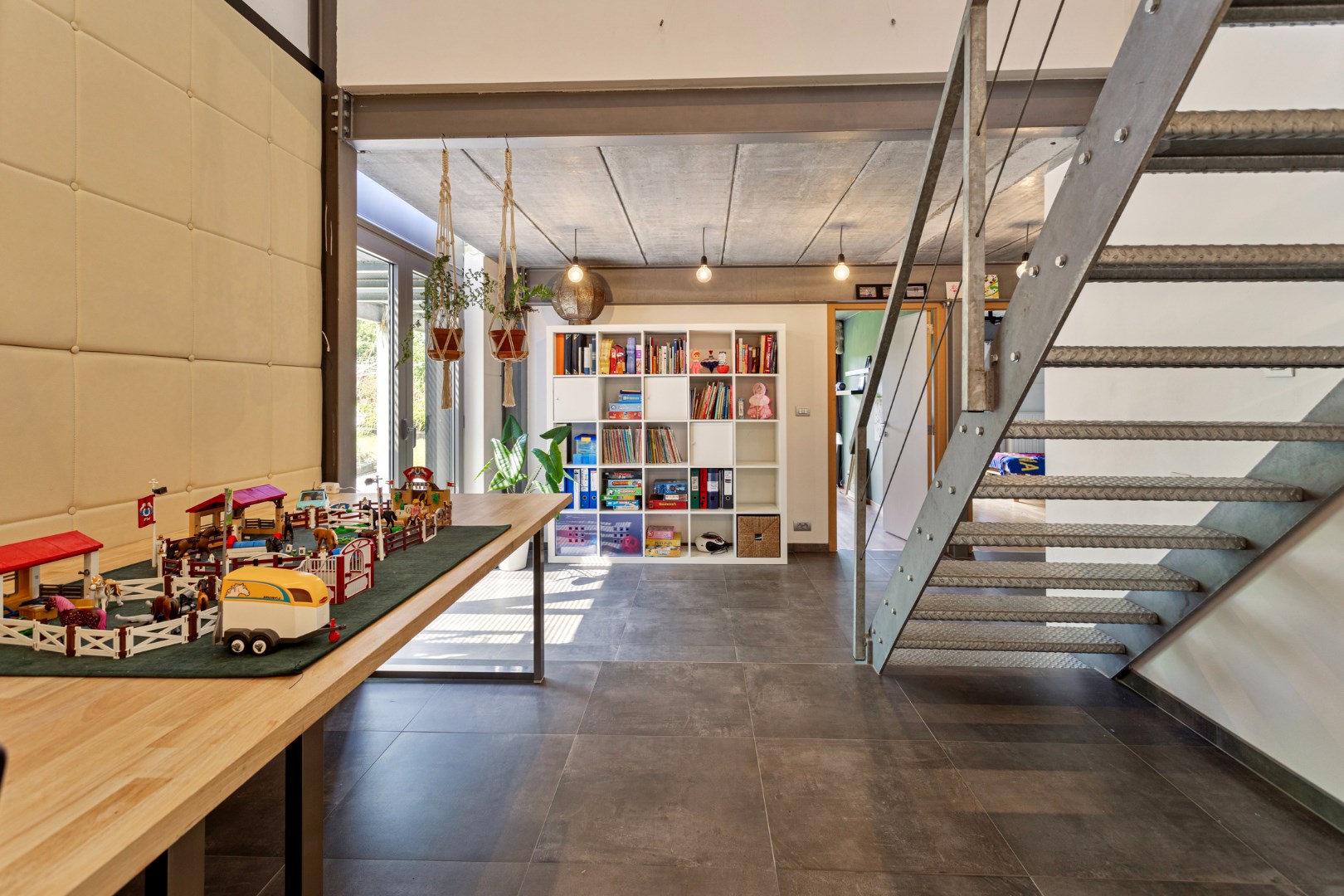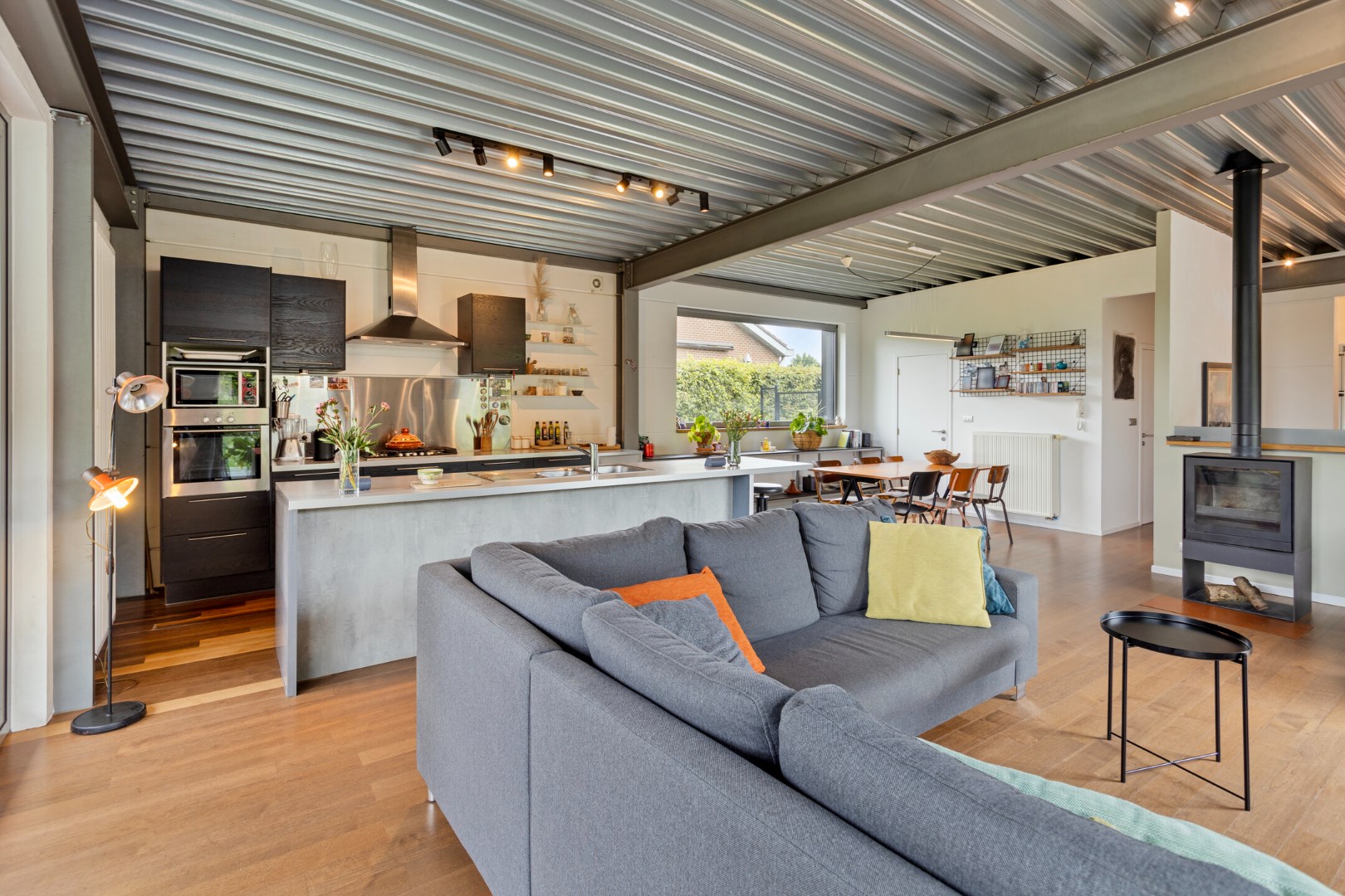 We parkeren de wagen op de ruime oprit of in de garage. De ingang van de woning bevindt zich langs de zijkant. Terwijl we naar de voordeur stappen, kunnen we al genieten van de glooiende tuin die uitkijkt over het groen. Binnengekomen valt meteen de industriële stijl en speciale opbouw van de woning op. Op de gelijkvloerse verdieping vinden we een grote, uiterst lichtrijke leefruimte met open keuken. Er is ook een berging, gastentoilet, garage en een eerste slaapkamer.