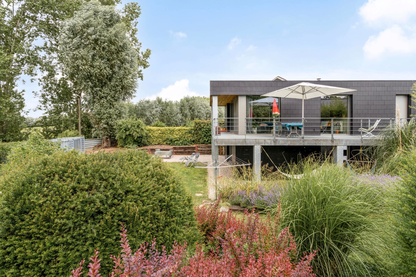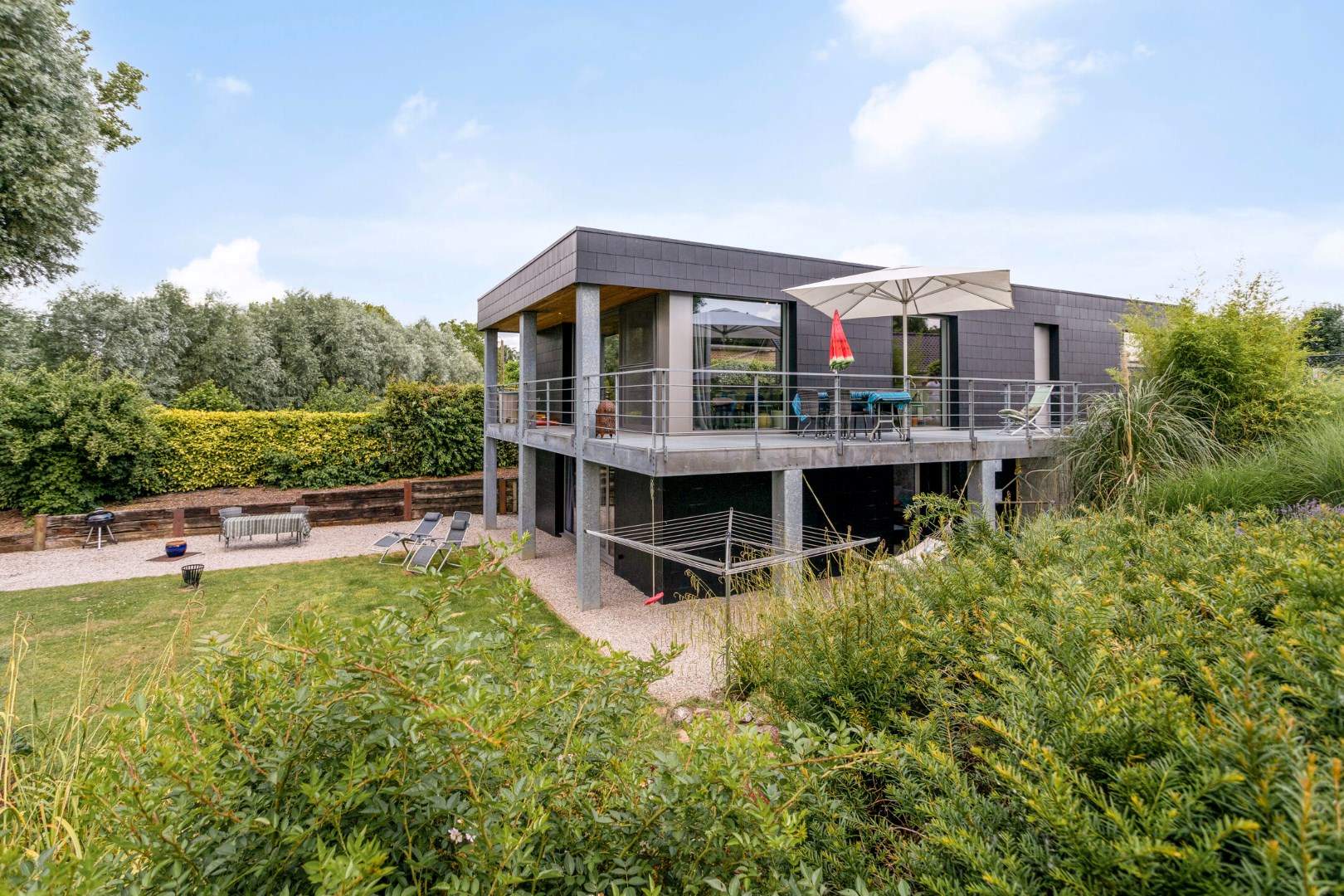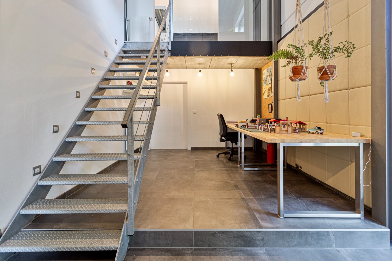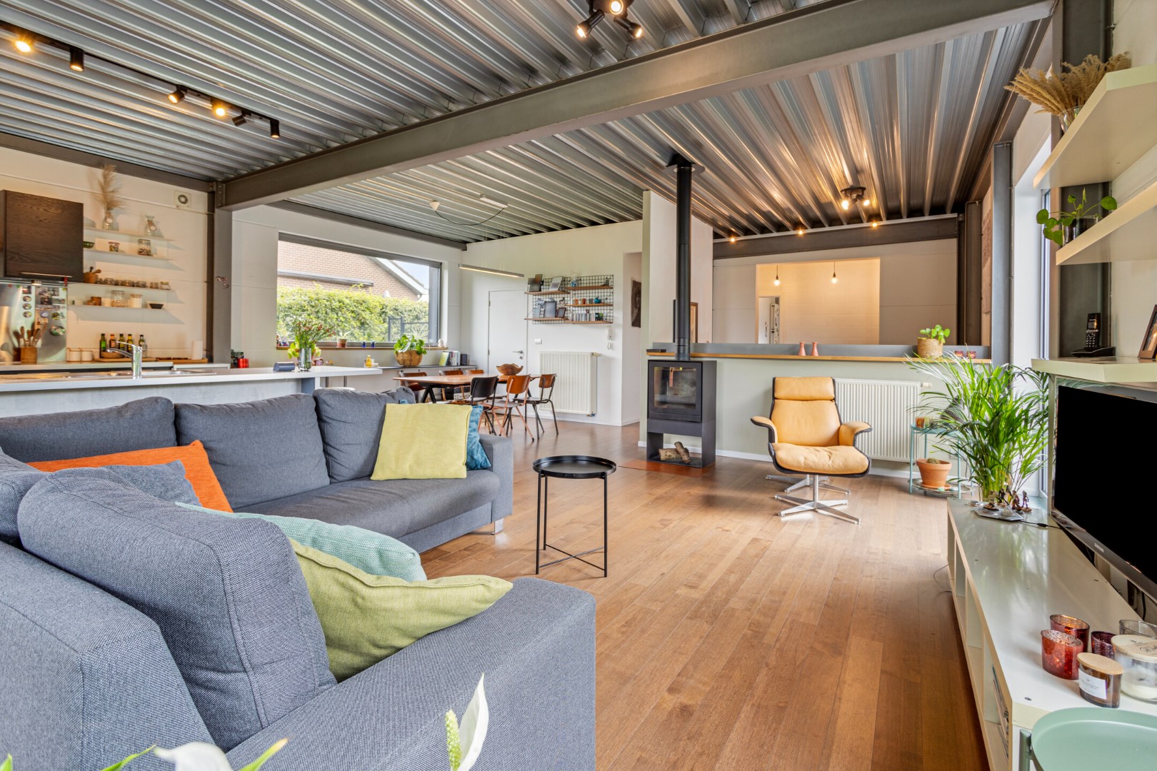 We parkeren de wagen op de ruime oprit of in de garage. De ingang van de woning bevindt zich langs de zijkant. Terwijl we naar de voordeur stappen, kunnen we al genieten van de glooiende tuin die uitkijkt over het groen. Binnengekomen valt meteen de industriële stijl en speciale opbouw van de woning op. Op de gelijkvloerse verdieping vinden we een grote, uiterst lichtrijke leefruimte met open keuken. Er is ook een berging, gastentoilet, garage en een eerste slaapkamer.