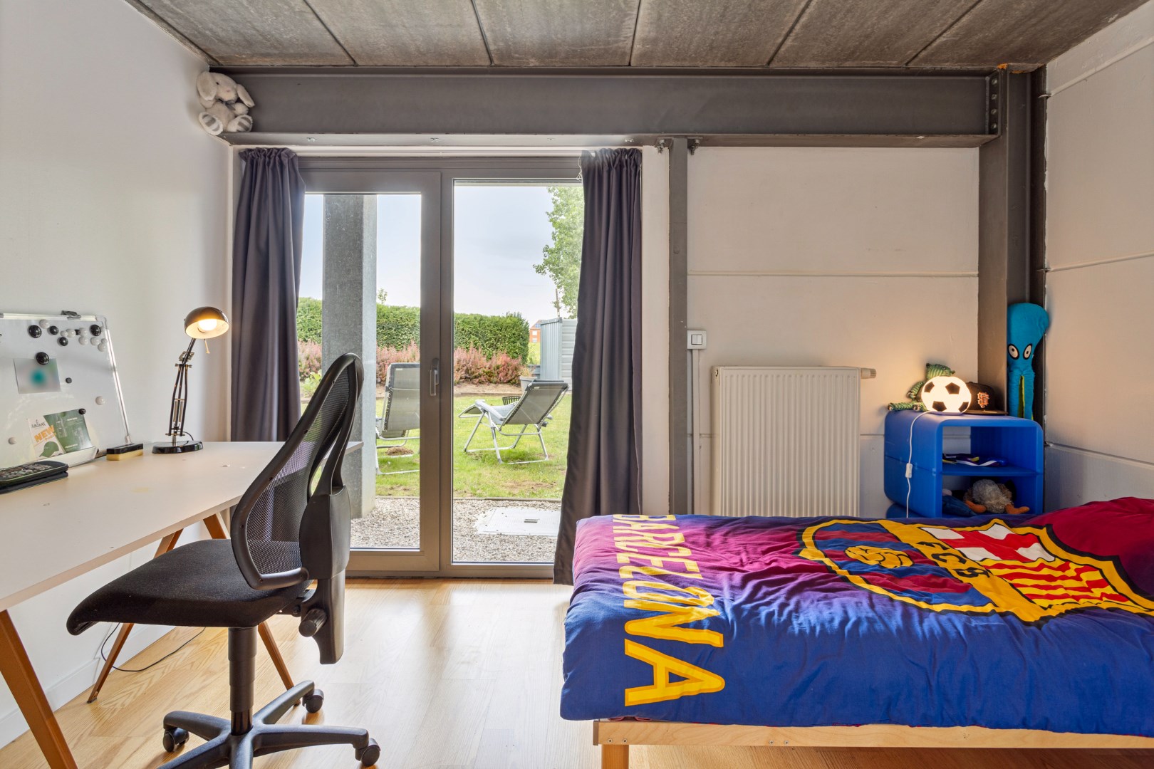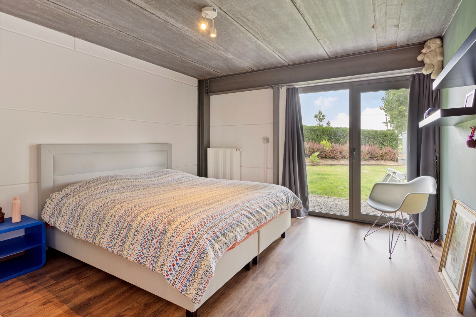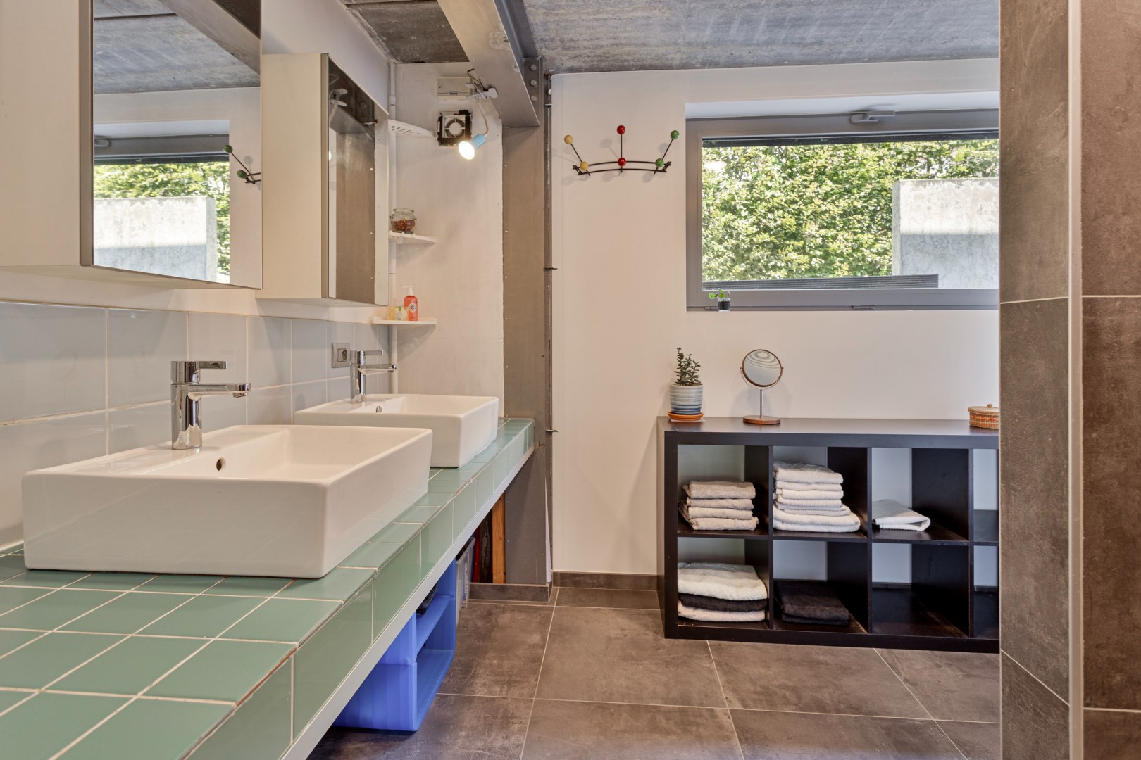 Via de vide heeft u ook contact met de benedenverdieping waar de slaapvertrekken, een buro/ontspanningsruimte, de badkamer en een berging zich bevinden. Via de metalen trap komen we er terecht. Beneden in de centrale vide is er plaats voor een buro. De vensterdeur geeft er tot de tuin en een gezellige buitenzithoek. Er zijn ook 3 ruime slaapkamers. De kamers langs de achterzijde hebben allemaal een raam waarlangs u rechtstreeks in de tuin kunt. Ook hier zorgt dit voor een heel ontspannend gevoel. In de badkamer zijn er 2 lavabo’s, een douche en het toilet. De grote wasberging zorgt ervoor dat wassen en drogen een plezier wordt.