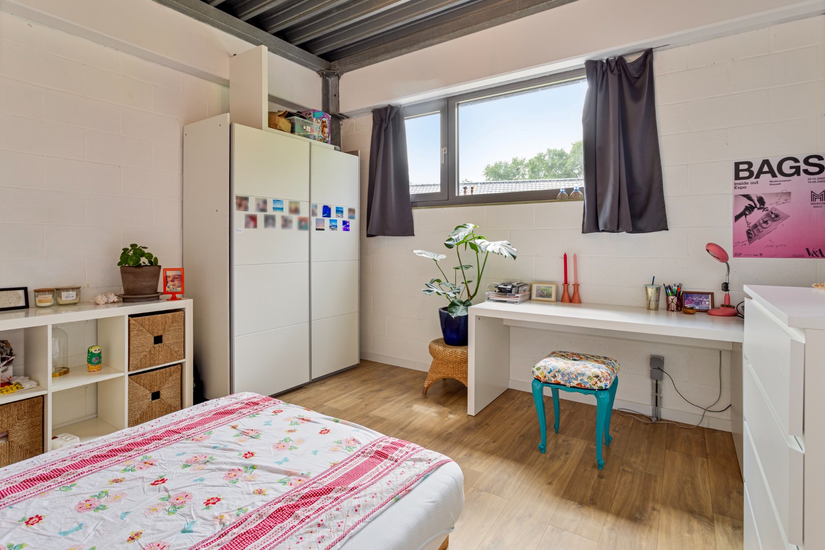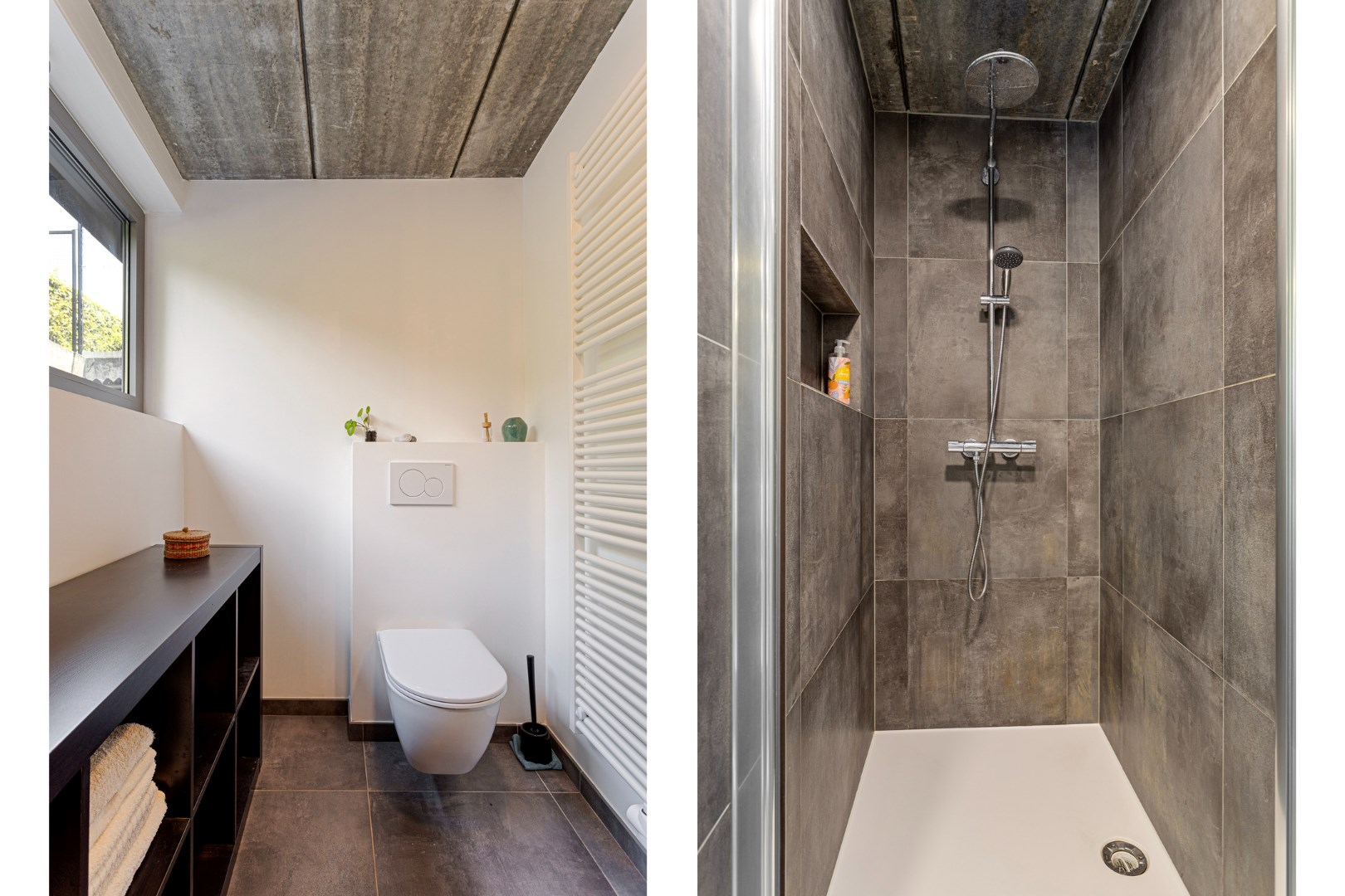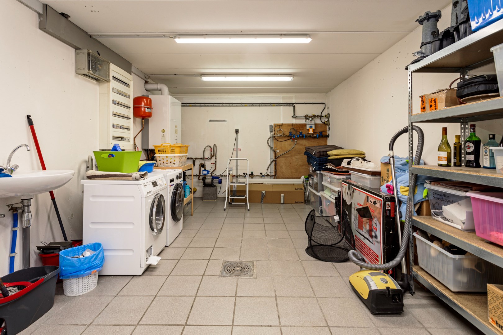 Via de vide heeft u ook contact met de benedenverdieping waar de slaapvertrekken, een buro/ontspanningsruimte, de badkamer en een berging zich bevinden. Via de metalen trap komen we er terecht. Beneden in de centrale vide is er plaats voor een buro. De vensterdeur geeft er tot de tuin en een gezellige buitenzithoek. Er zijn ook 3 ruime slaapkamers. De kamers langs de achterzijde hebben allemaal een raam waarlangs u rechtstreeks in de tuin kunt. Ook hier zorgt dit voor een heel ontspannend gevoel. In de badkamer zijn er 2 lavabo’s, een douche en het toilet. De grote wasberging zorgt ervoor dat wassen en drogen een plezier wordt.