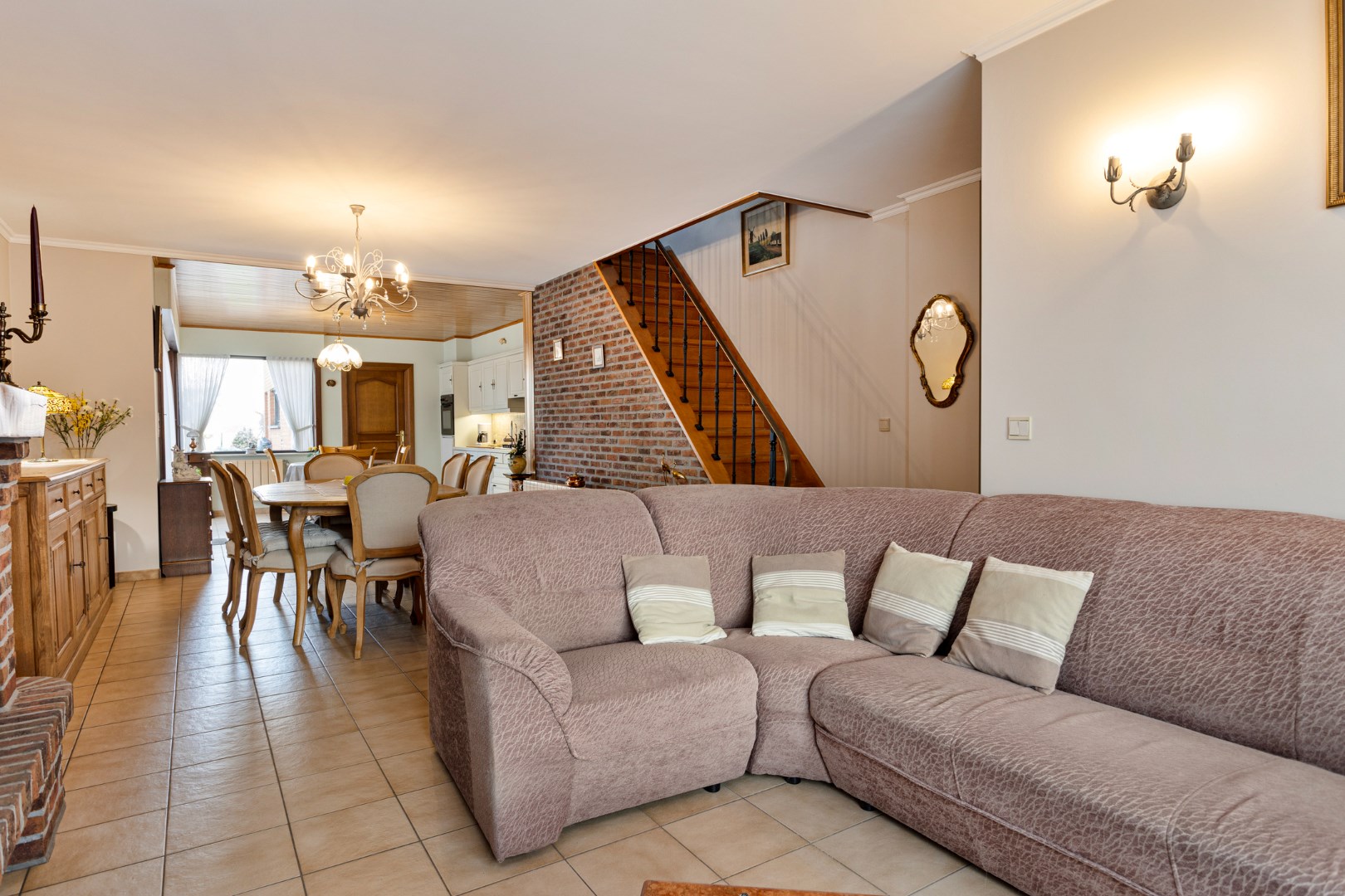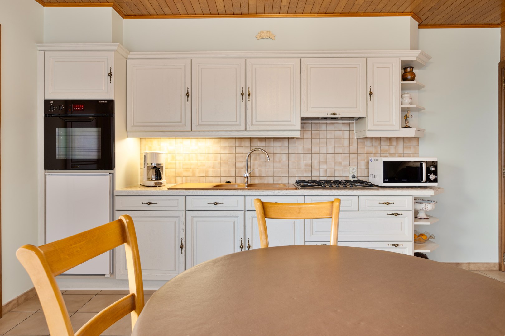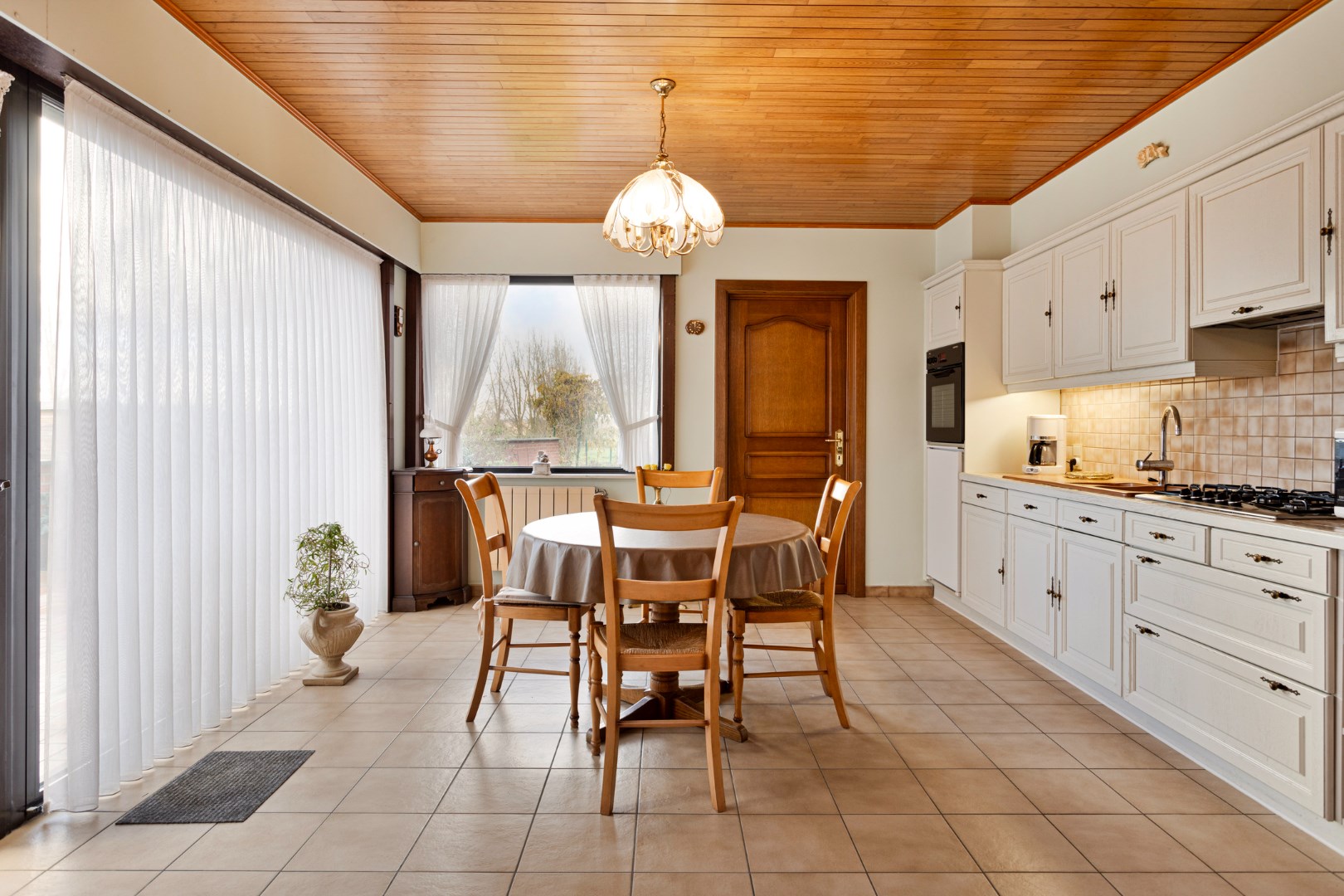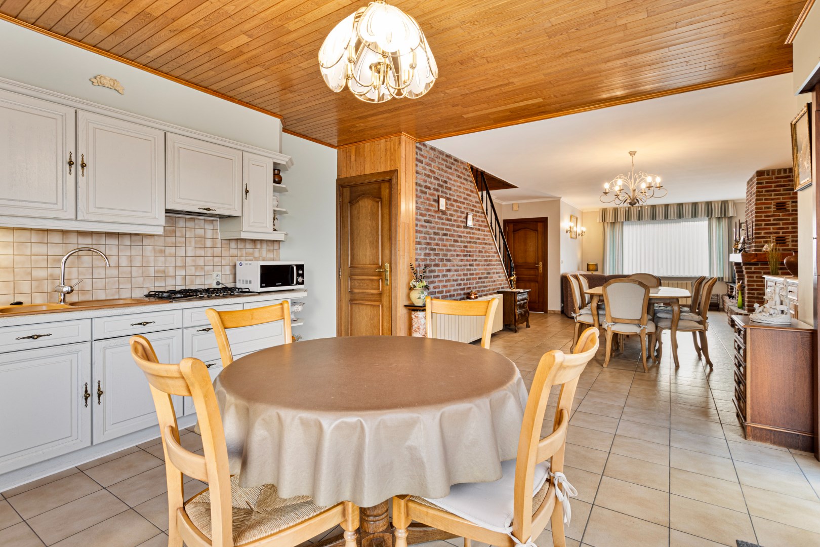 Via de inkomhal stappen we de ruime leefruimte binnen. Deze bestaat uit het salon, de eetkamer en de ruime, open keuken. De woonruimte is enorm lichtrijk en aangenaam. De houtcassette zorgt voor een extra gezellige toets. Achter de keuken bevindt zich de badkamer met lavabo, bad en apart toilet. Van hieruit hebben we ook toegang tot een grote berging waar plaats is voor een wasmachine, droogkast, …. Er is hier ook een deur naar de tuin.