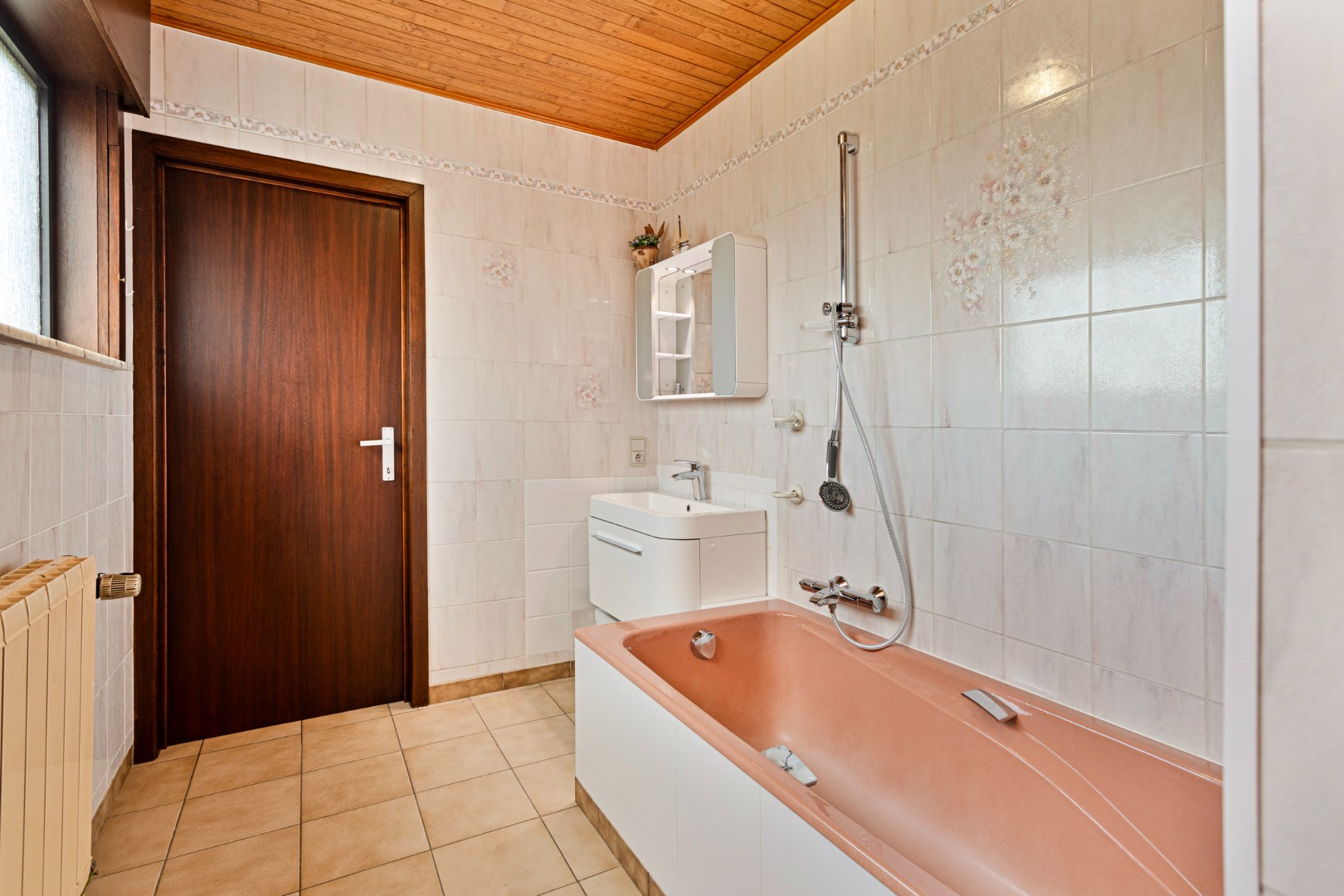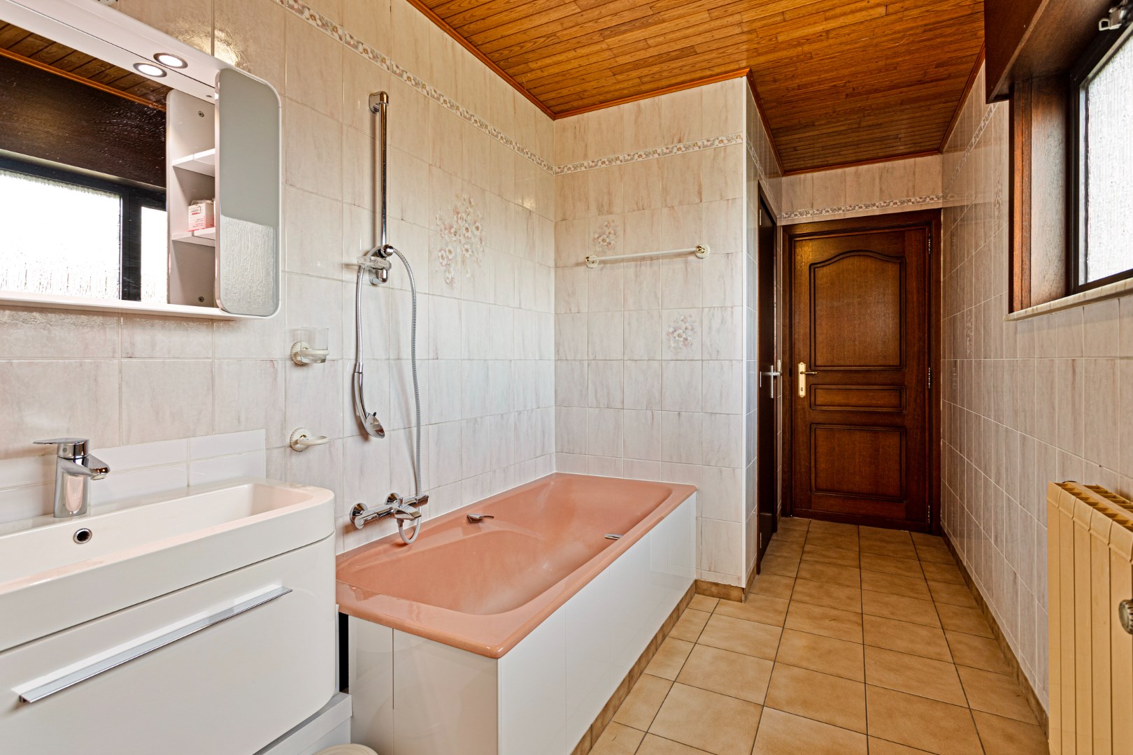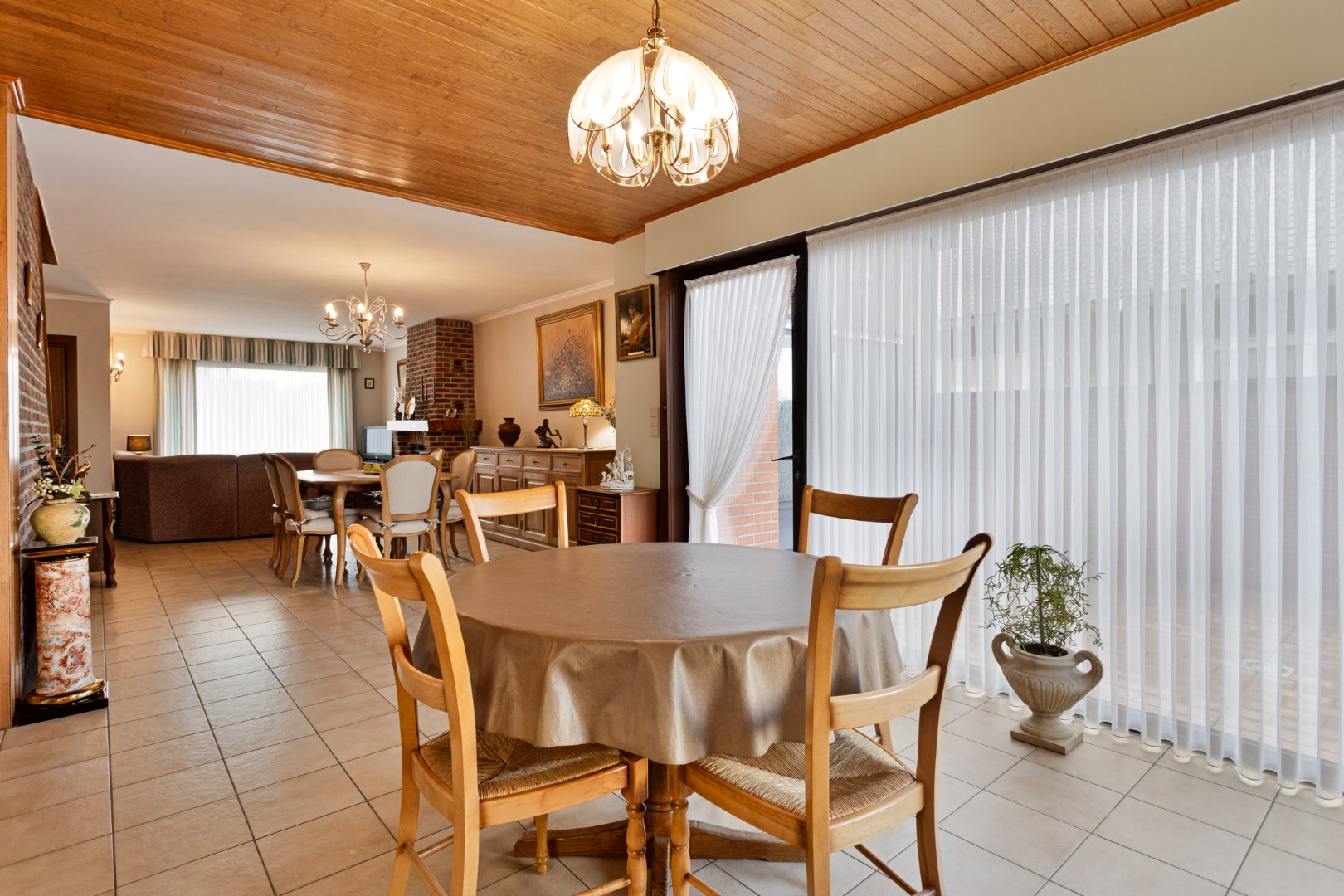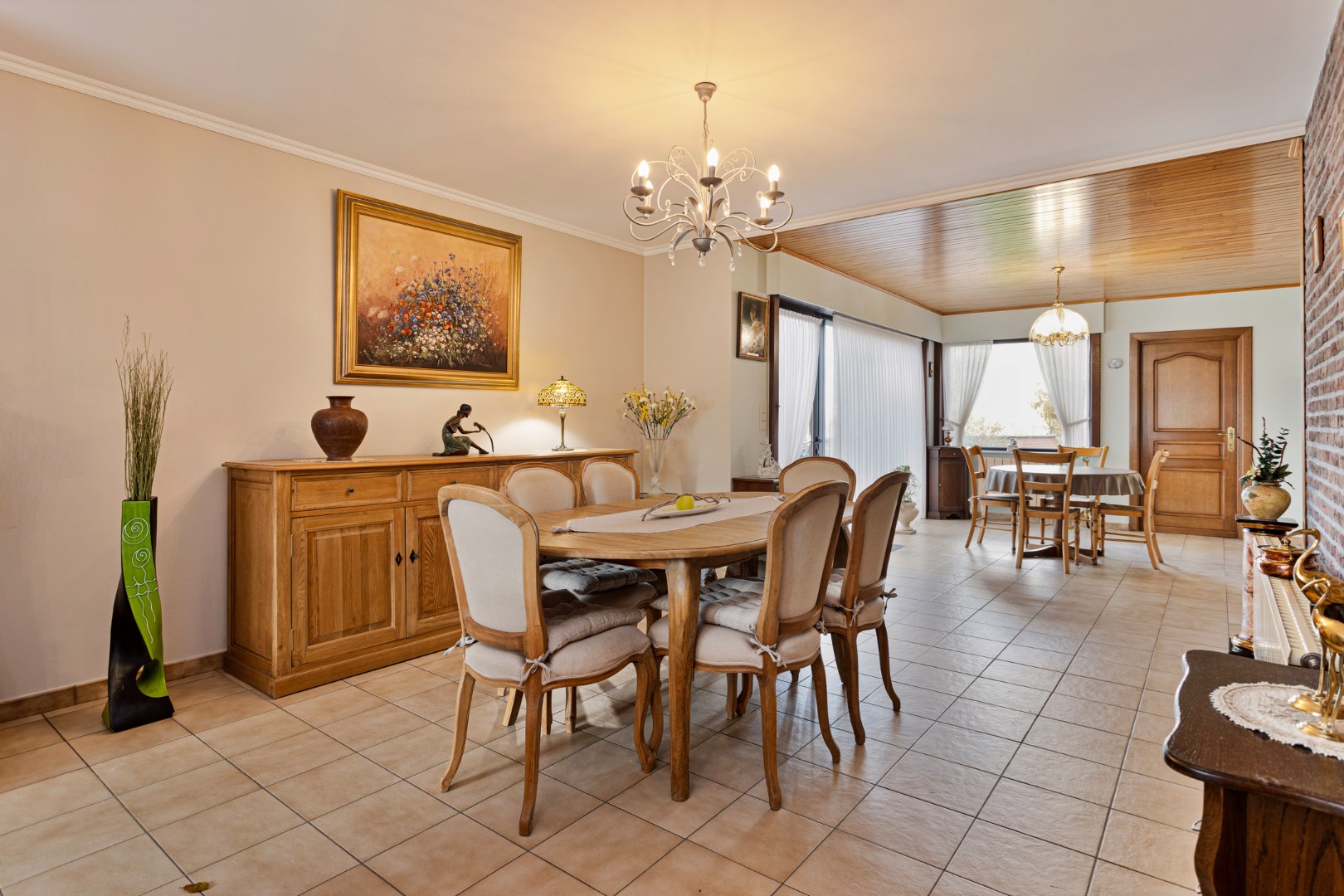 Via de inkomhal stappen we de ruime leefruimte binnen. Deze bestaat uit het salon, de eetkamer en de ruime, open keuken. De woonruimte is enorm lichtrijk en aangenaam. De houtcassette zorgt voor een extra gezellige toets. Achter de keuken bevindt zich de badkamer met lavabo, bad en apart toilet. Van hieruit hebben we ook toegang tot een grote berging waar plaats is voor een wasmachine, droogkast, …. Er is hier ook een deur naar de tuin.