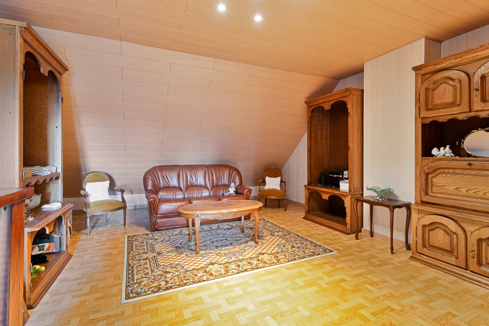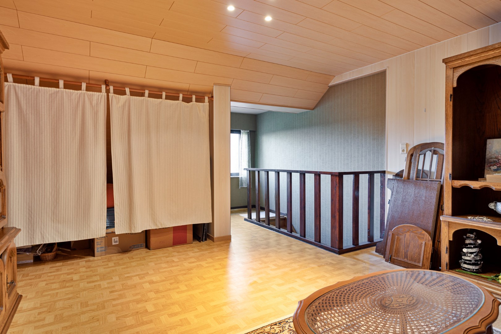 Op de bovenverdieping zijn er 2 ruime kamers. Via de vaste trap in de voorste kamer stappen we naar de zolderverdieping waar er nog een grote kamer is.